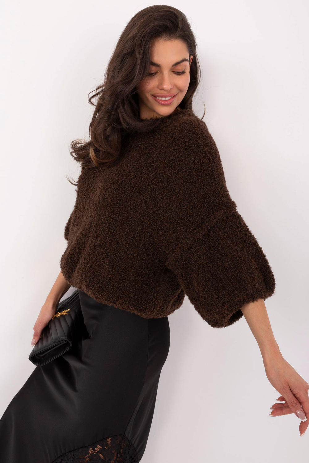 Megztinio matmenys vieno dydžio drabužyje, matuoti gulint: plotis po pažastimis - 62 cm, rankovės ilgis - 24 cm (nuo siūlės), plotis klubuose - 54 cm, bendras ilgis - 55 cm.