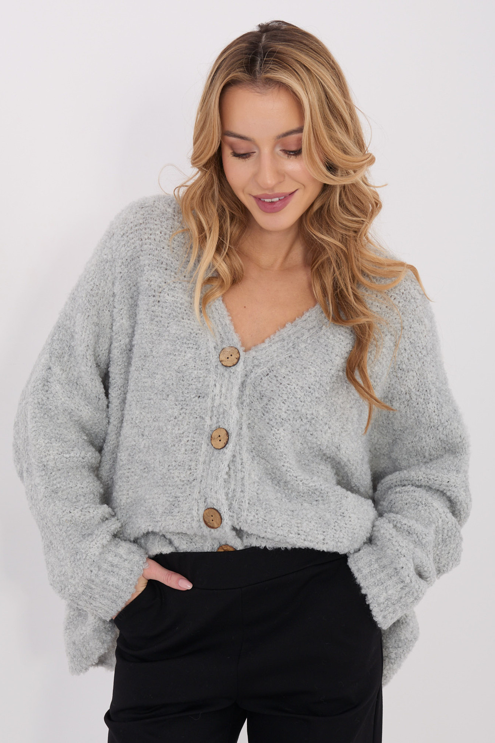 Modelis dėvi vieno dydžio drabužį. Modelio matmenys: ūgis 169 cm, krūtinė 88 cm, liemuo 68 cm, klubai 89 cm  .