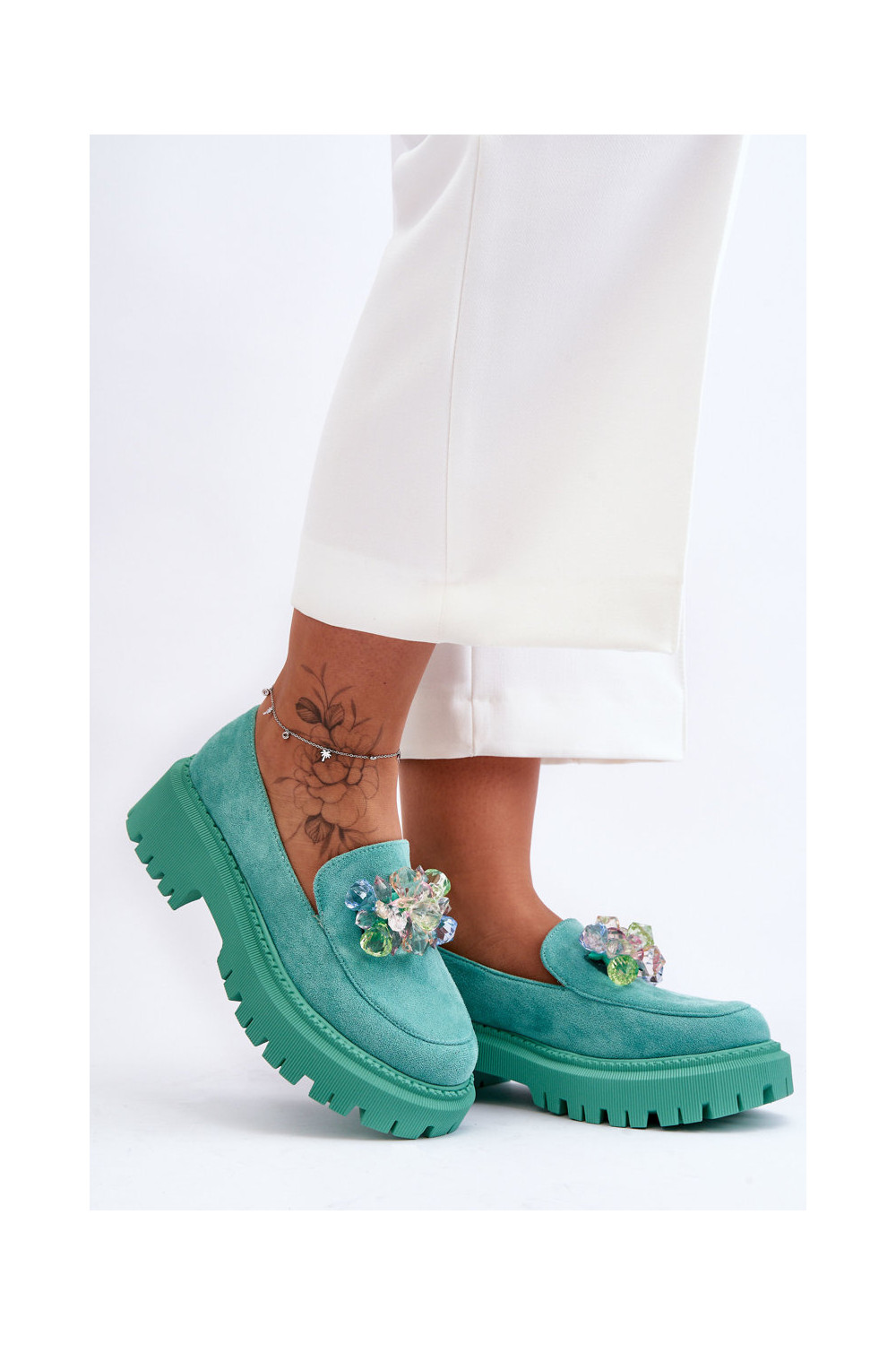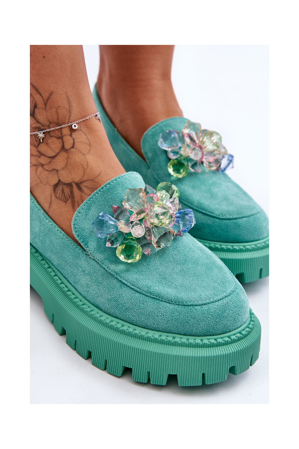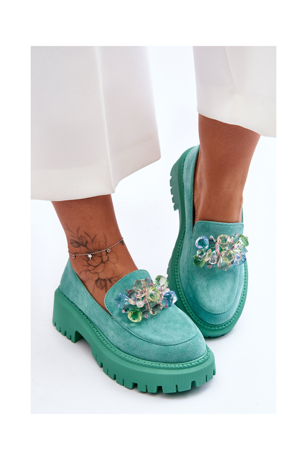 Moteriški mokasinai su dirbtiniais kristalais žalios spalvos Avril