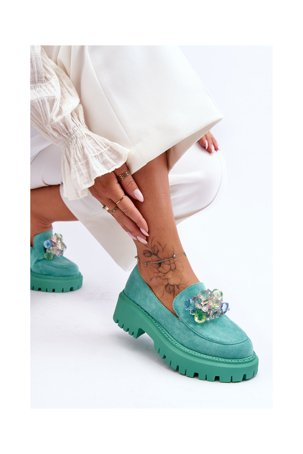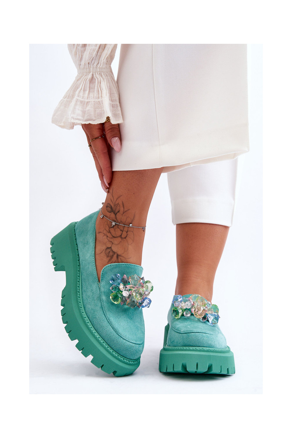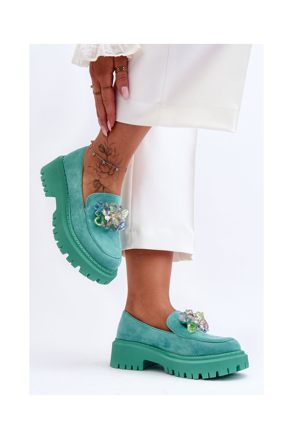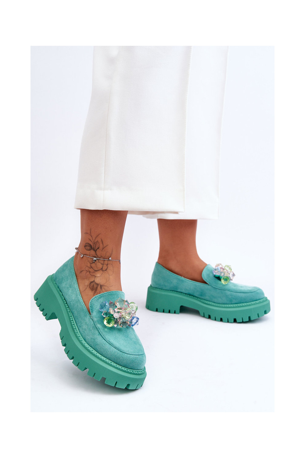 Moteriški mokasinai su dirbtiniais kristalais žalios spalvos Avril