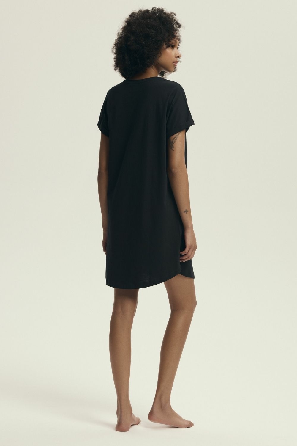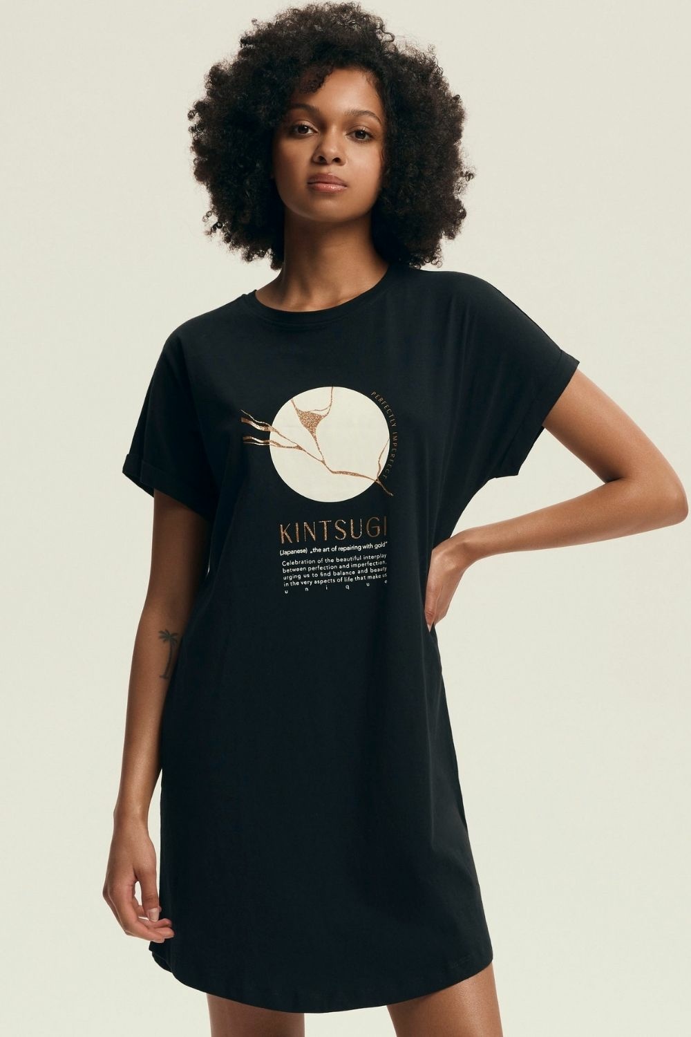 Women's nightshirt with a loose, comfortable cut, providing full freedom of movement and comfort during sleep. Made of soft, breathable Medžiaga:, it will work perfectly all year round. A with a U-neckline and short sleeves looks feminine and subtle. The nightshirt is knee-length, with a decorative print on the front and a semi-circular hem, which gives the whole a lightness and delicate look. Packed in a practical plastic bag, it is an ideal proposition for women who appreciate simplicity, comfort, and style.