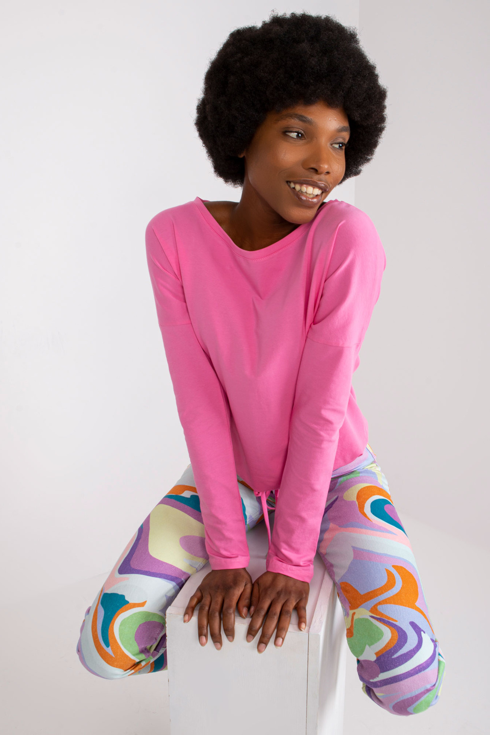 Modelis dėvi S dydį. Modelio matmenys: aukštis 168 cm, krūtinė 89 cm, juosmuo 60 cm, klubai 91 cm.