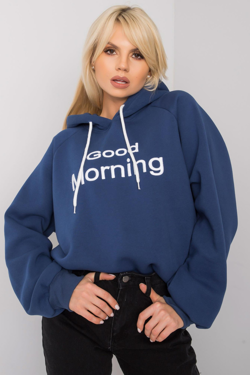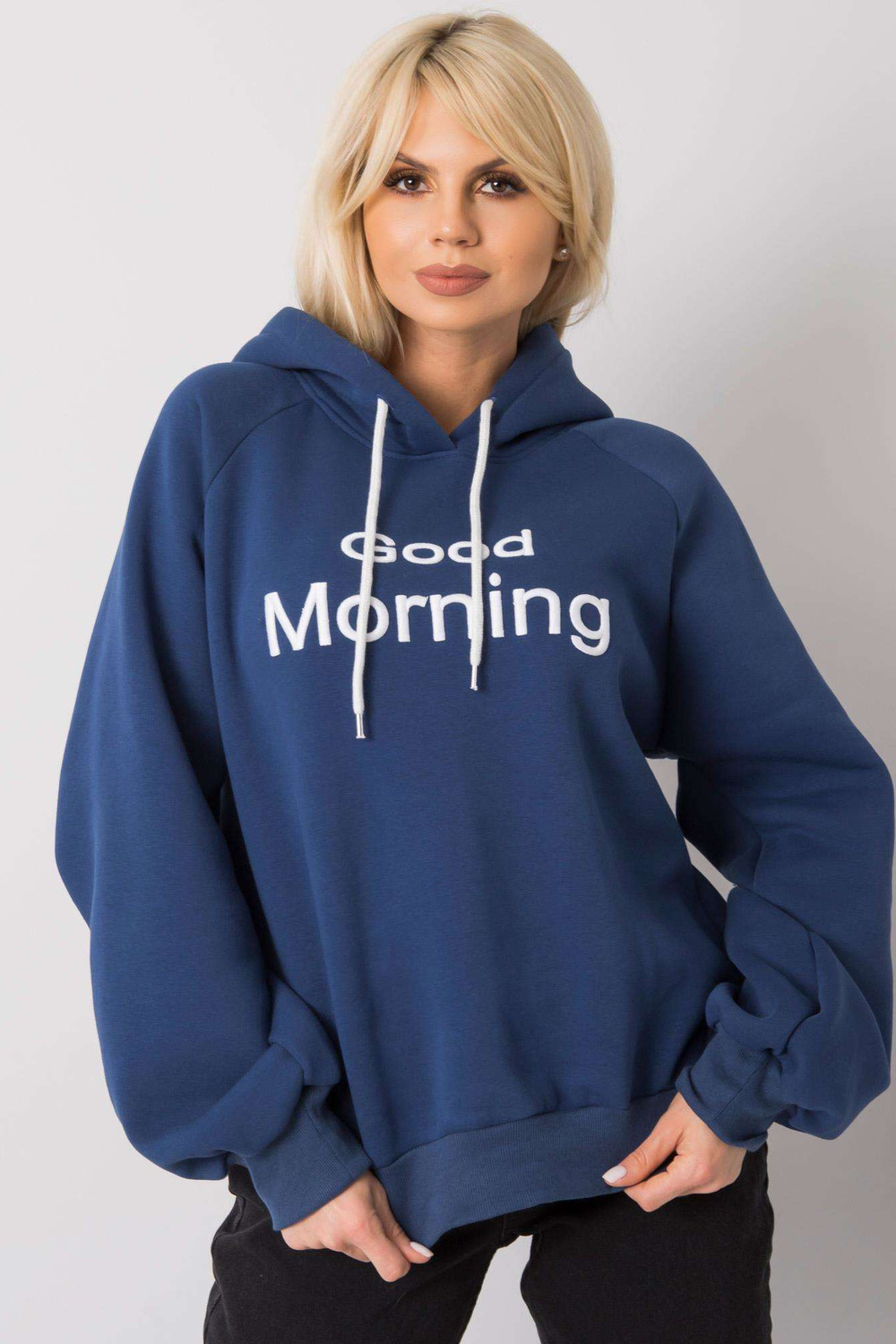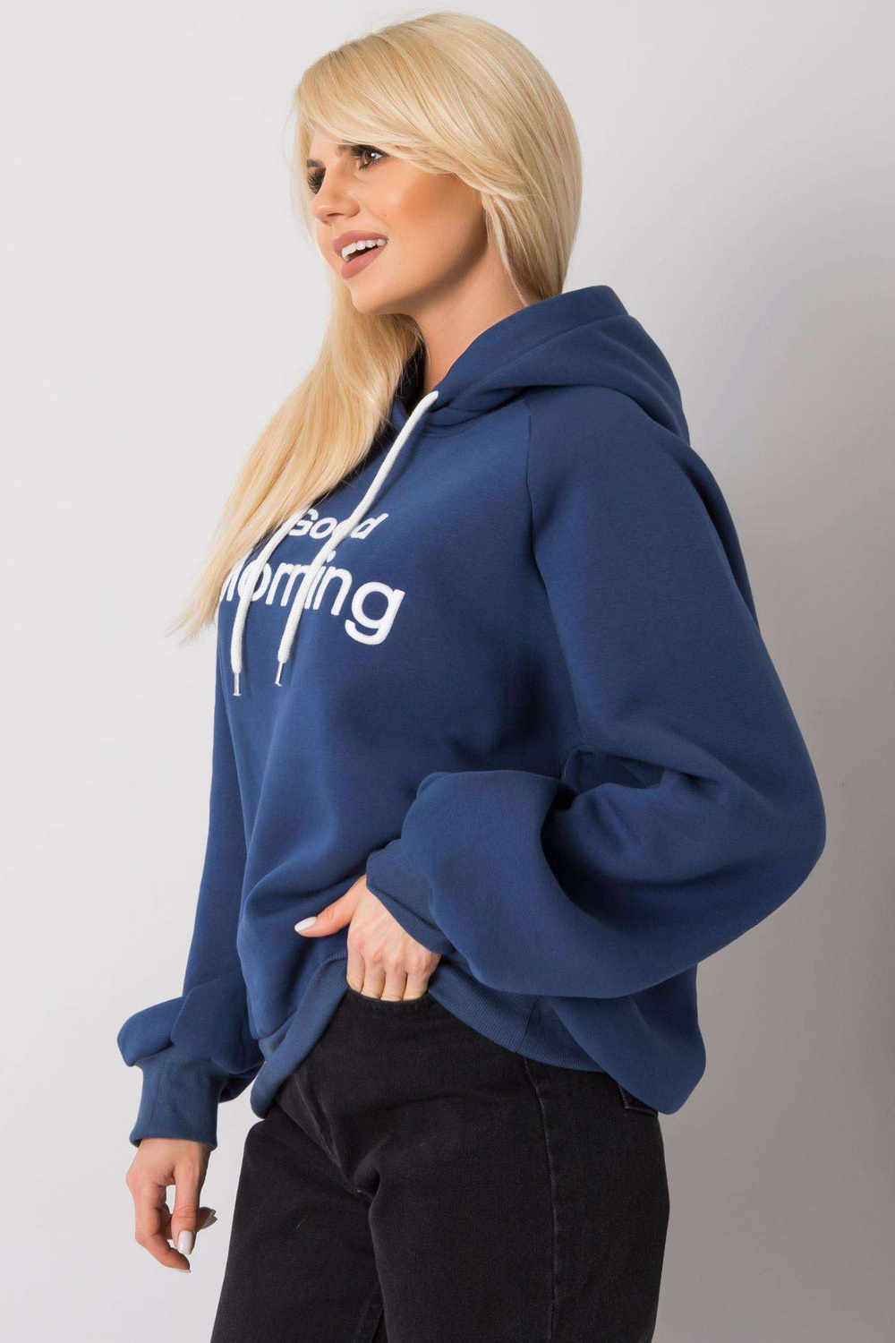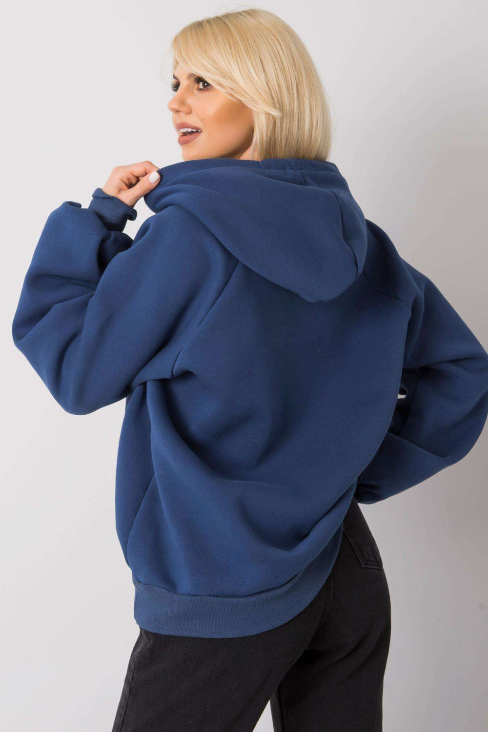 Tamsiai mėlynas per didelis megztinis su Alisos gobtuvu.