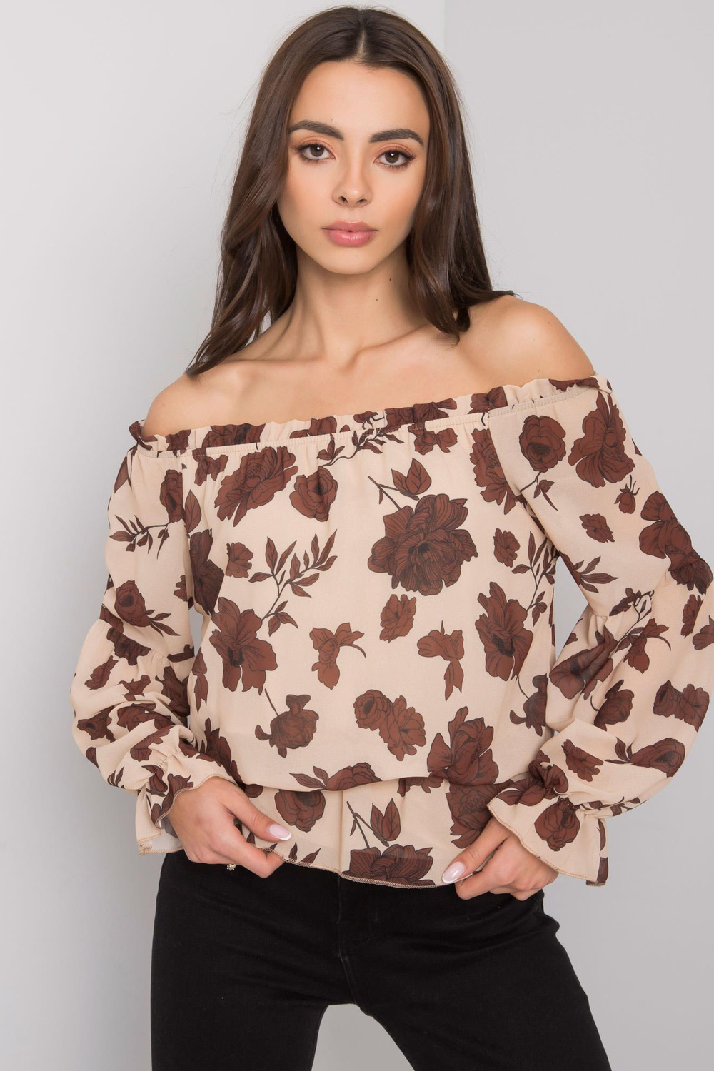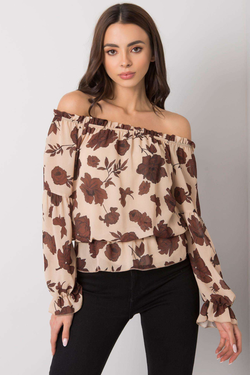 Smėlio ir rudos spalvos ispaniška palaidinė su gėlėmis Orléans. medžiagos sudėtis: 95% poliesteris, 5% elastanas. Skalbimo būdas: skalbimas skalbimo mašinoje 30°C. Modelis dėvi 1 dydžio 1 dydį. Modelio matmenys: aukštis 175 cm, krūtinė 84 cm, juosmuo 61 cm, klubai 91 cm. Matmenys