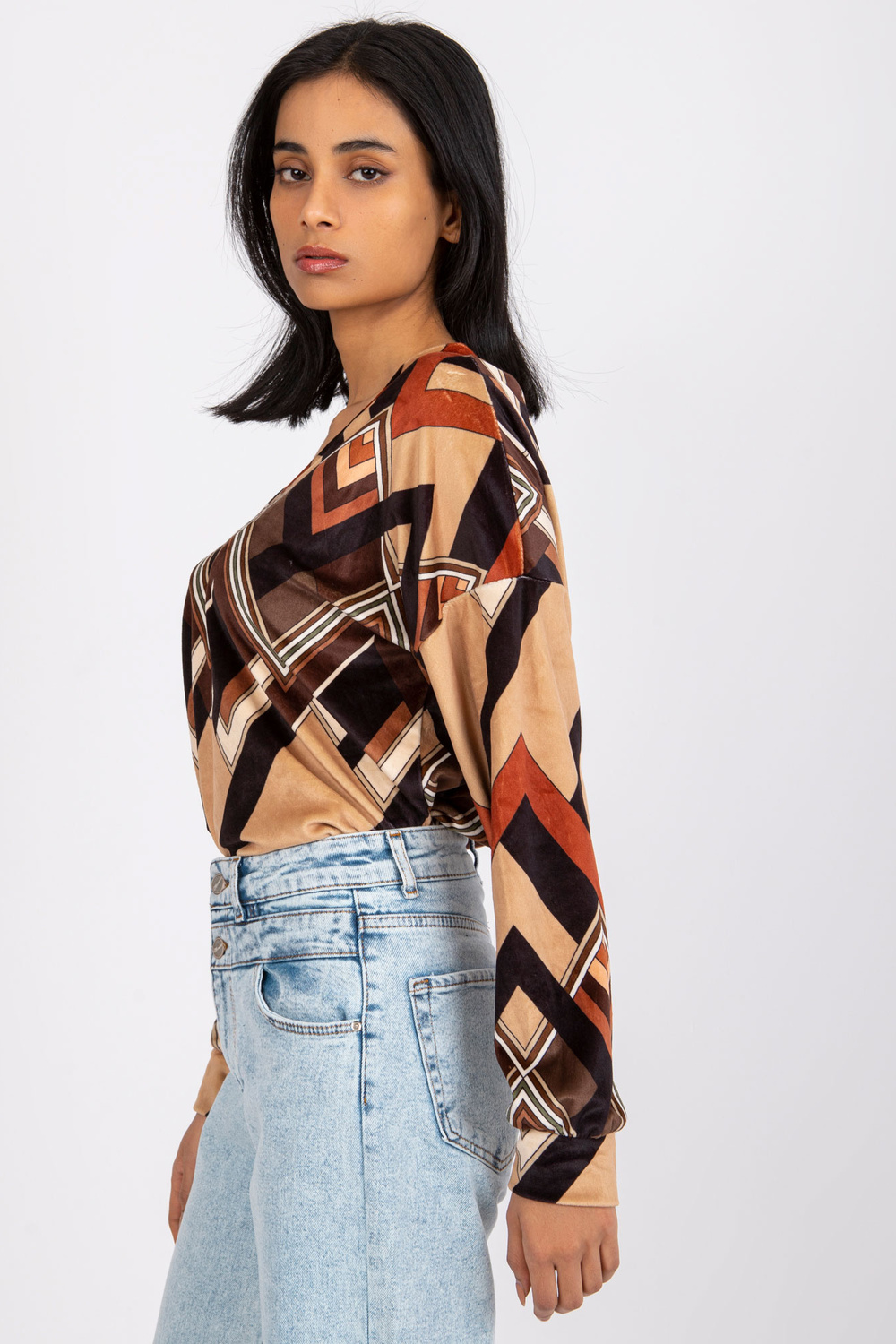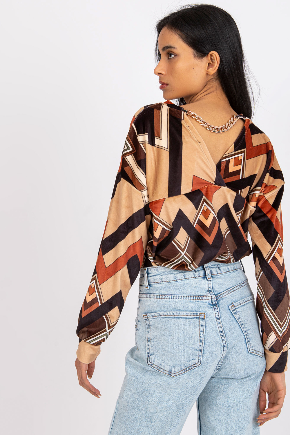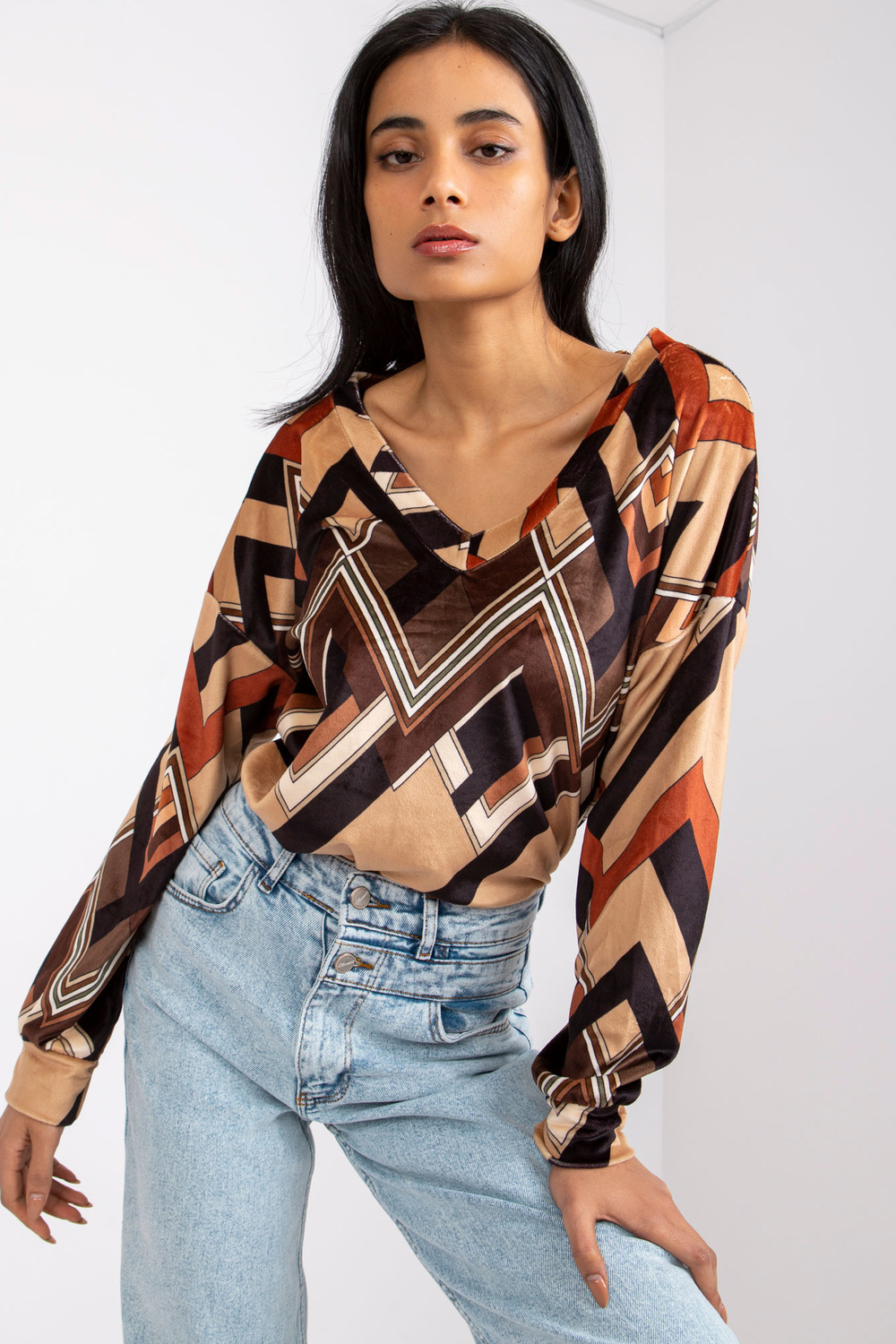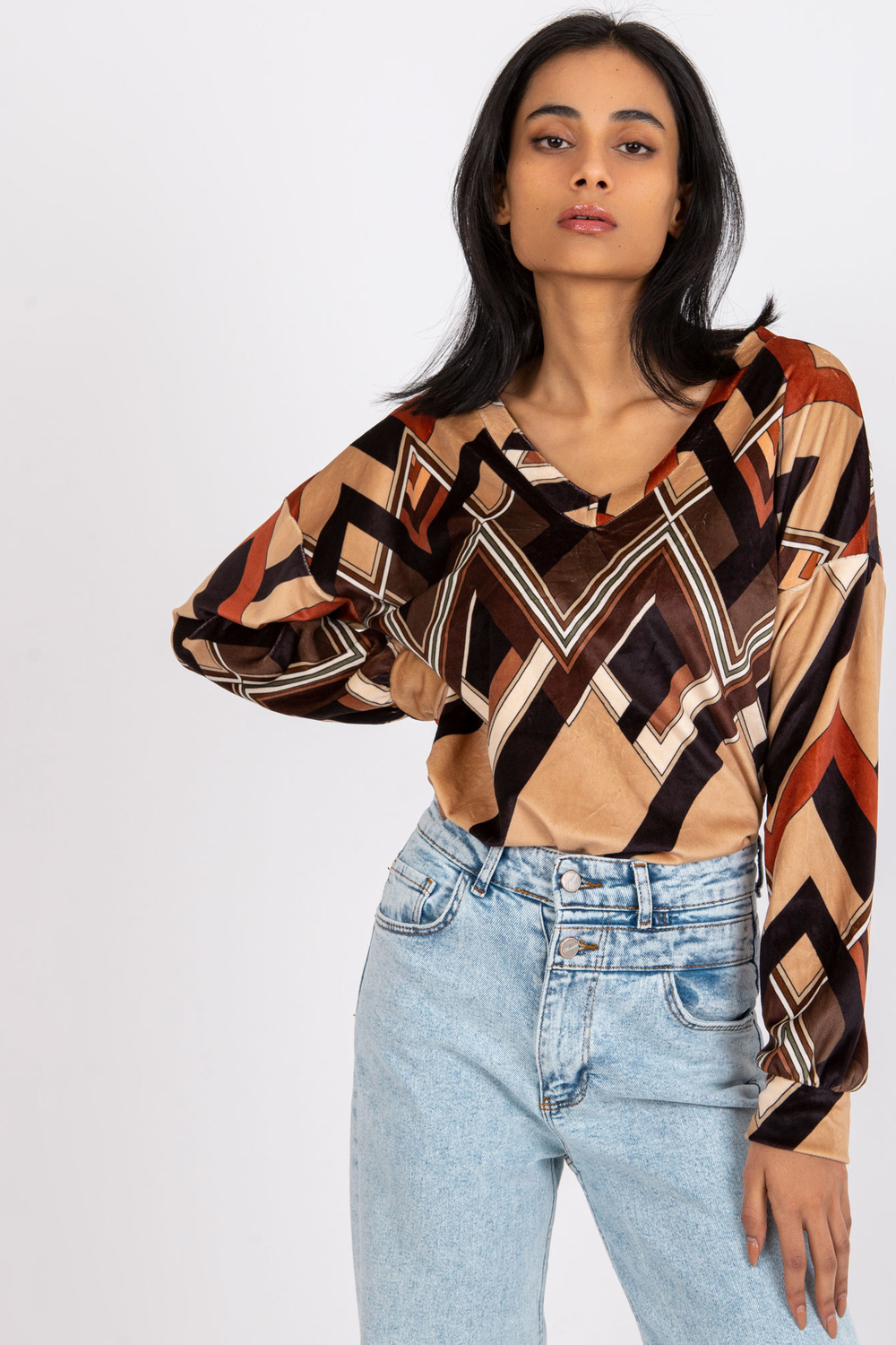 Ruda ir smėlio spalvos palaidinė su Emma raštais .