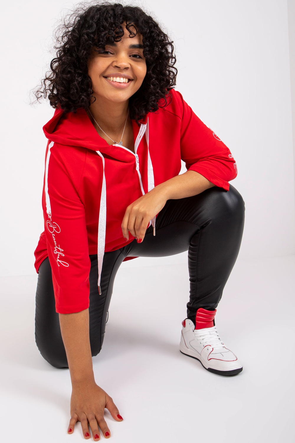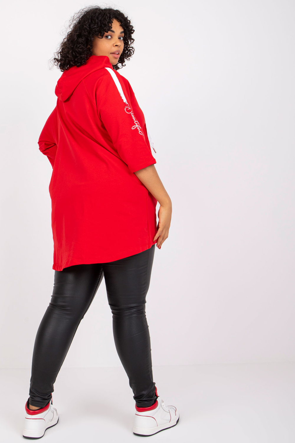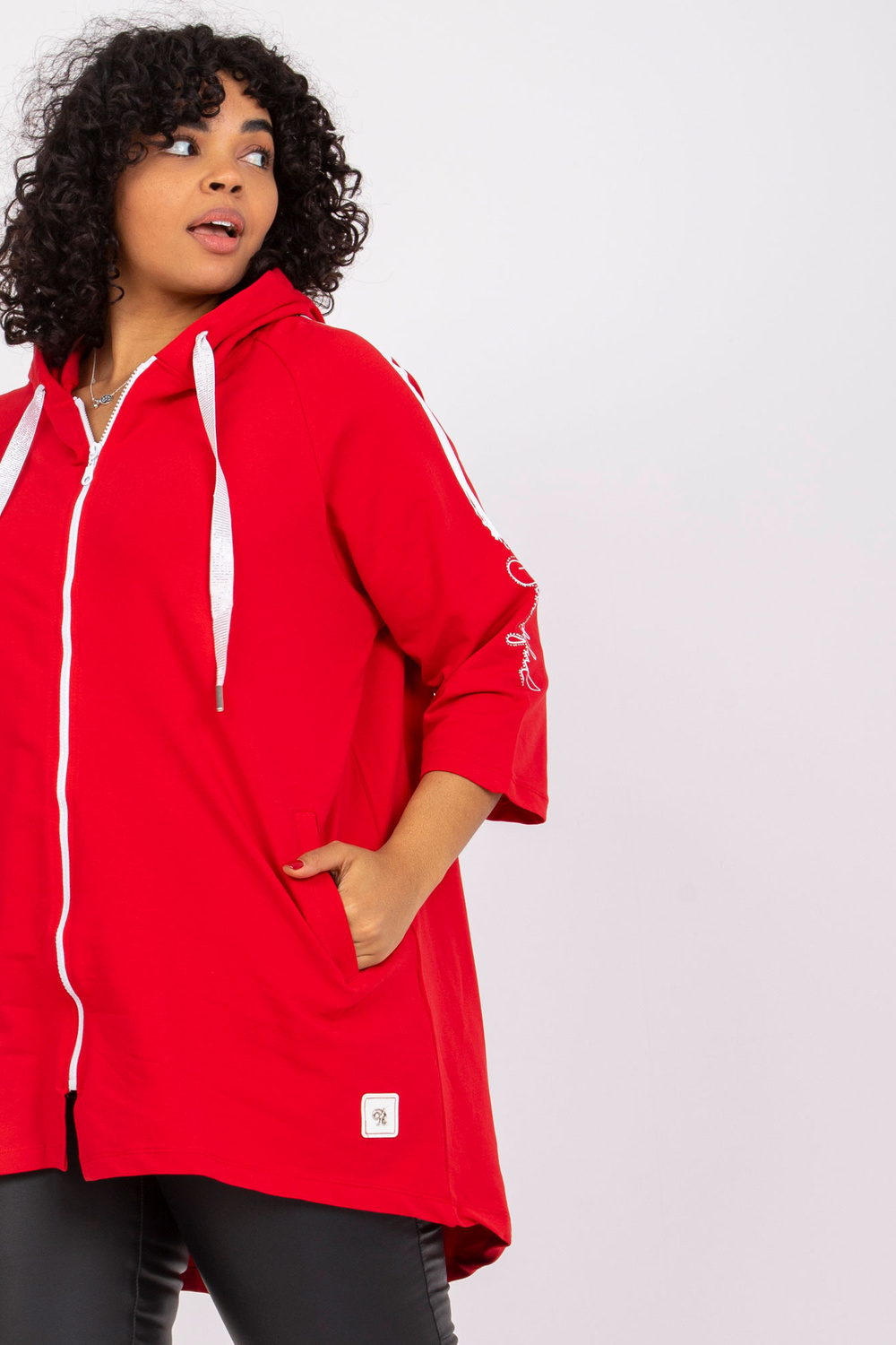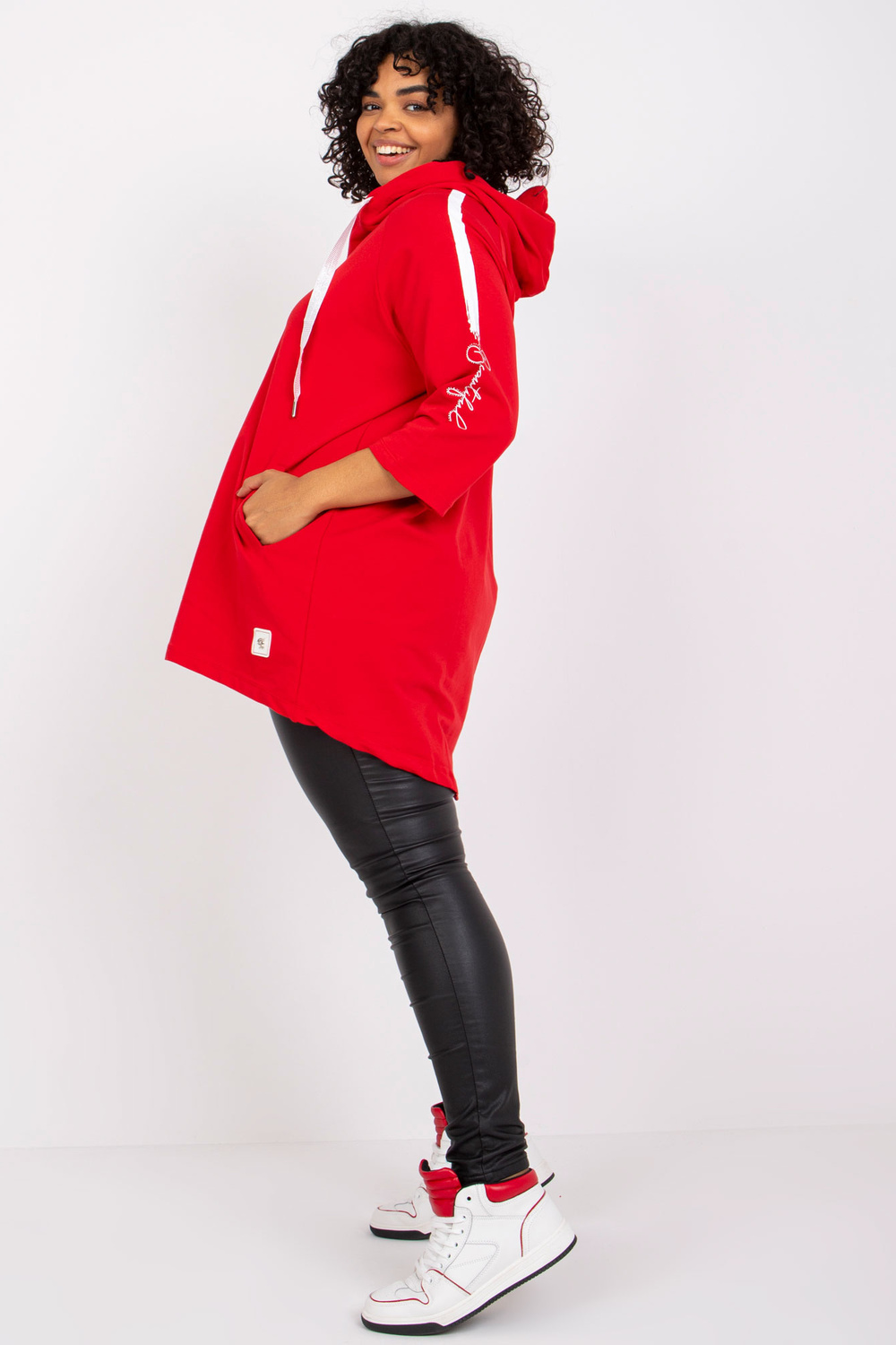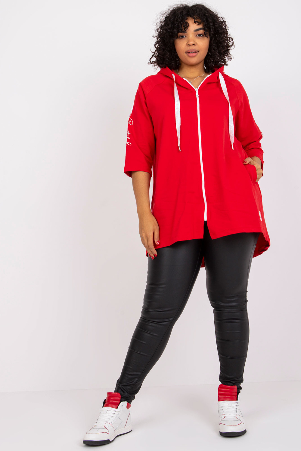 Vieno dydžio megztinio matmenys matuojami plokščiai: plotis po pažastimis - 64 cm, bendras ilgis: priekyje - 80 cm, gale - 87 cm, rankovių ilgis - 42 cm .