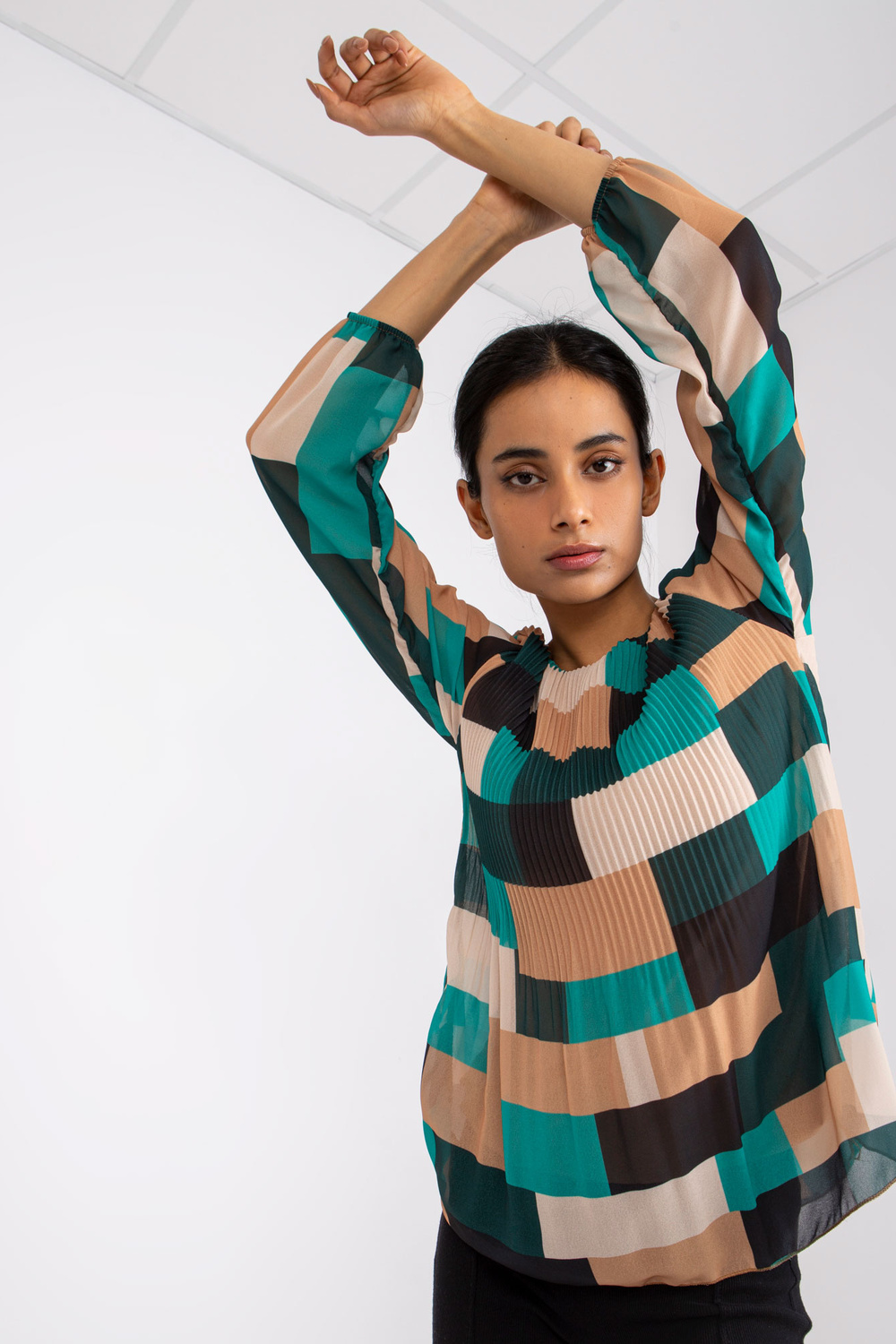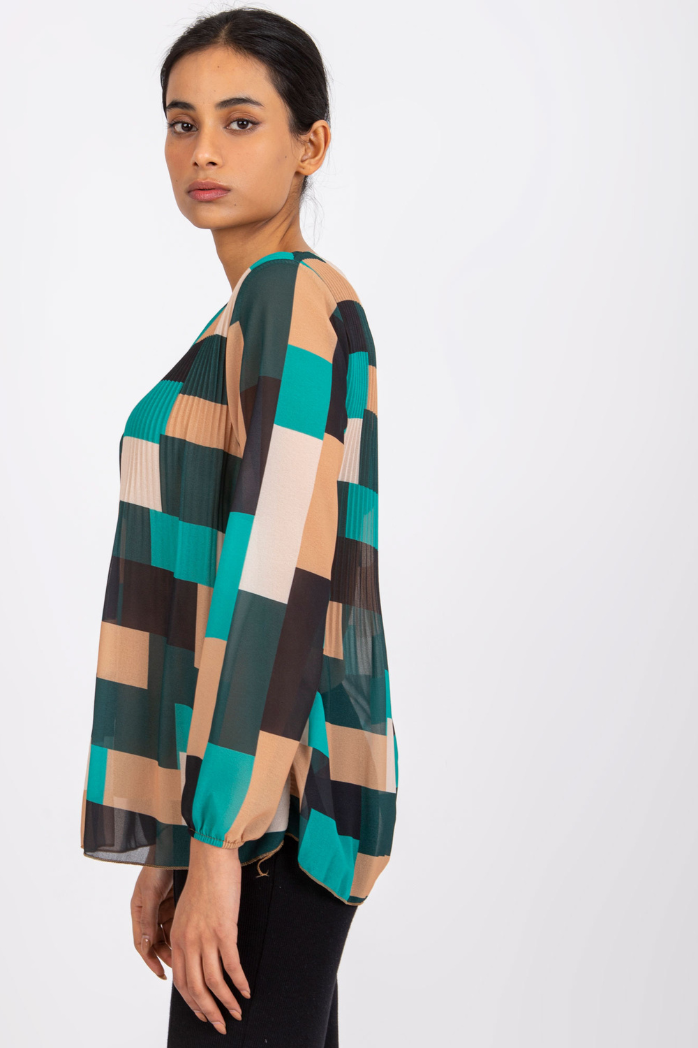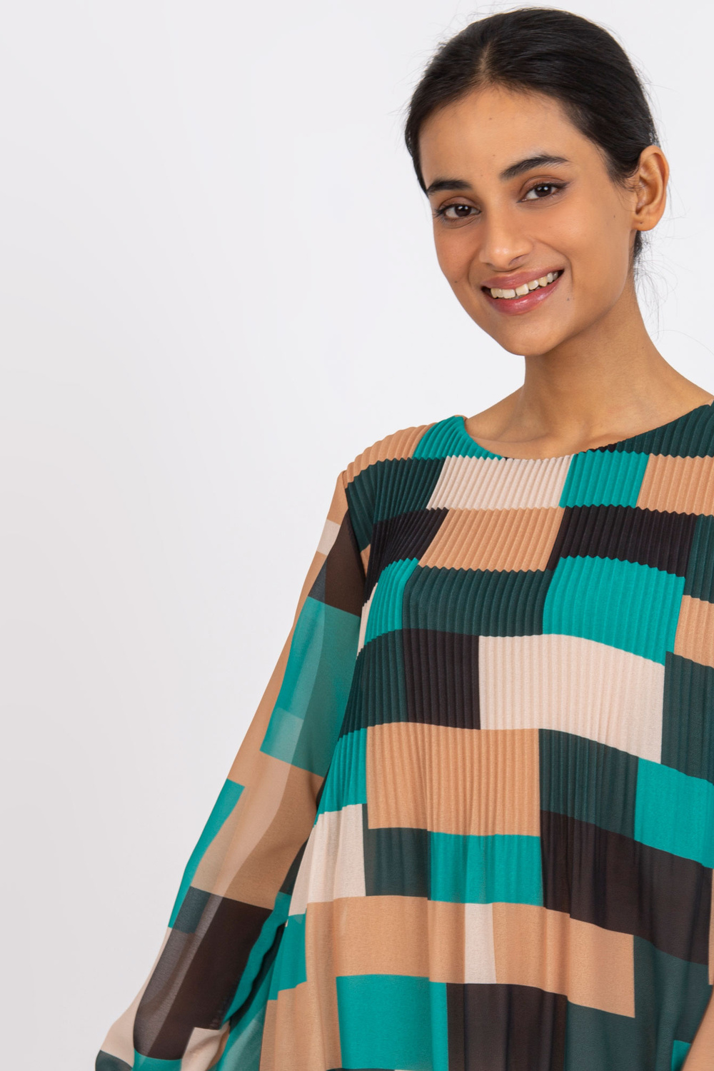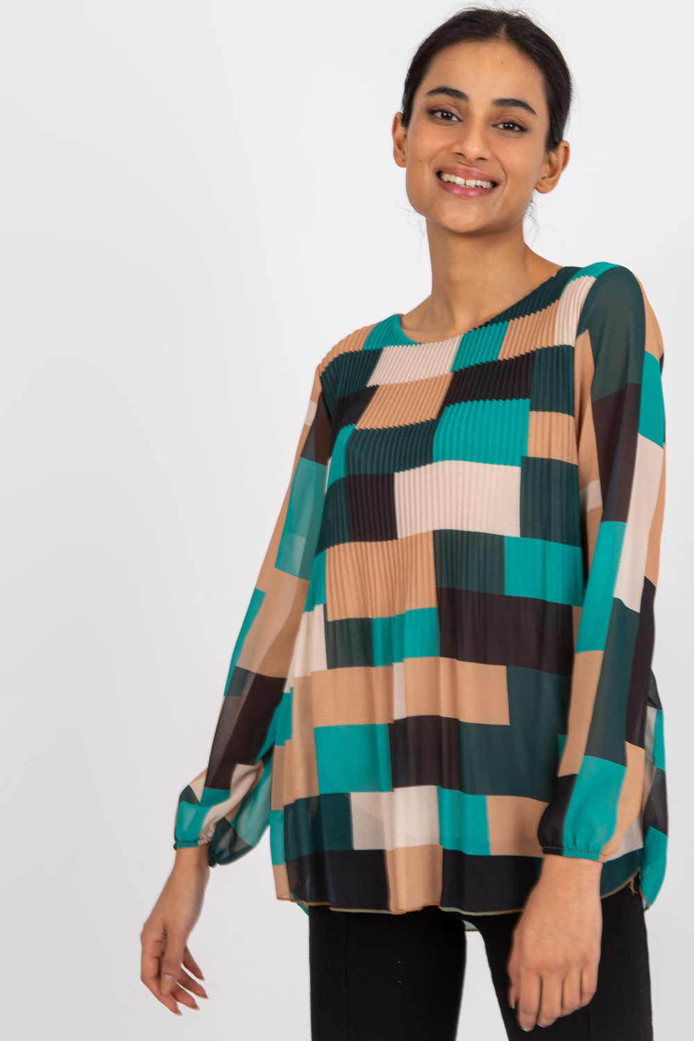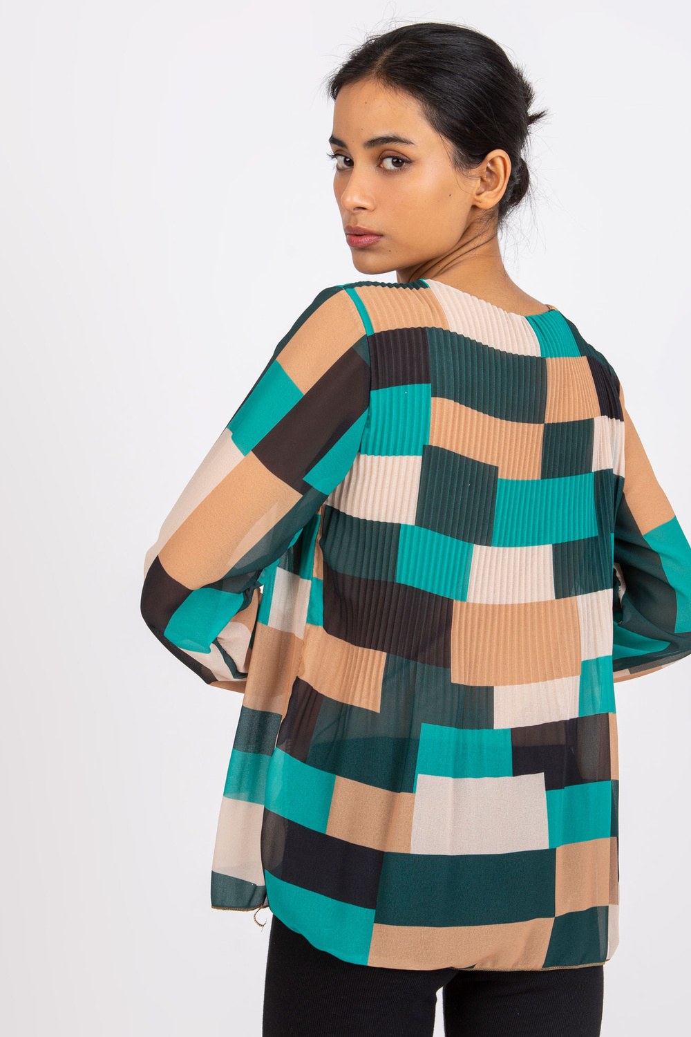 Žalia smėlio spalvos palaidinė Gabriella . medžiagos sudėtis: 50% poliesteris, 45% viskozė, 5% elastanas skalbimo būdas: skalbimas mašinoje 30°C Gaminio kodas: DHJ-BZ-8643.38P dominuojantis raštas: geometrinis Stilius: laisvalaikio galimybė: kasdienis, miestui, darbui