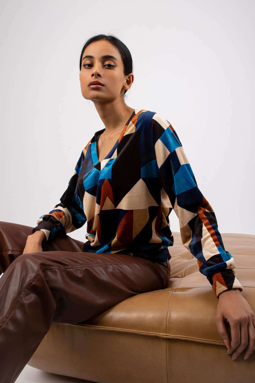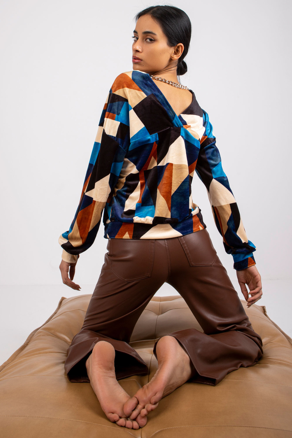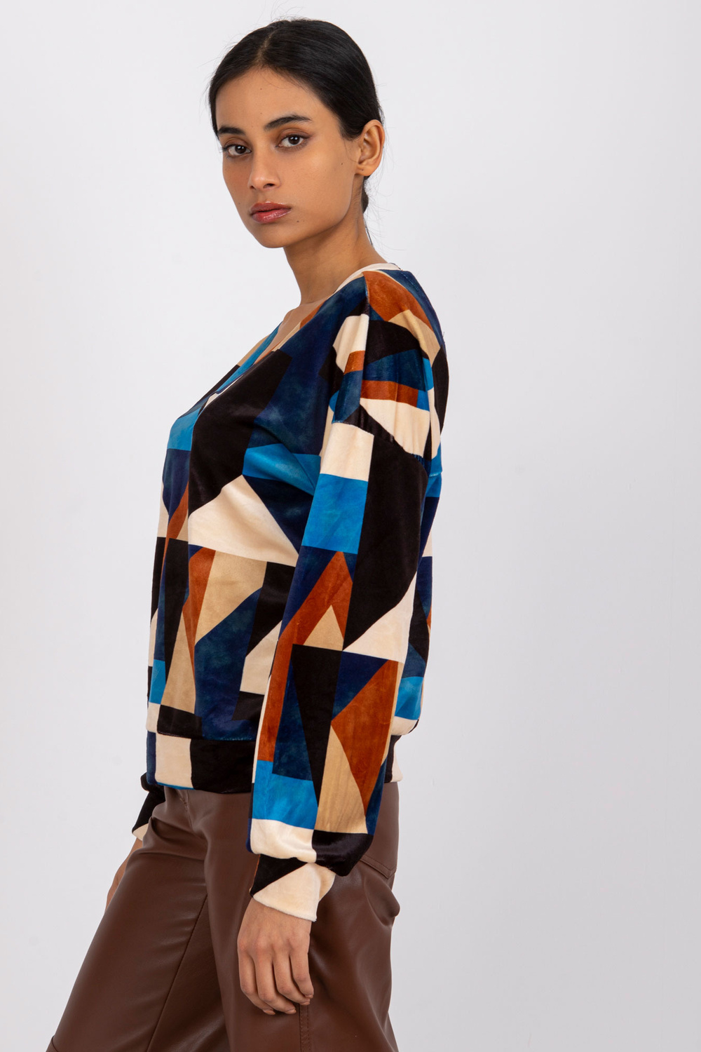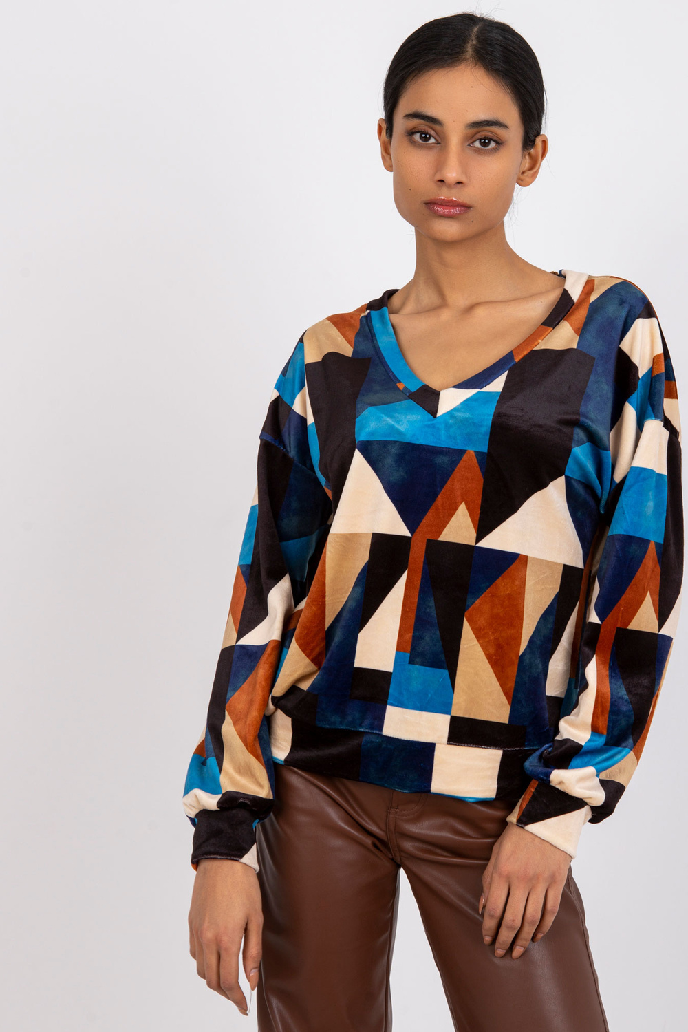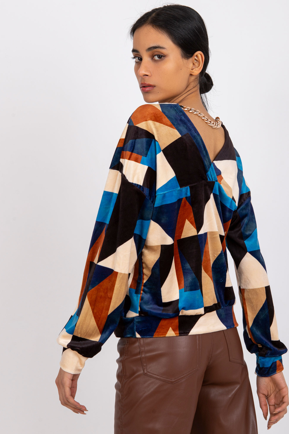 Mėlynai rudos spalvos palaidinė iš veliūro Liliana . medžiagos sudėtis: 95% poliesteris, 5% elastanas skalbimo būdas: skalbimas mašinoje 30°C Gaminio kodas: DHJ-BZ-6550.74P dominuojantis raštas: geometrinis Stilius: laisvalaikio galimybė: kasdienis, miestui, darbui