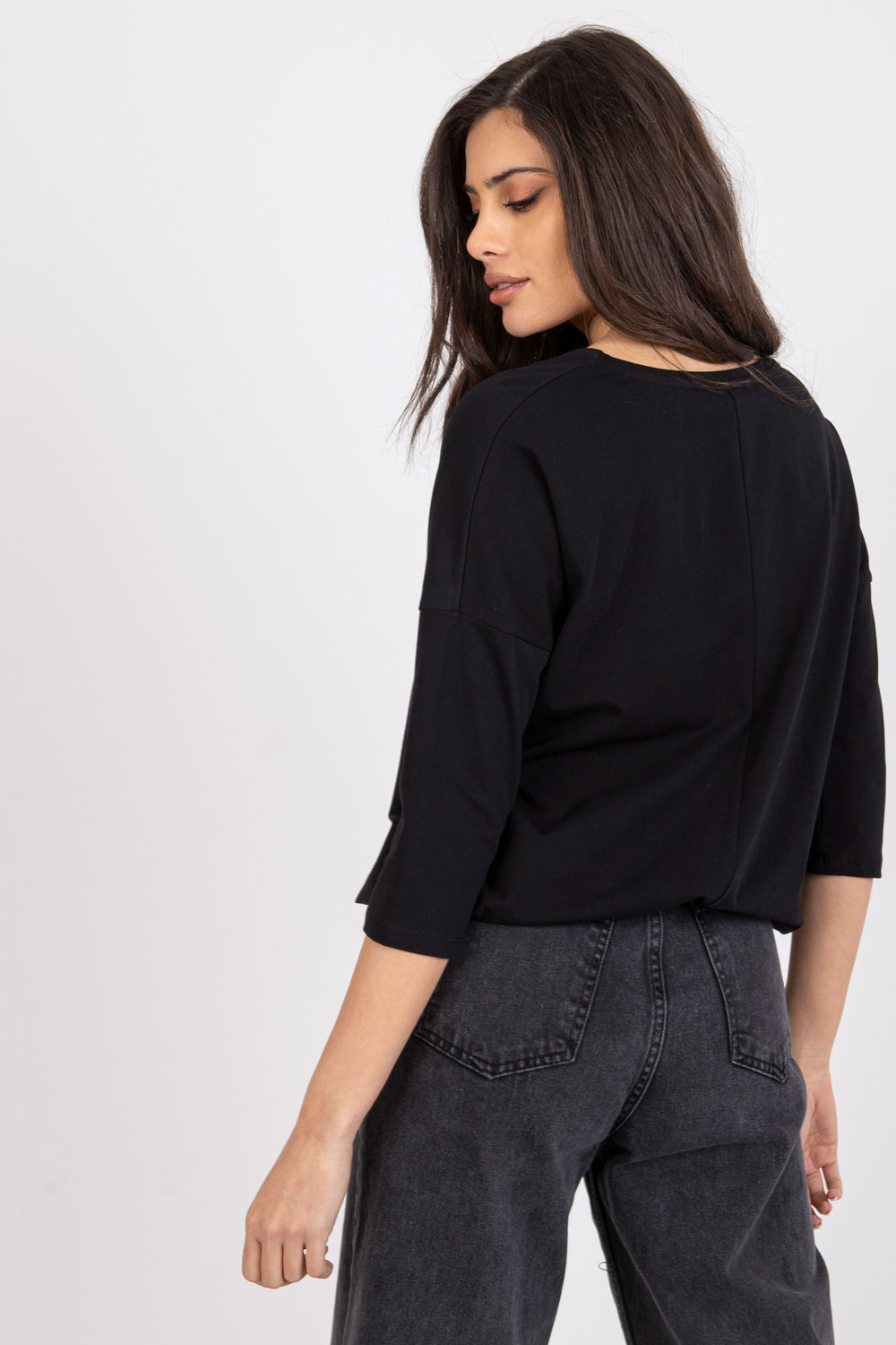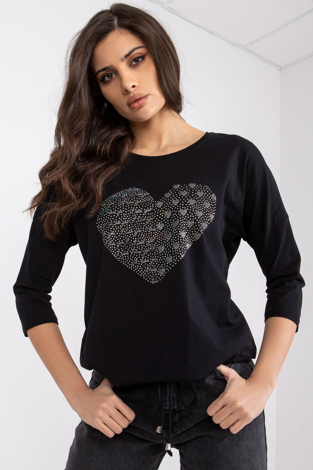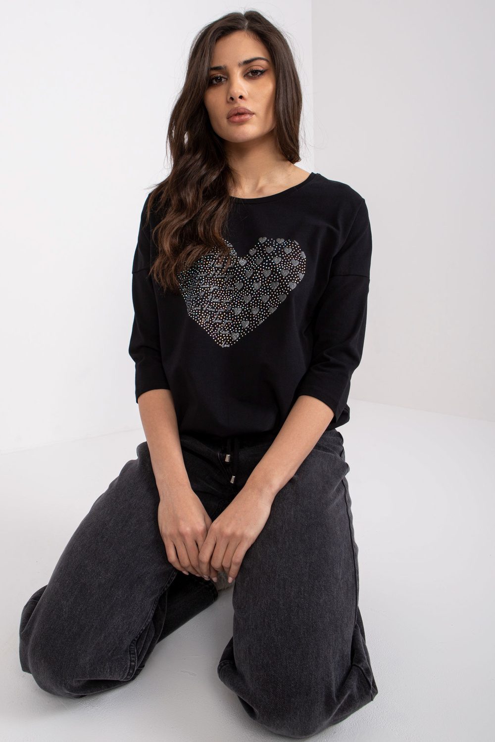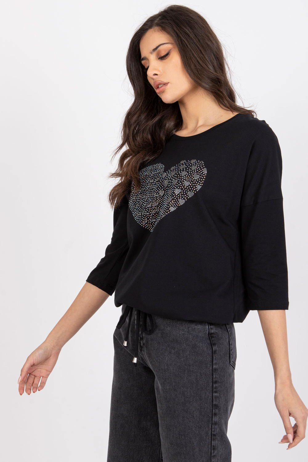 Juodos medvilnės palaidinė su Bindy aplikacijomis.