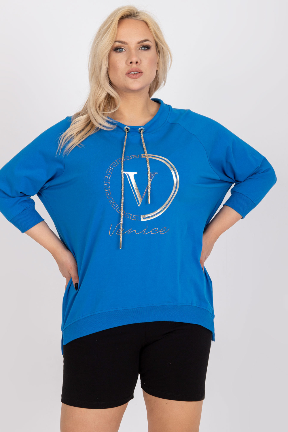 Tamsiai mėlyna plius dydžio palaidinė su aukso spalvos aplikacijomis .