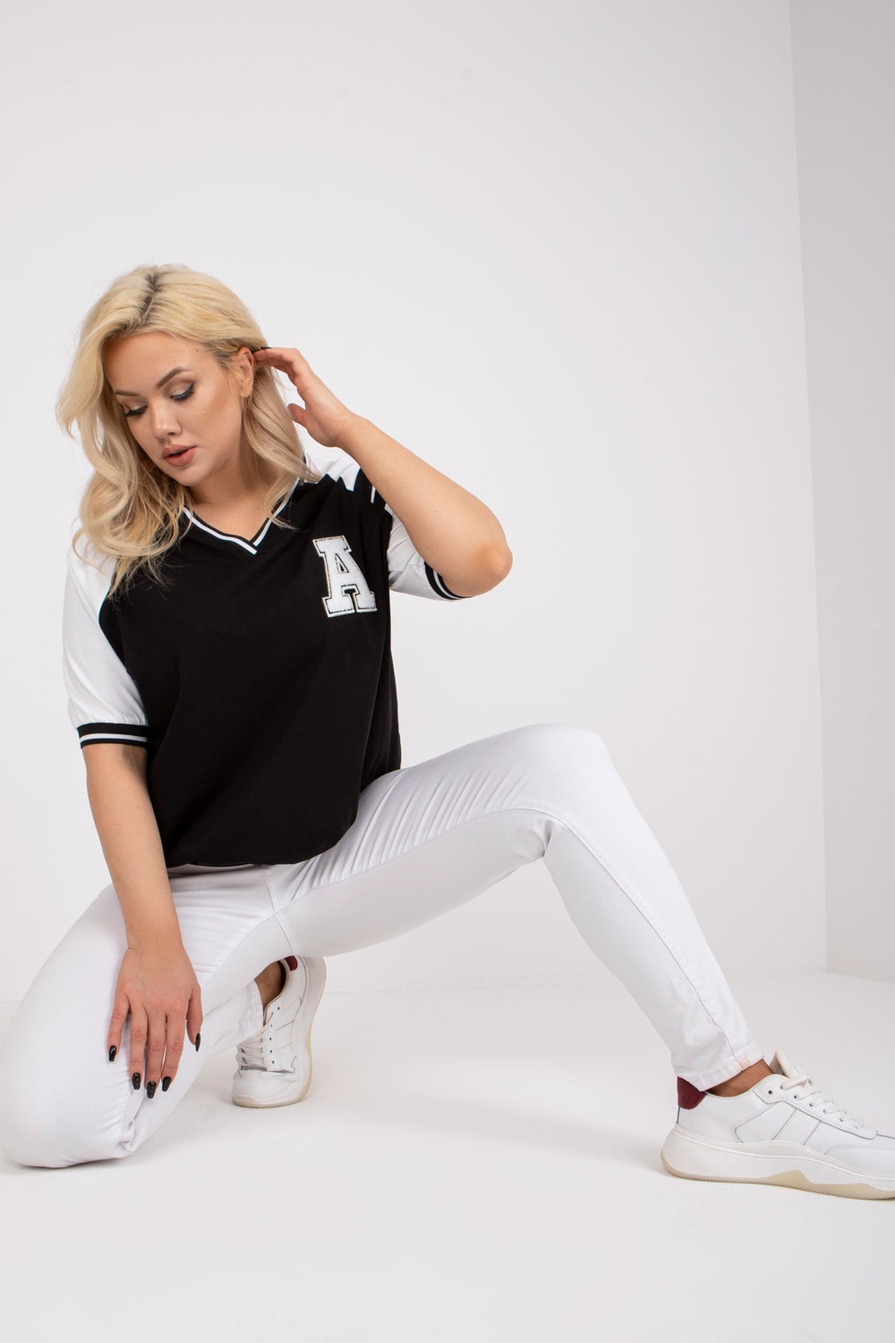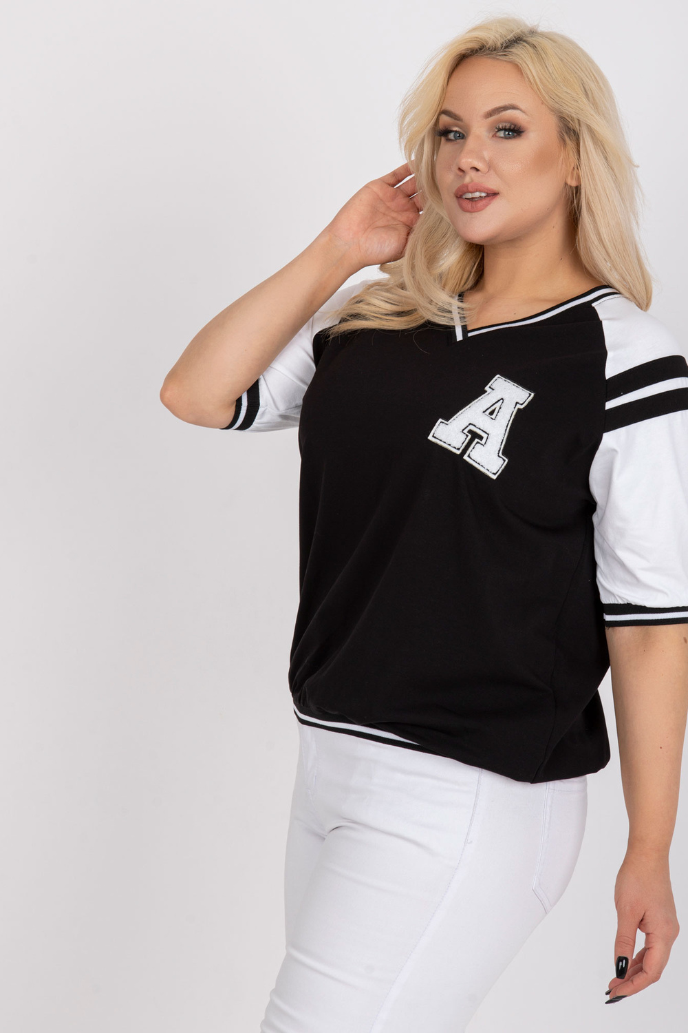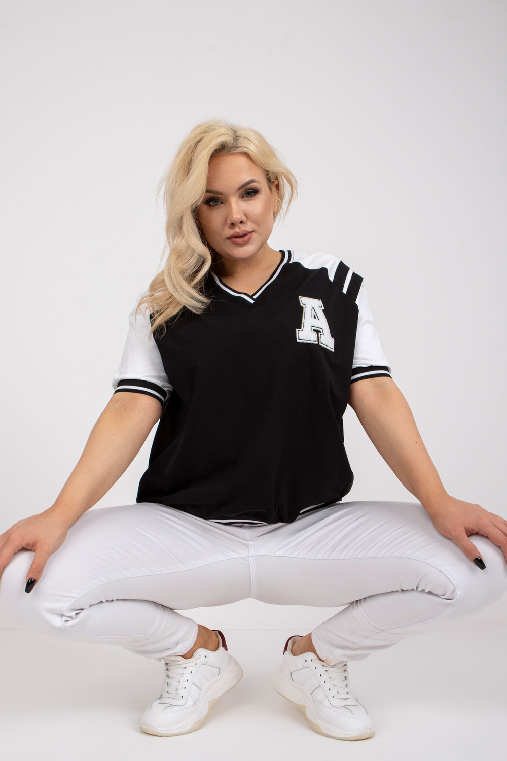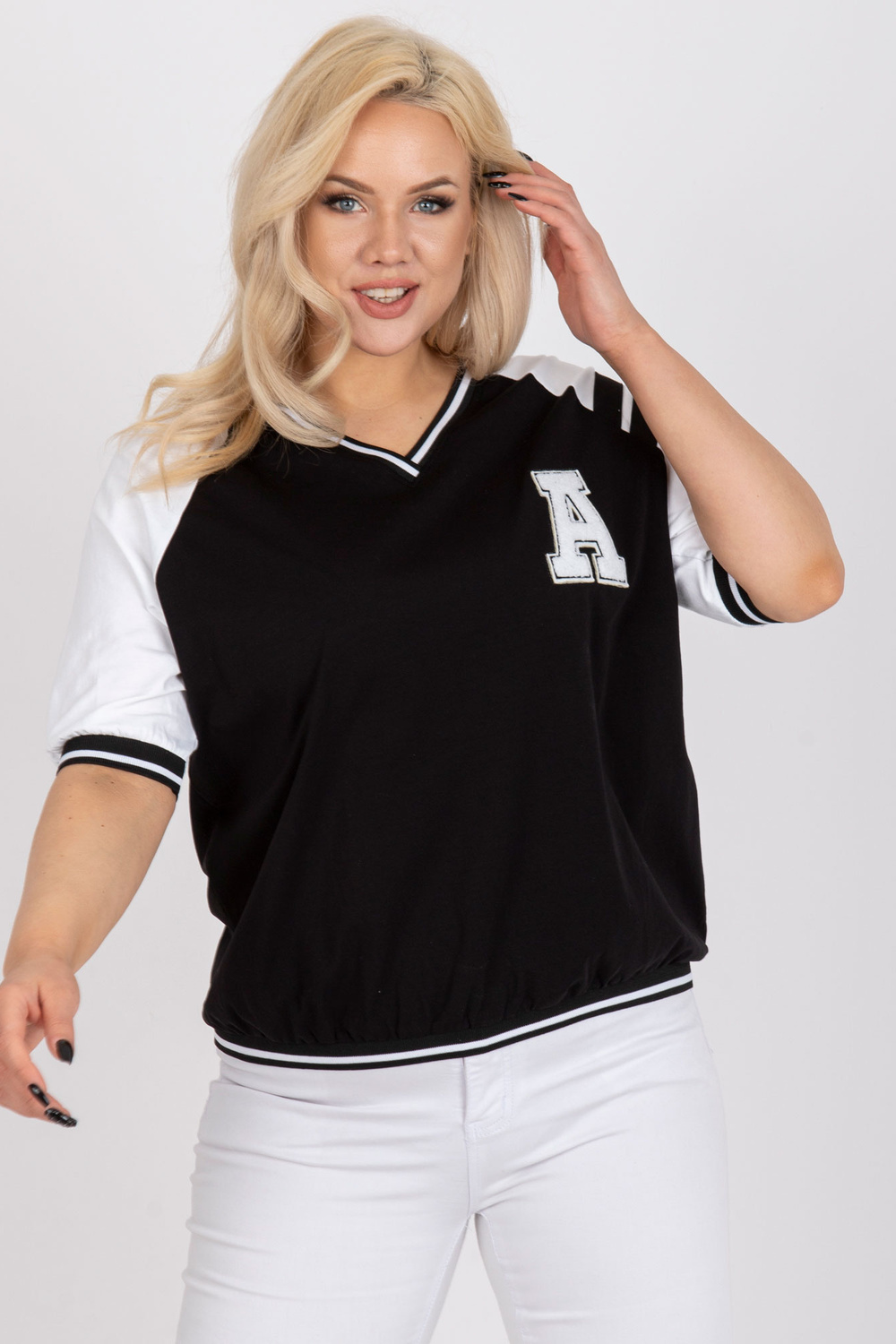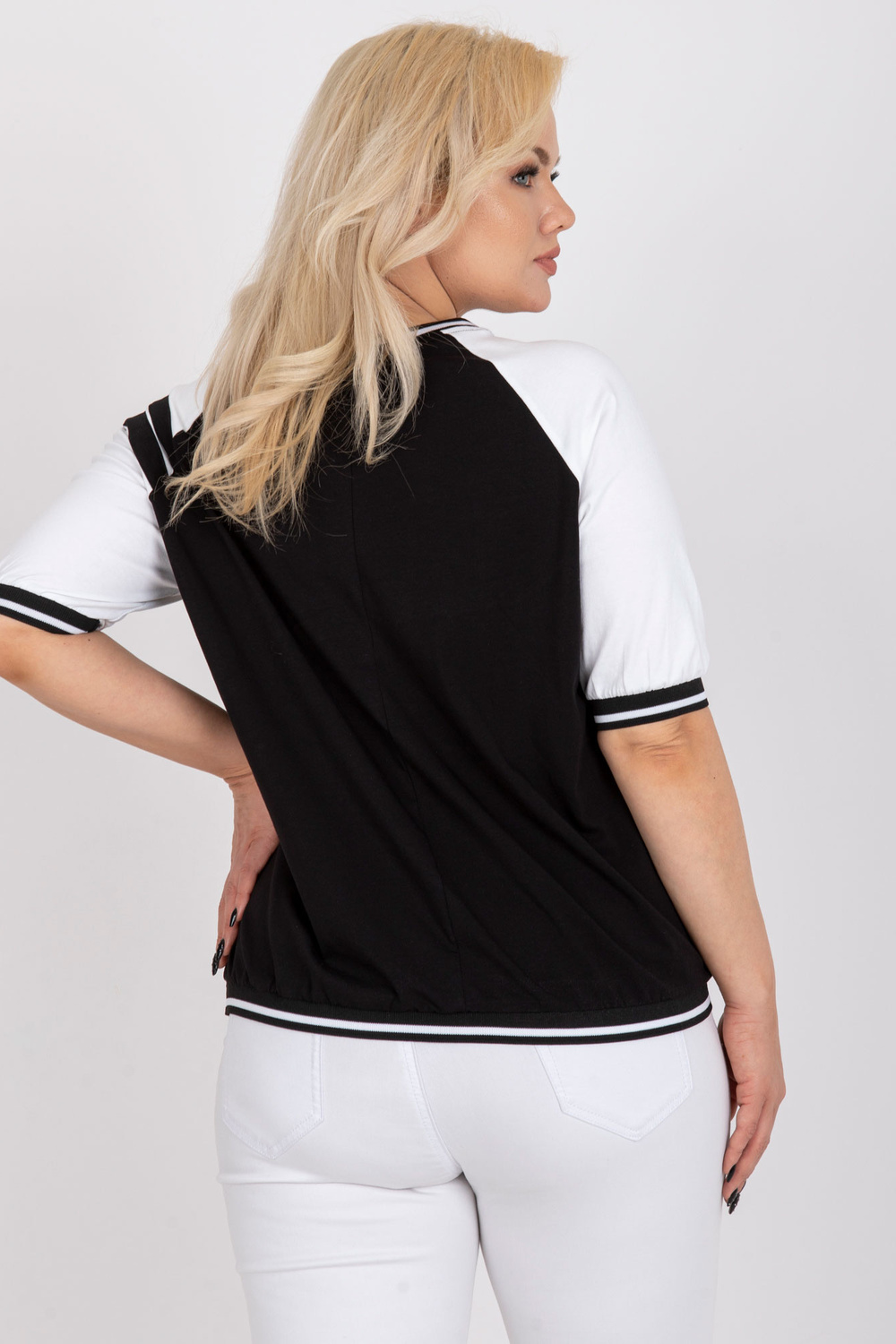 Balta ir juoda laisvalaikio plius dydžio palaidinė su V iškirpte.