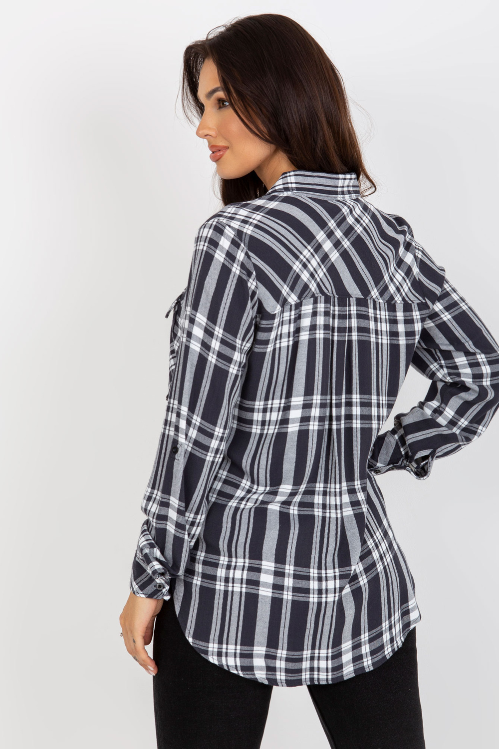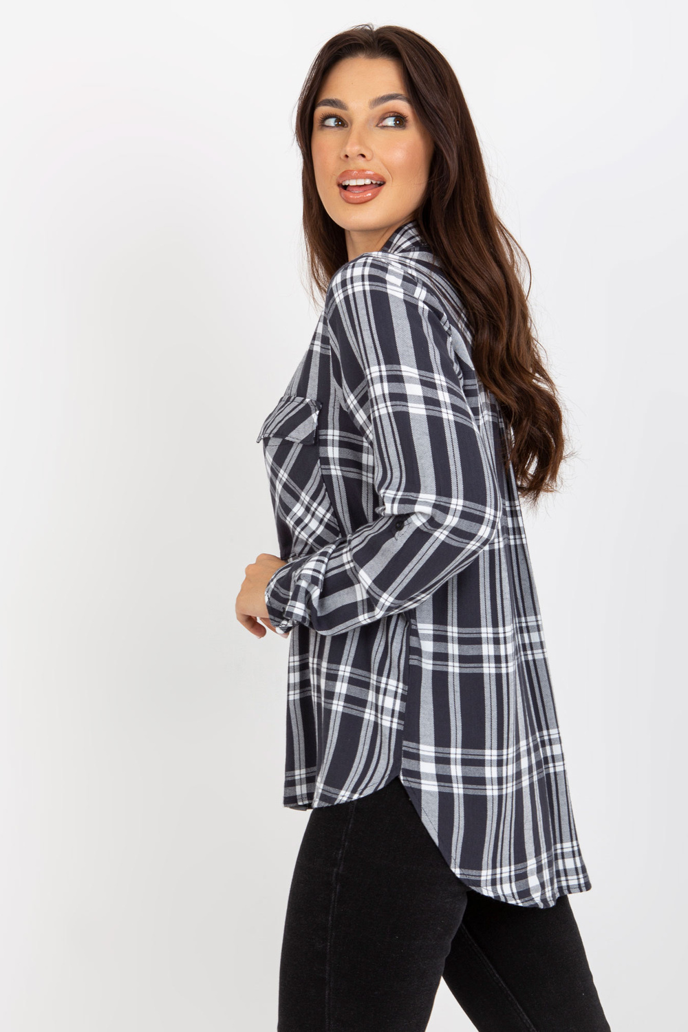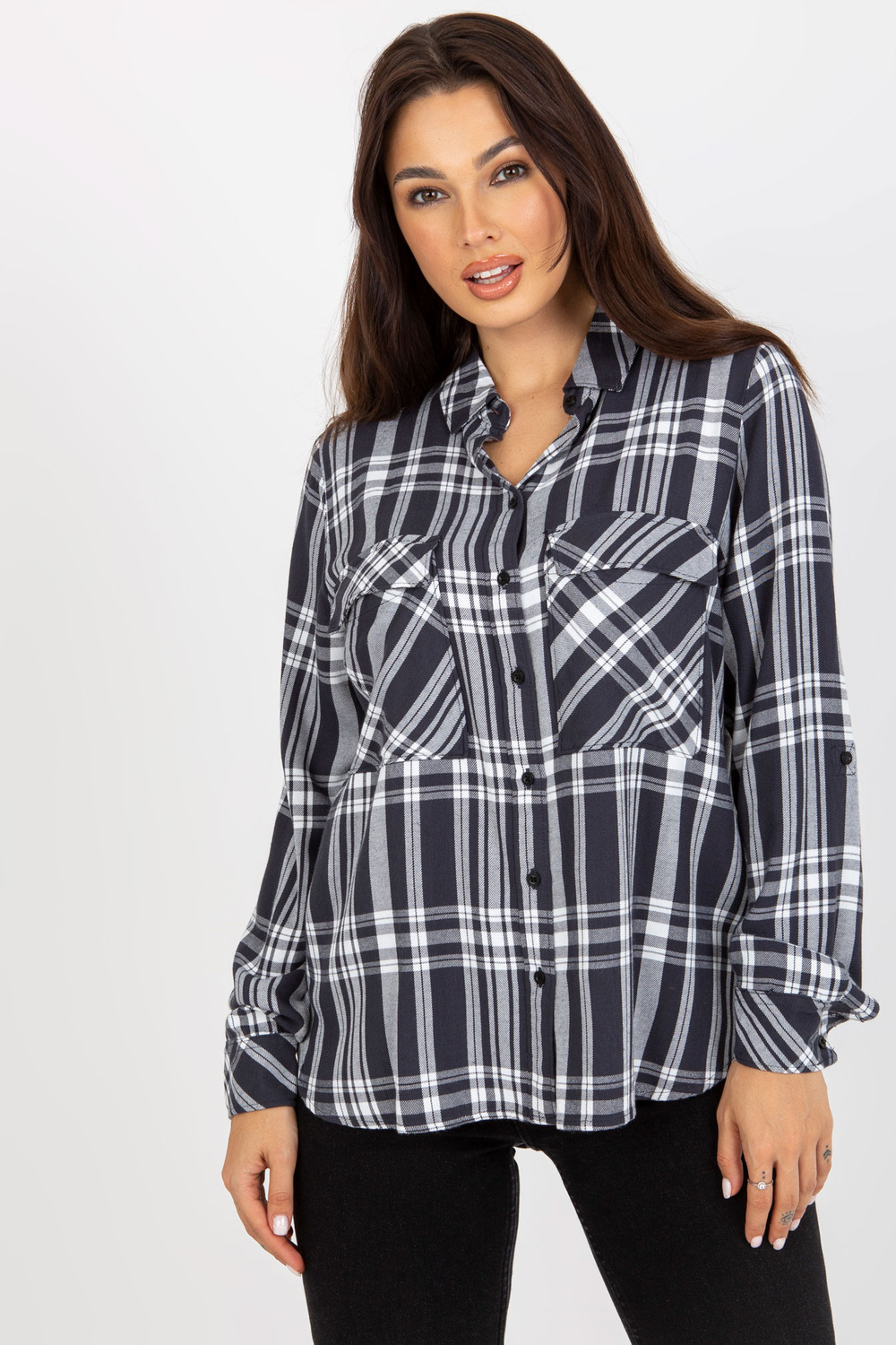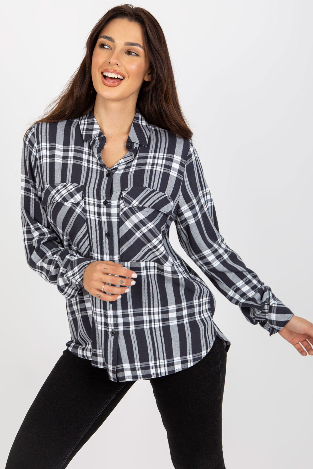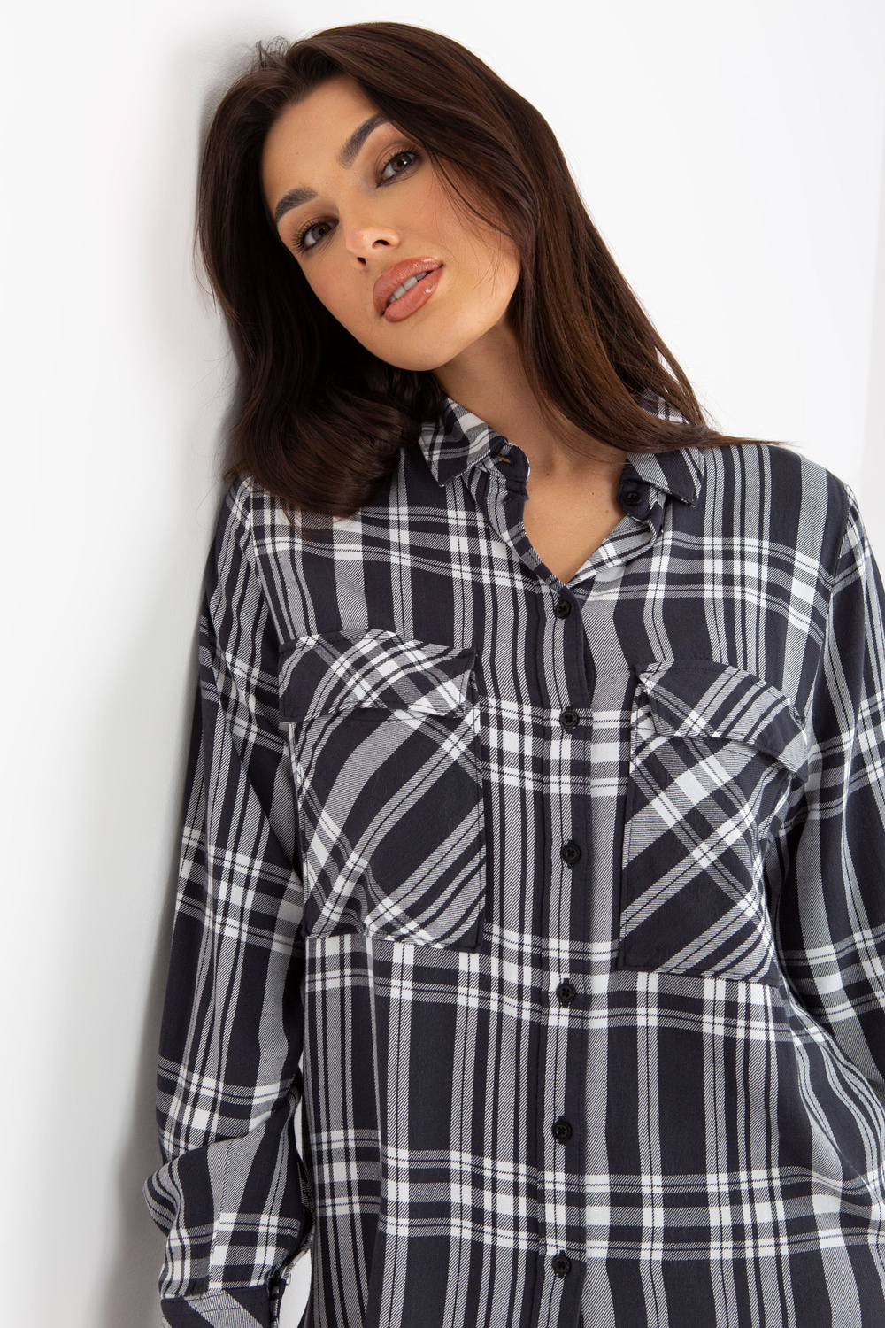 Tamsiai pilki moteriški languoti marškiniai su kišenėmis .
