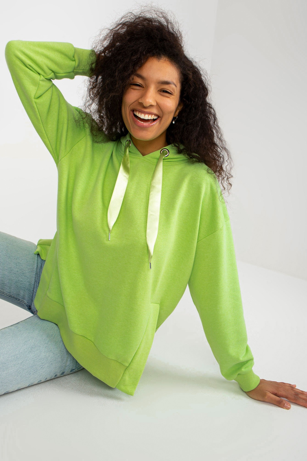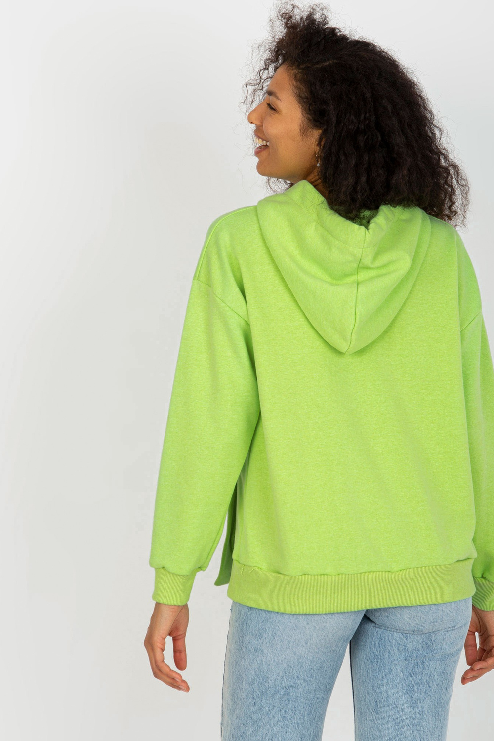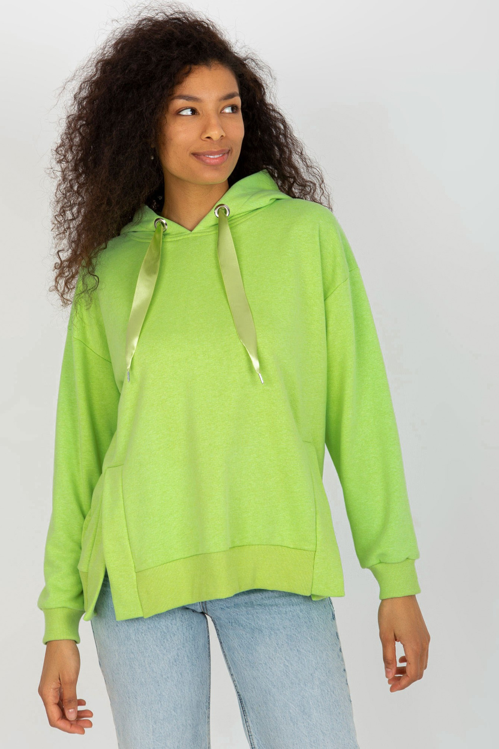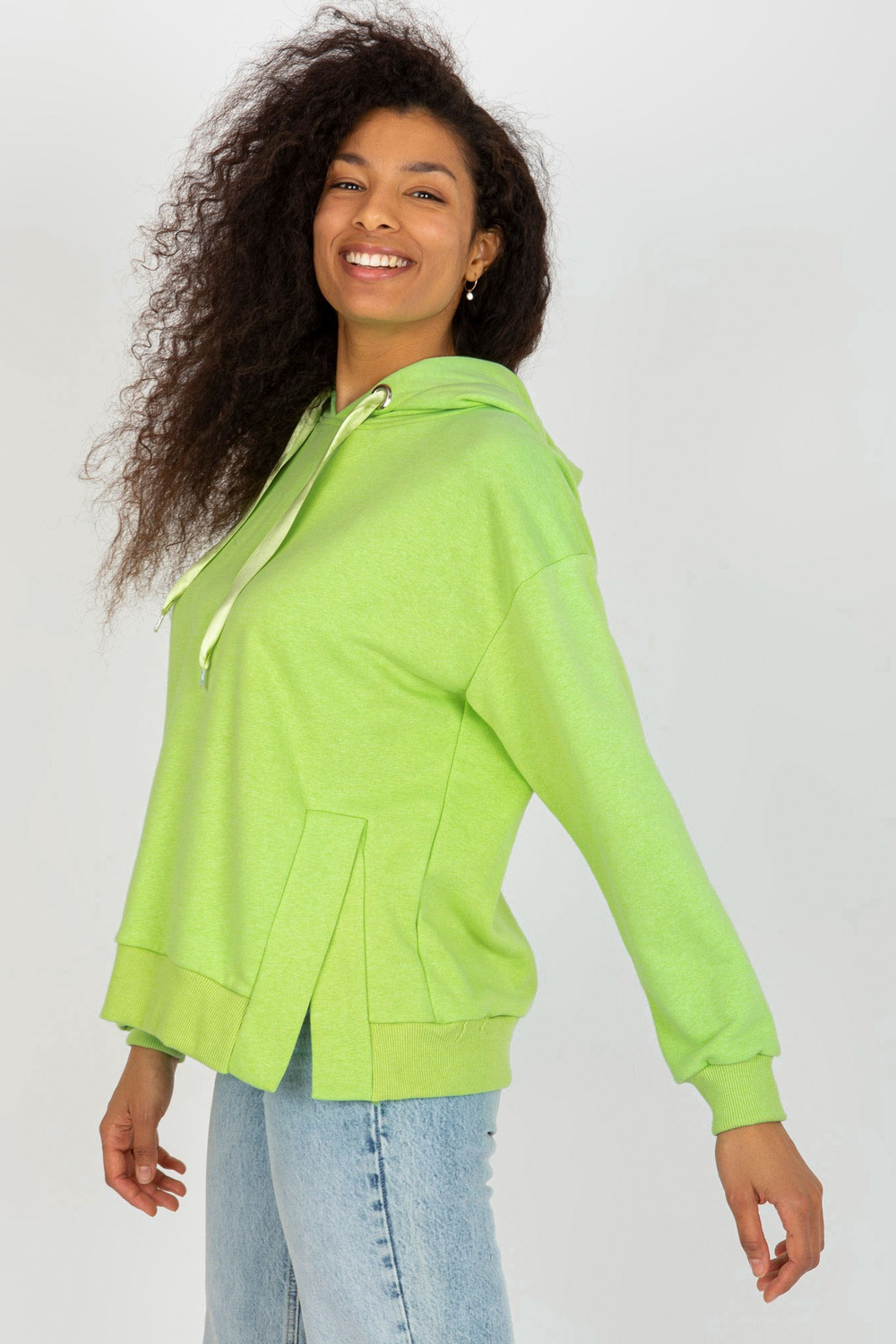Šviesiai žalias megztinis su gobtuvu ir skeltukais.