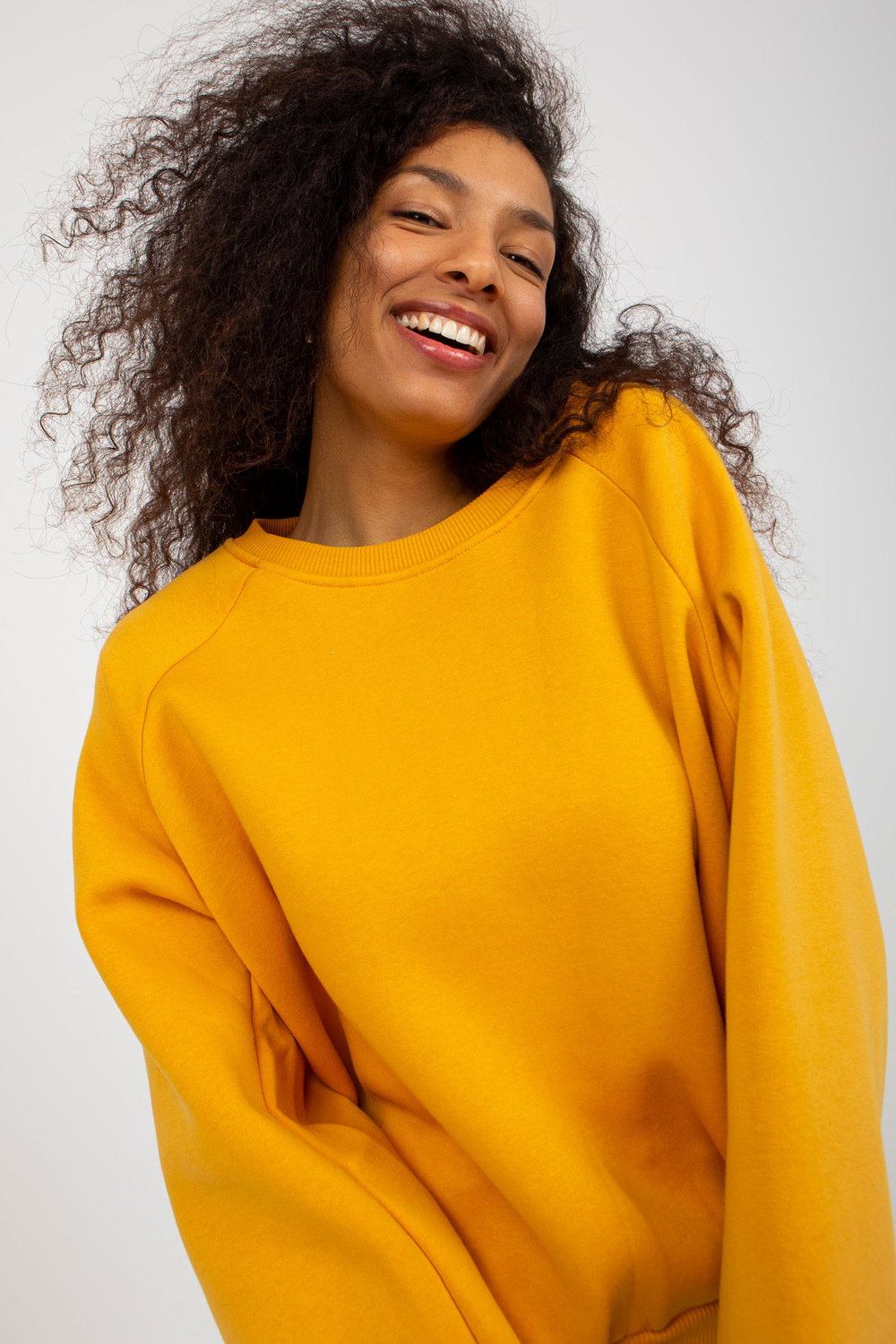 Tamsiai geltonas paprastas megztinis plačiomis rankovėmis. Prekės kodas: EM-BL-01.92 Dominuojantis raštas: glotnus Stilius: laisvalaikis: laisvalaikis, į miestą, pasivaikščioti, į darbą Modelis dėvi vieno dydžio dydį. Modelio matmenys: aukštis 181 cm, krūtinė 87 cm, wai