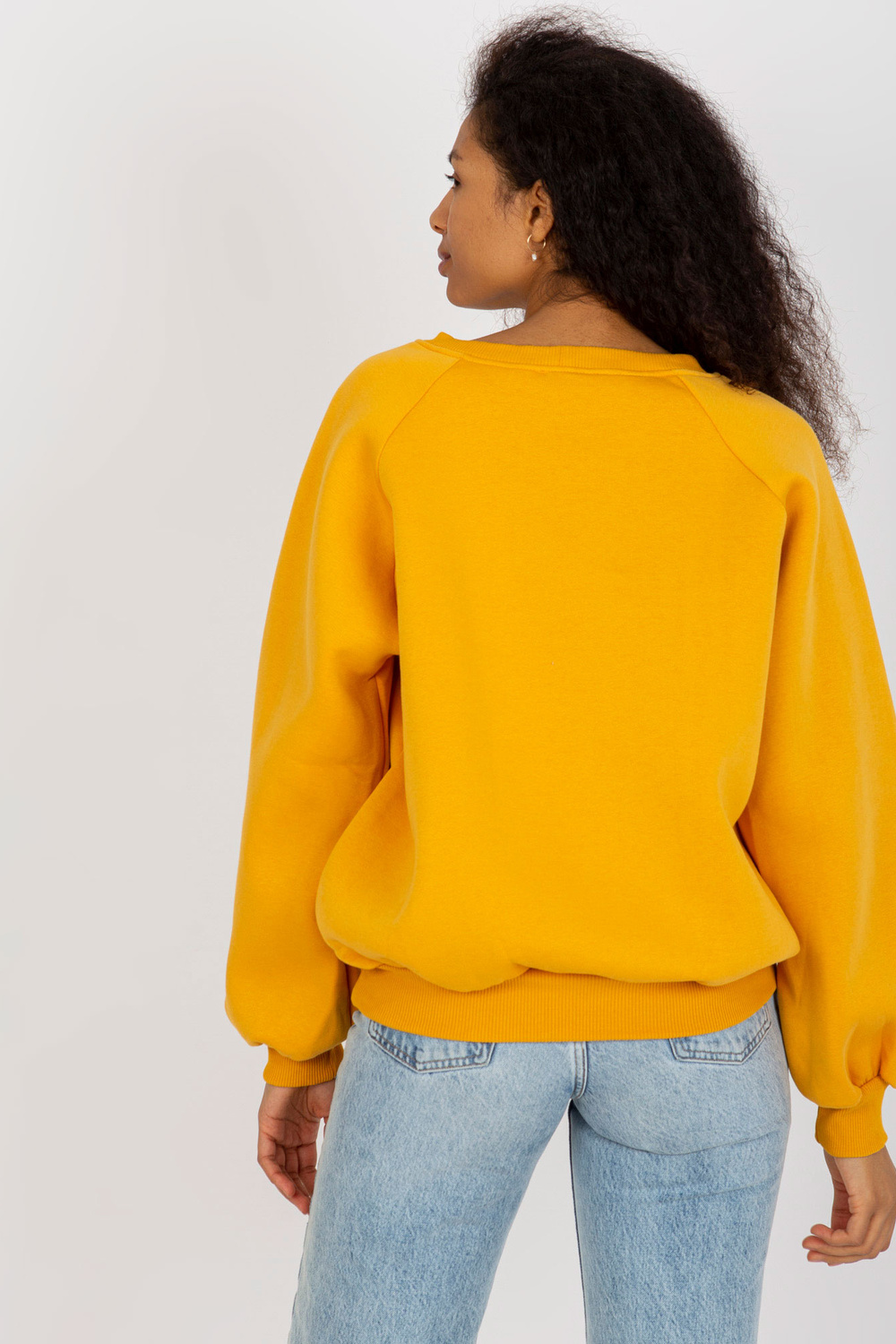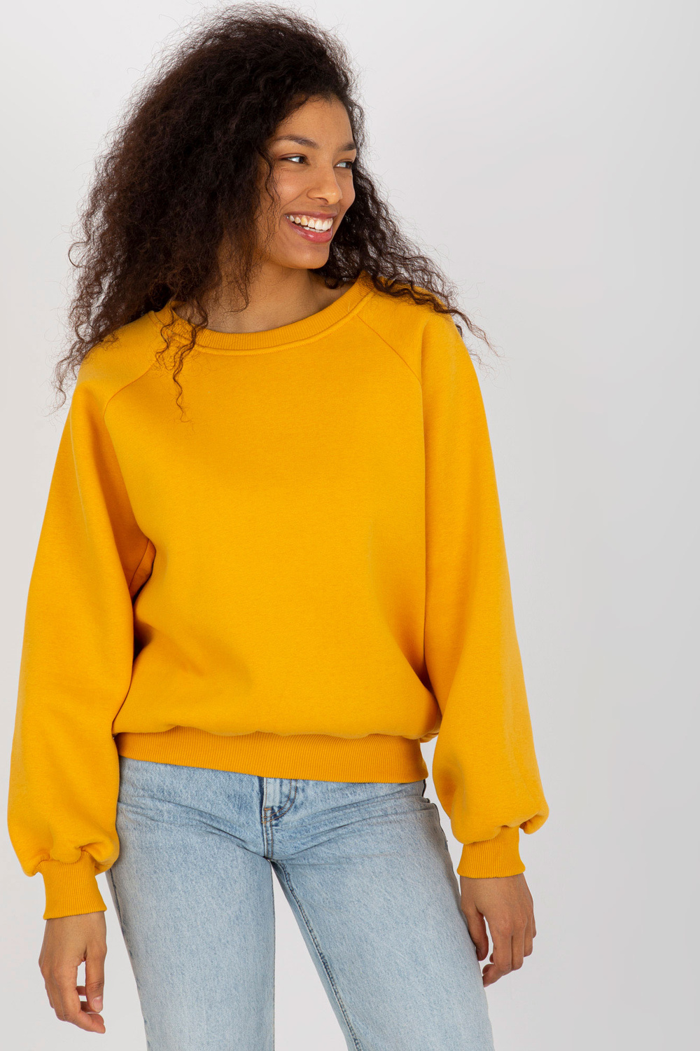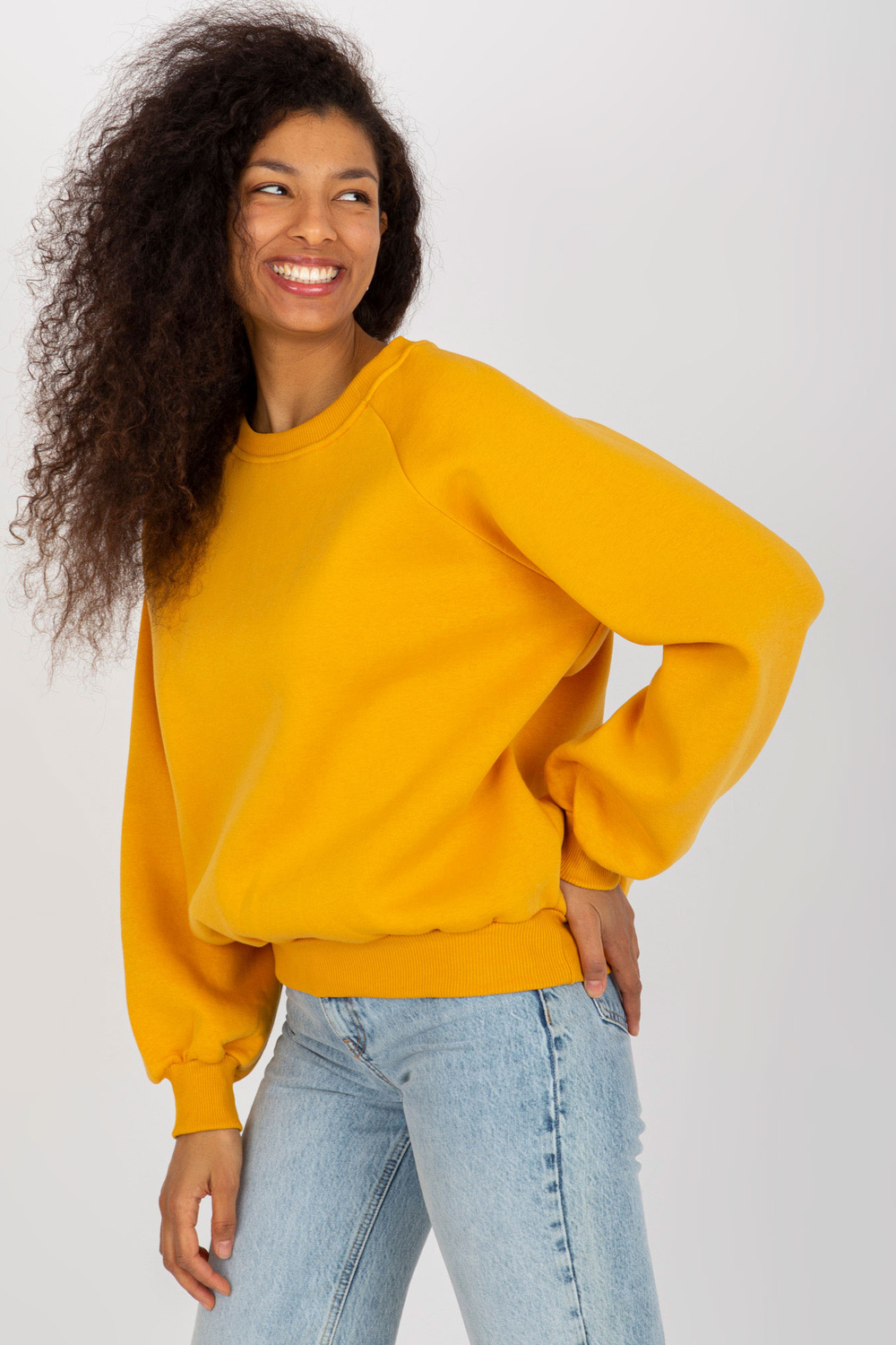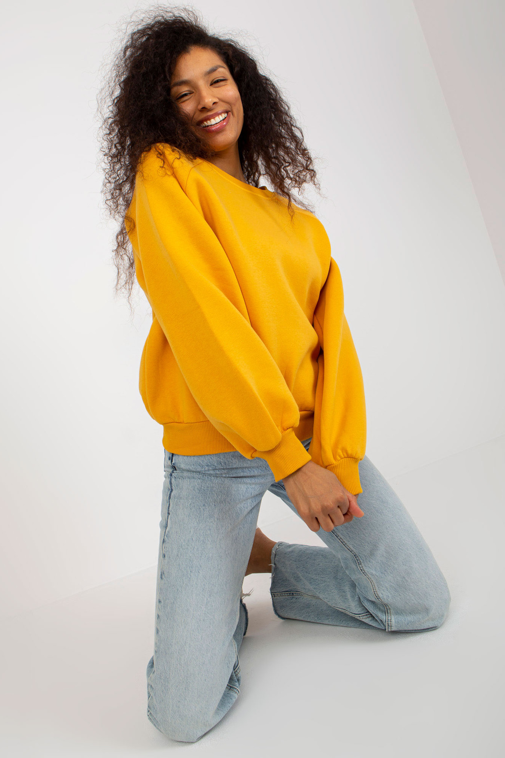 Tamsiai geltonas paprastas megztinis plačiomis rankovėmis.