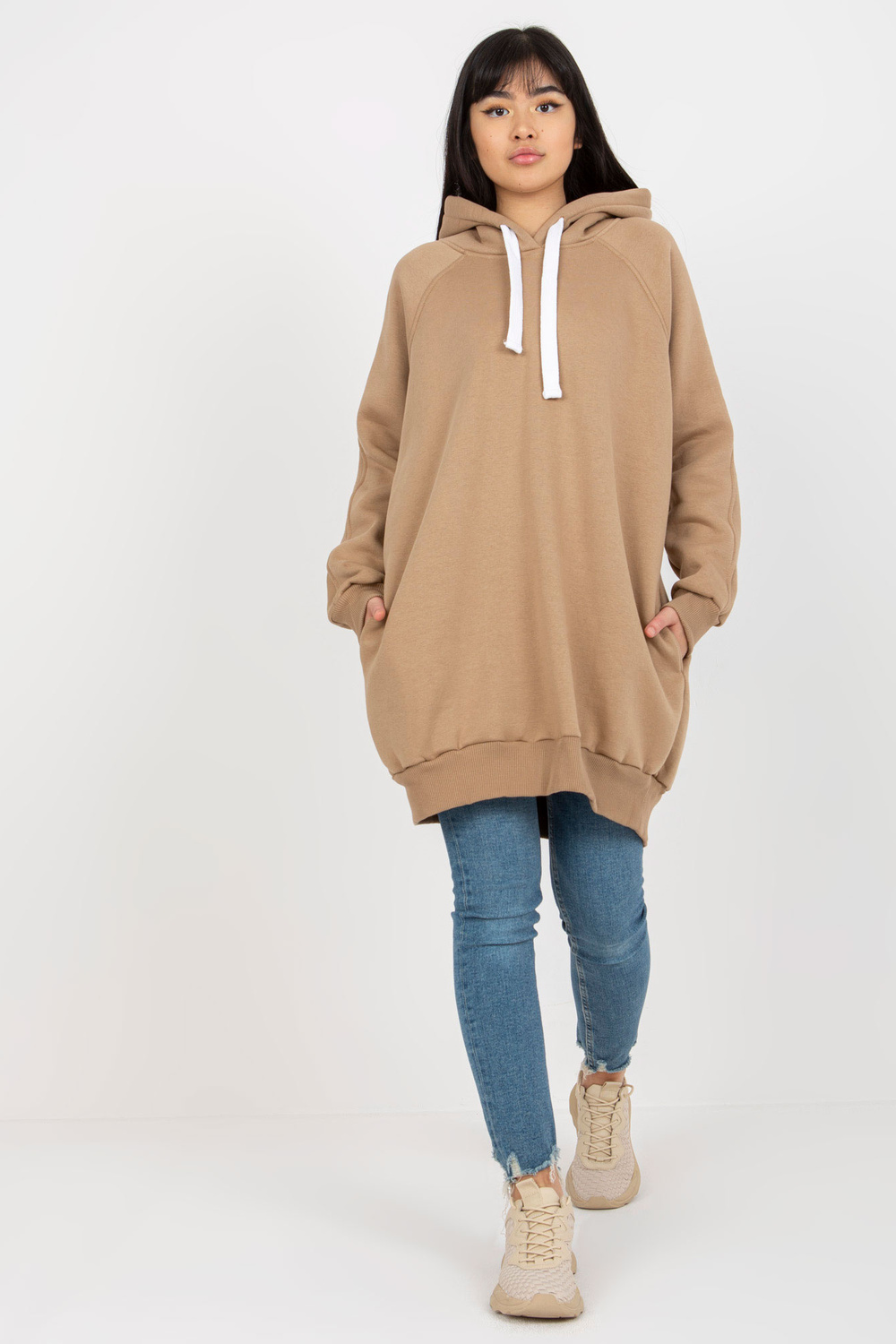 Tamsiai smėlio spalvos ilgas, paprastas megztinis su kišenėmis.