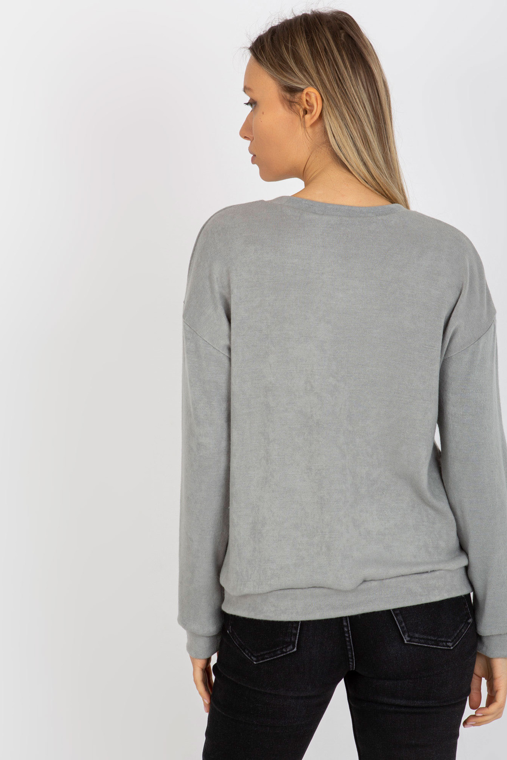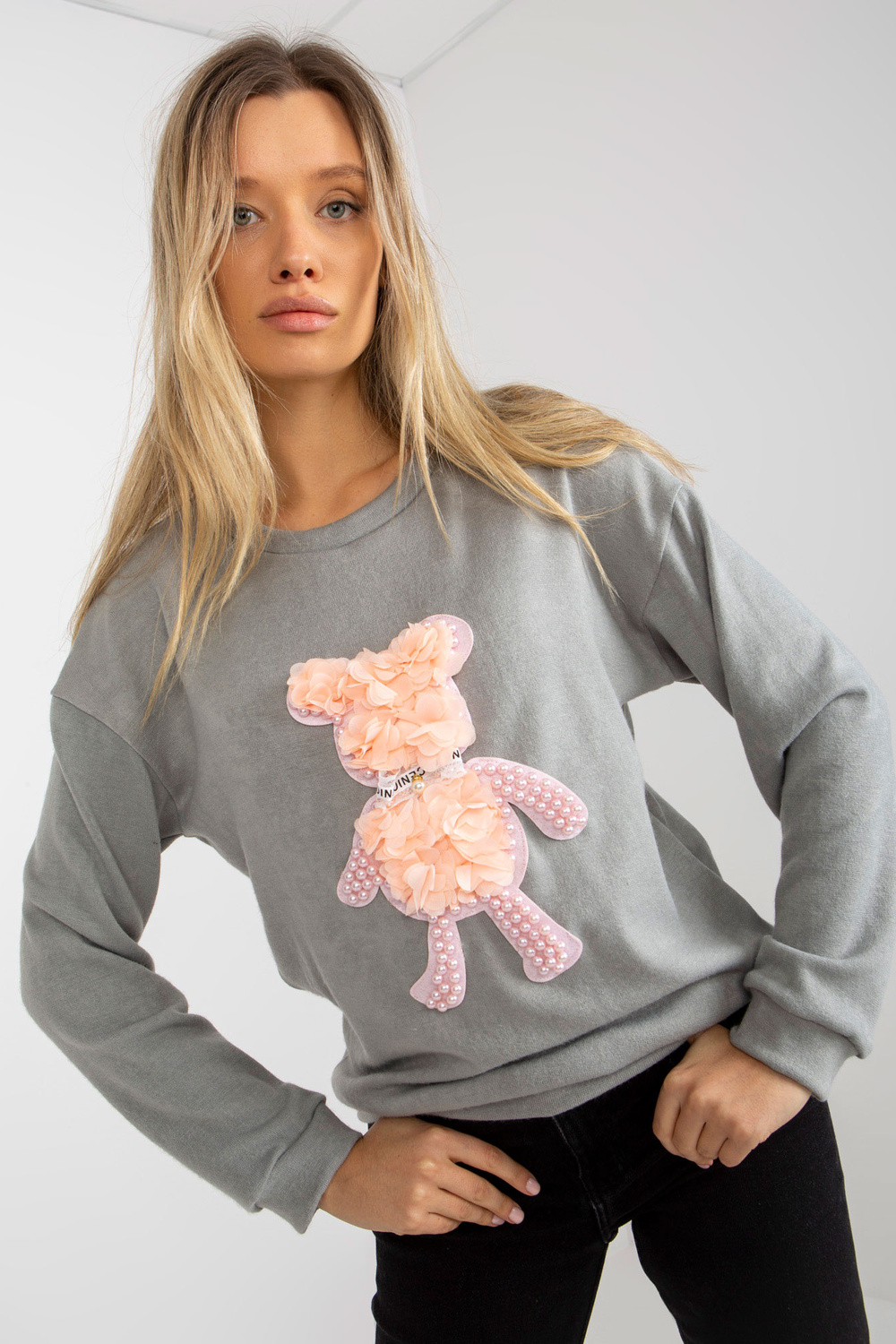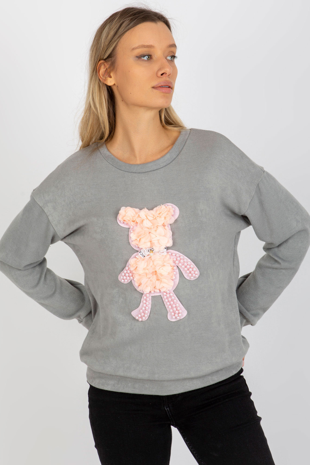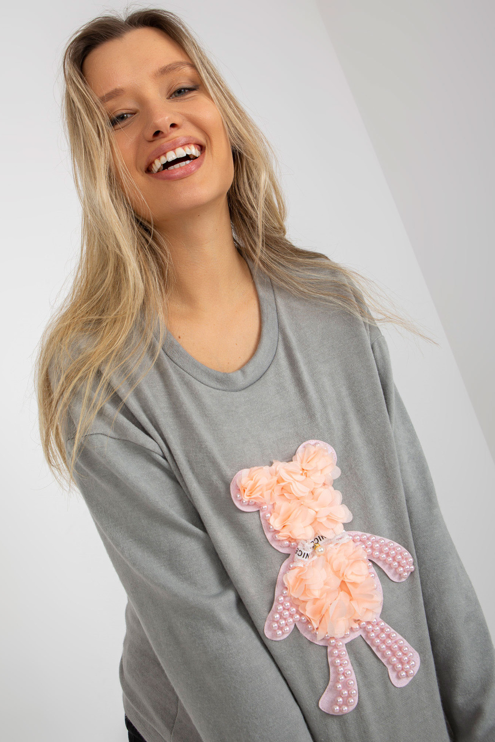Pilkas klasikinis moteriškas megztinis su 3D aplikacijomis.