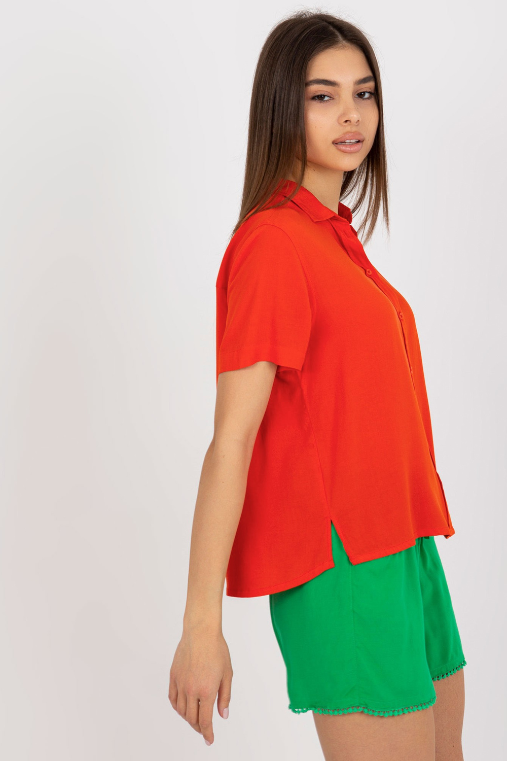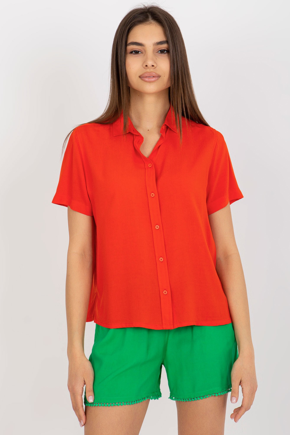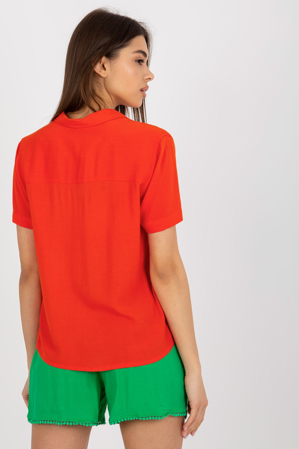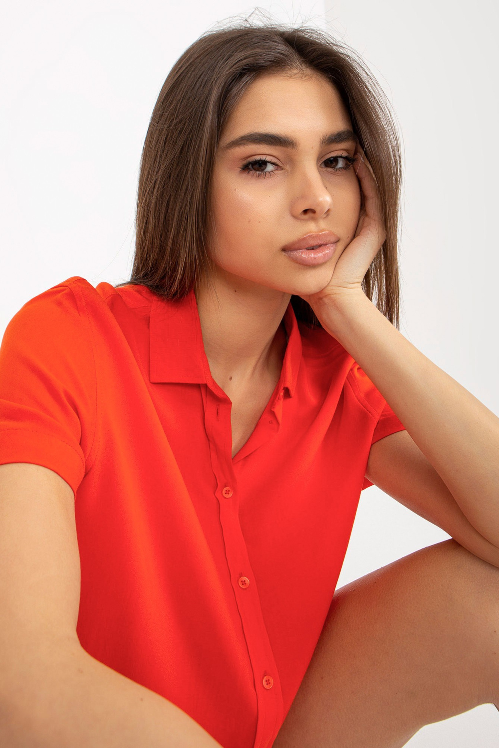 Oranžinė marškinių palaidinė su žemesnio lygio sagomis.