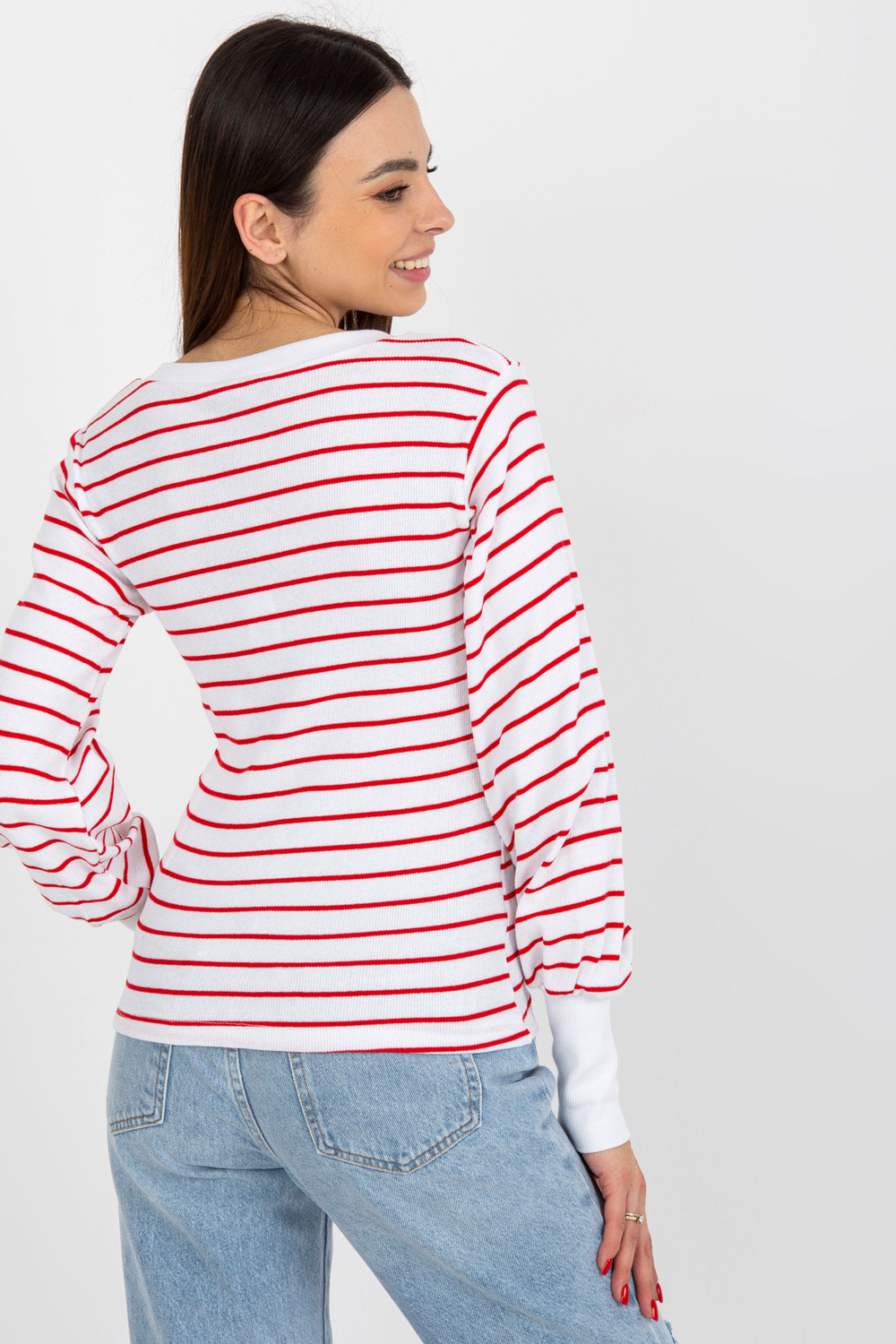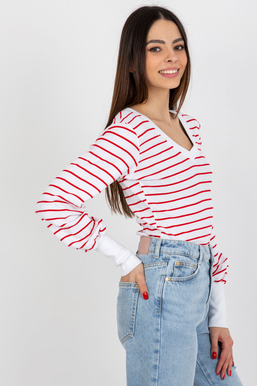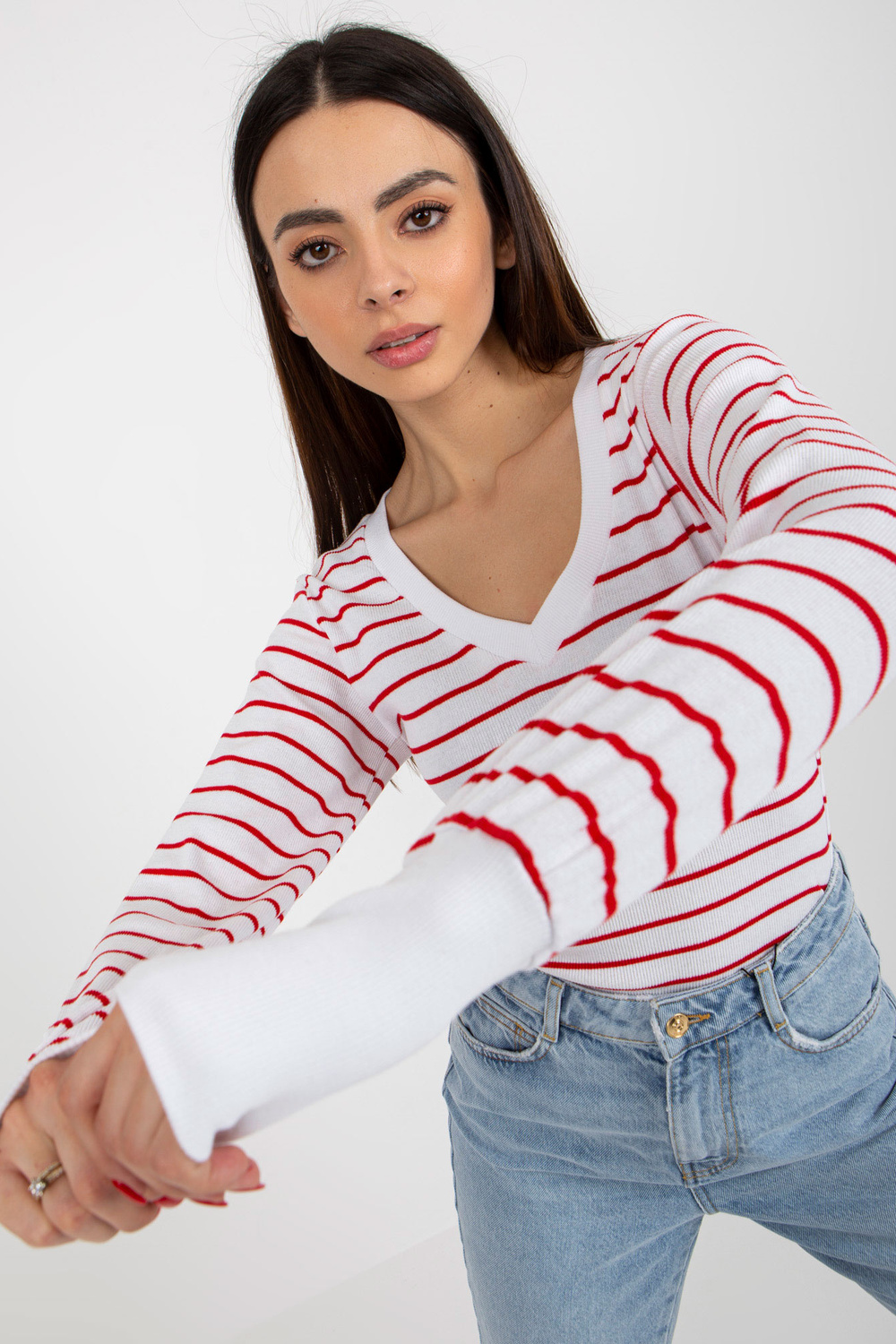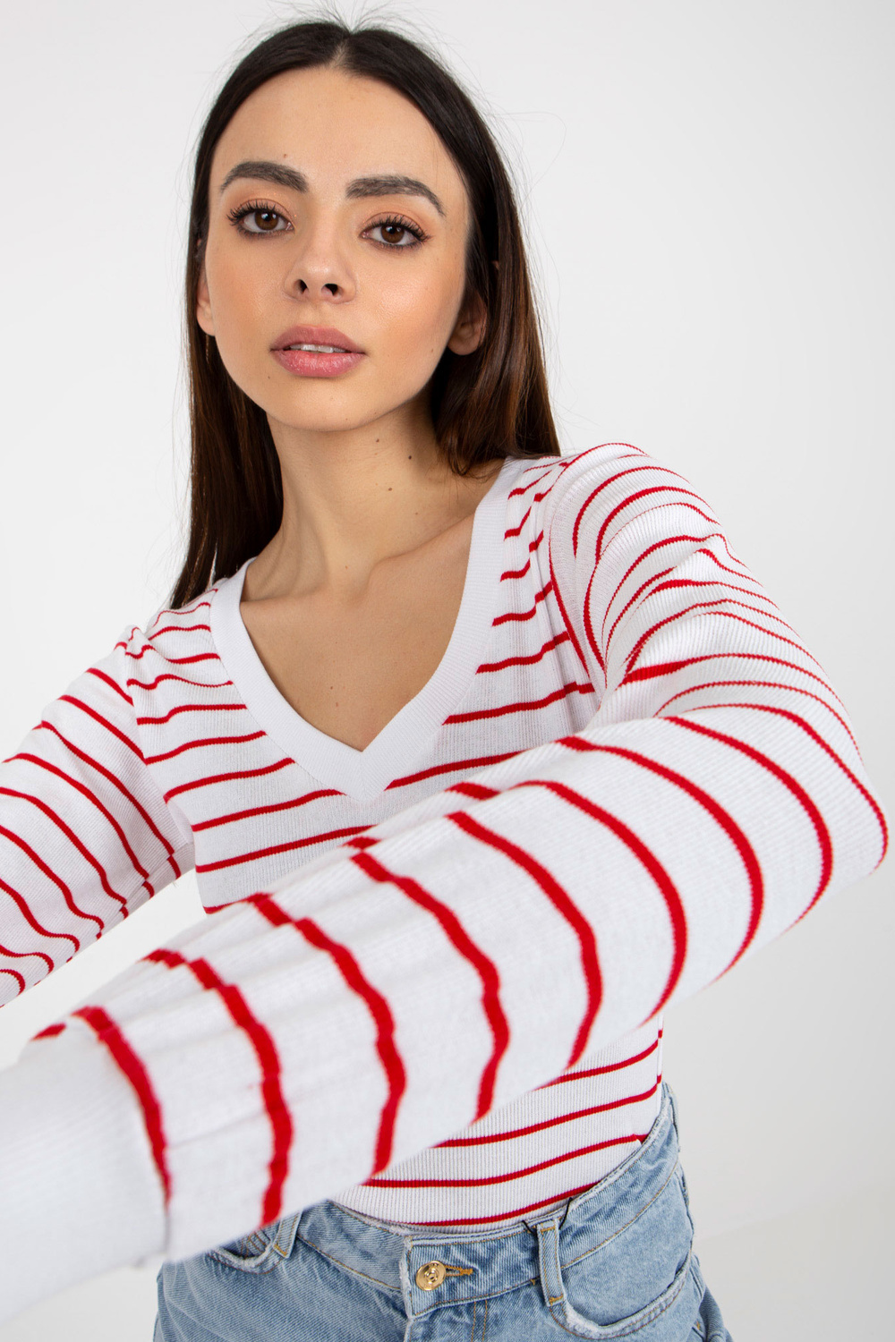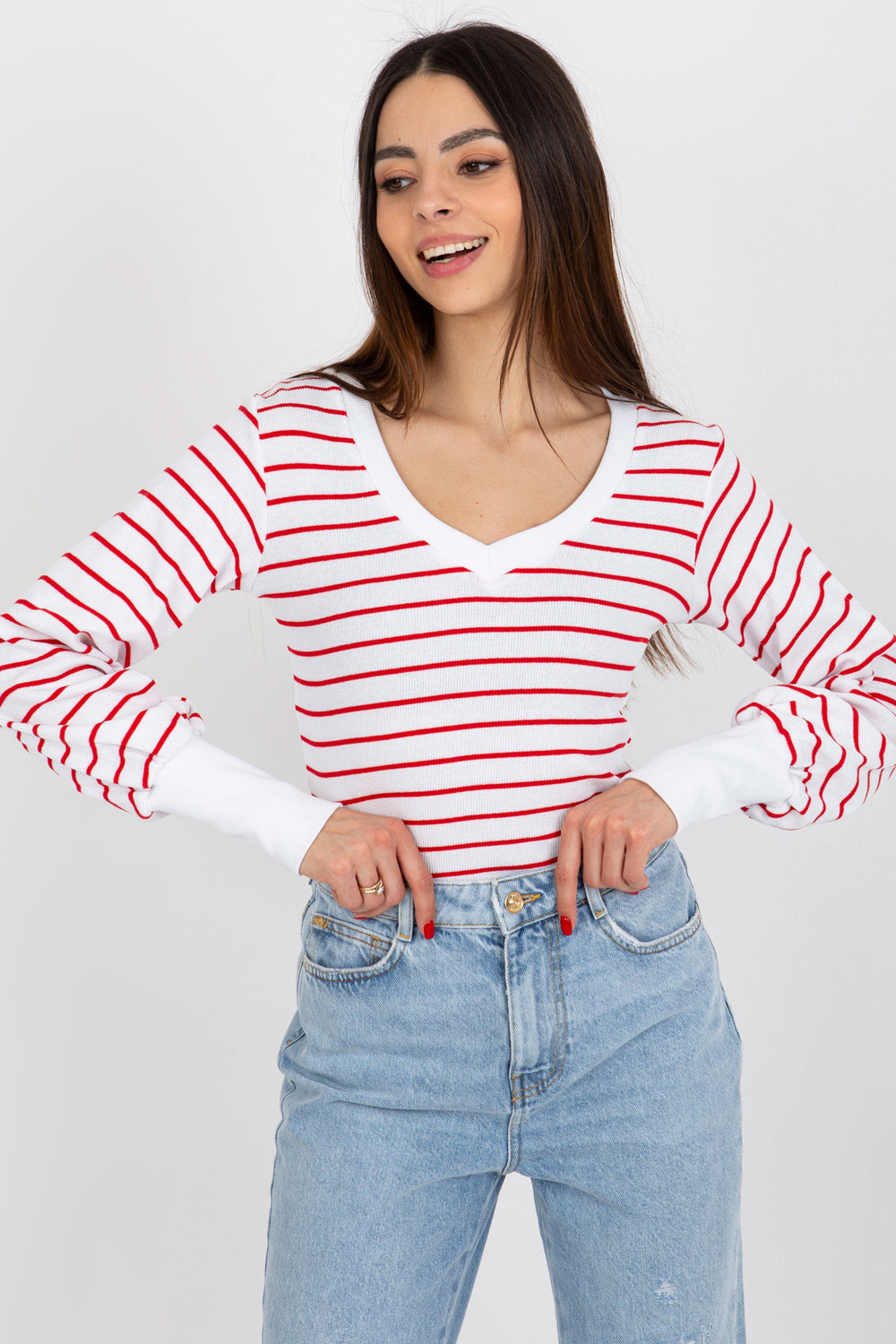 Paprasta balta ir raudona palaidinė su V formos iškirpte.