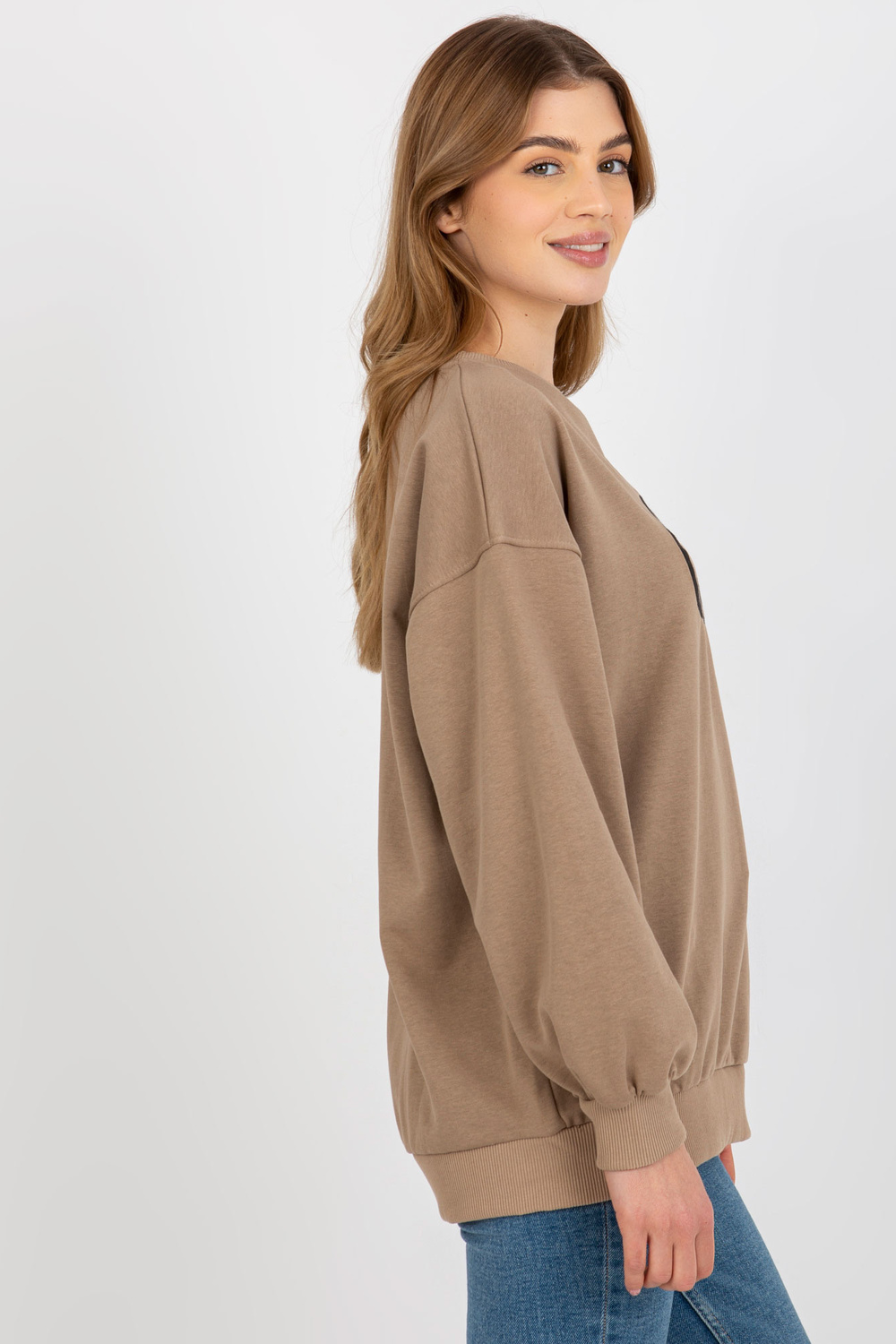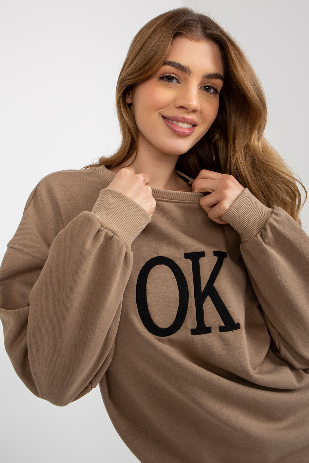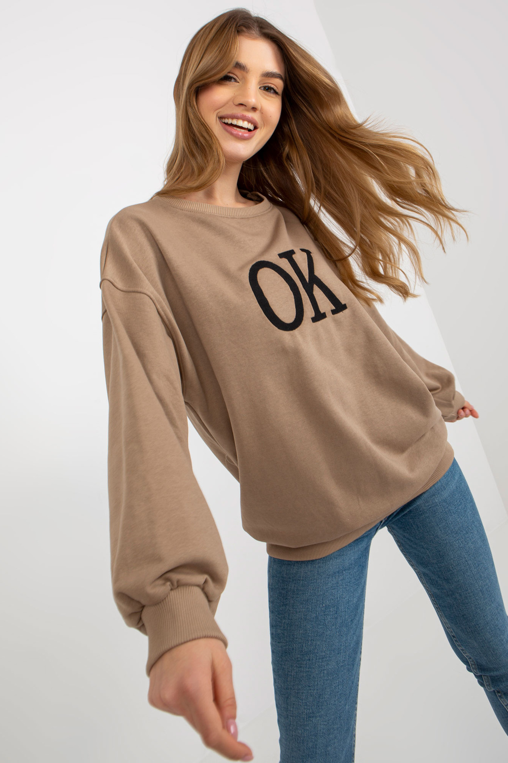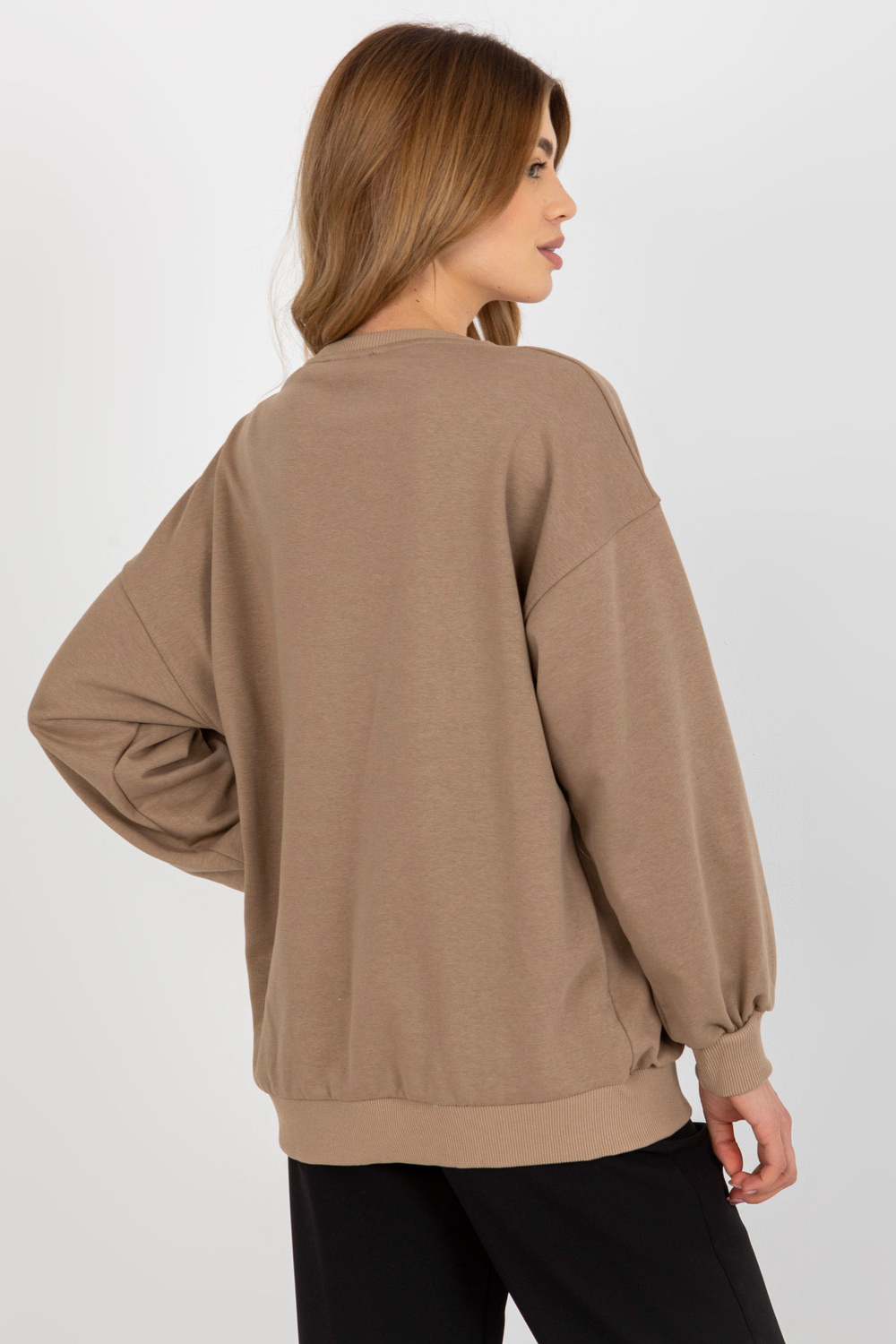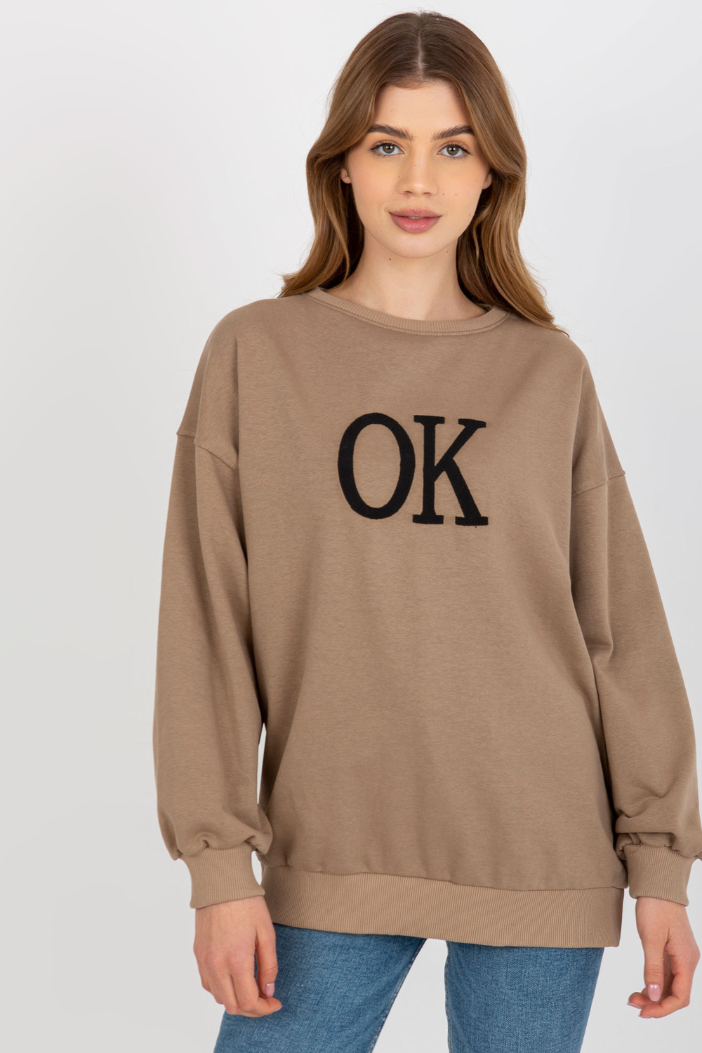 Tamsiai smėlio spalvos laisvas megztinis be gobtuvo su siuvinėjimu.