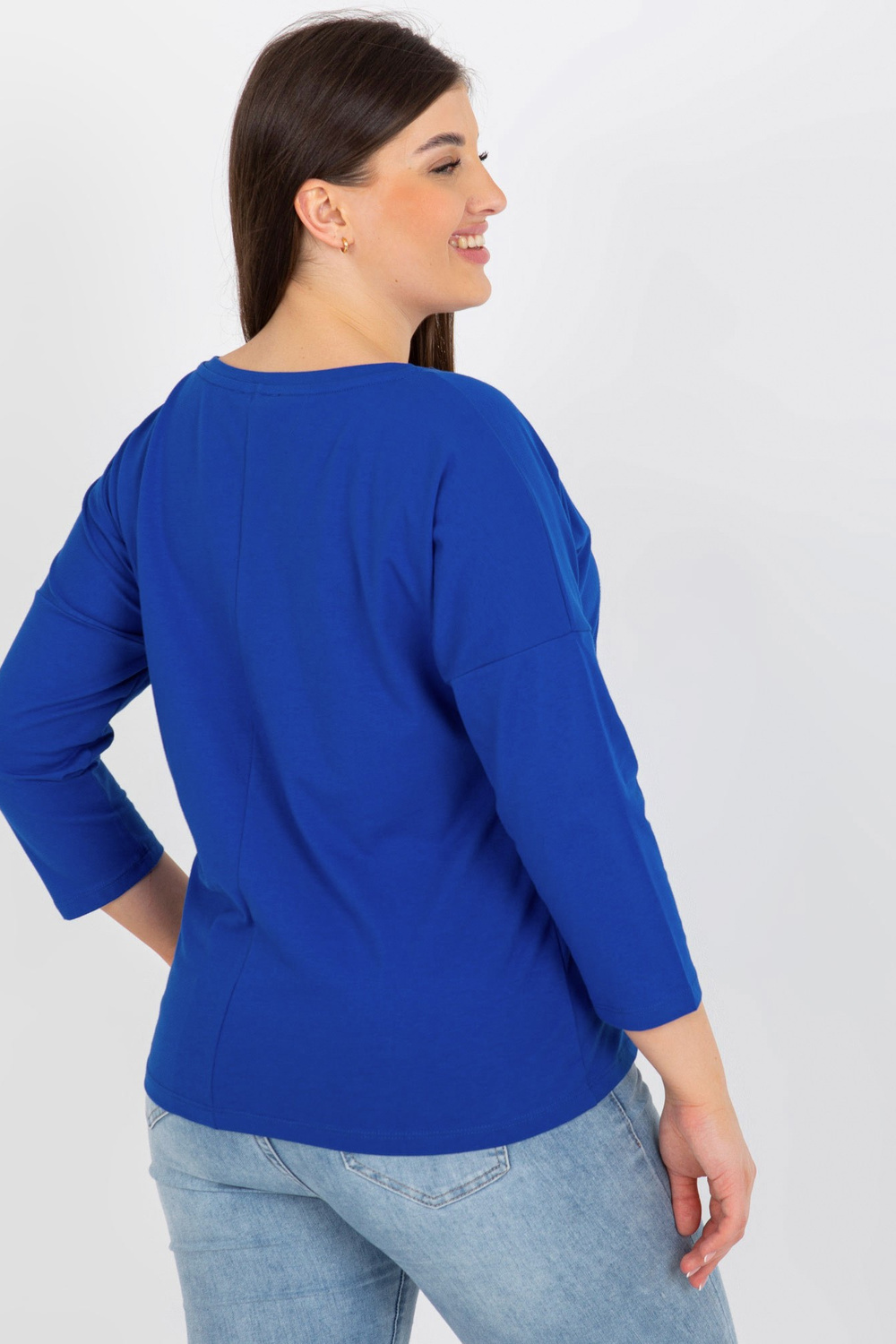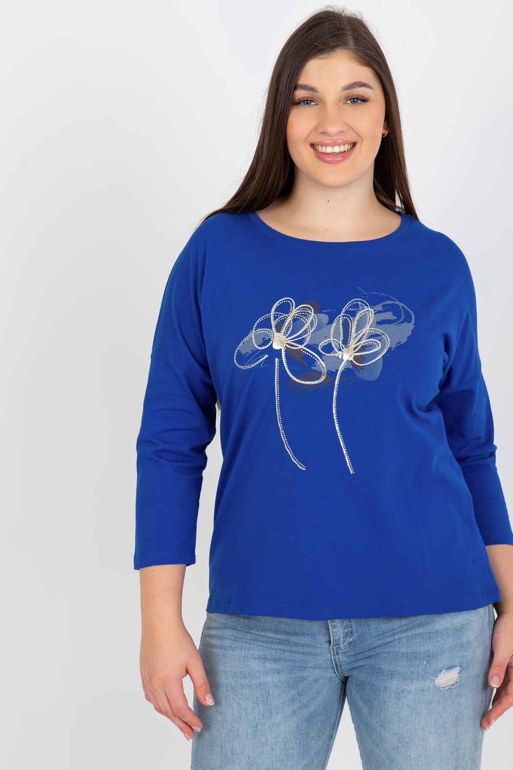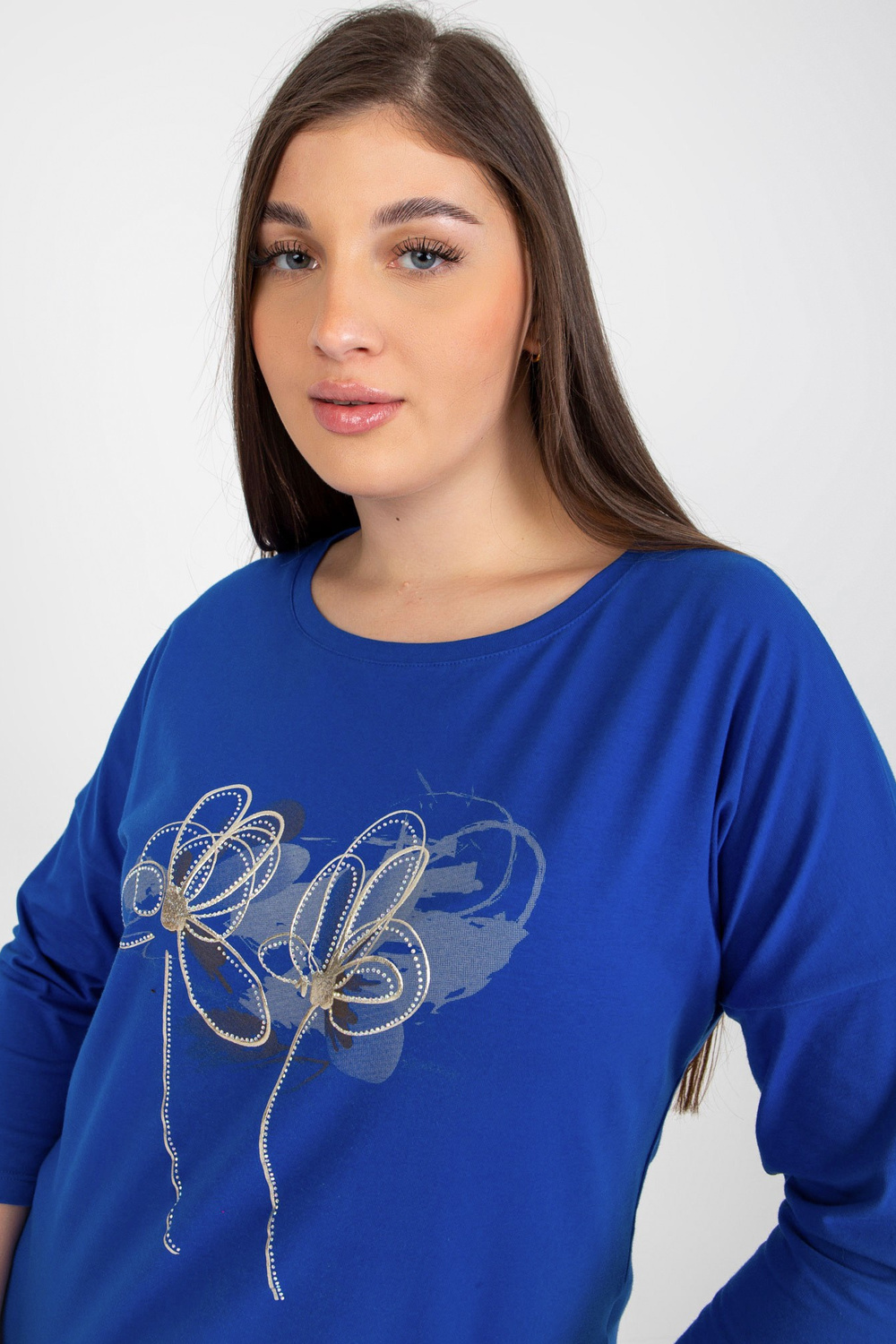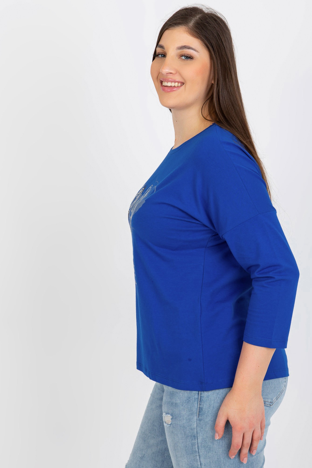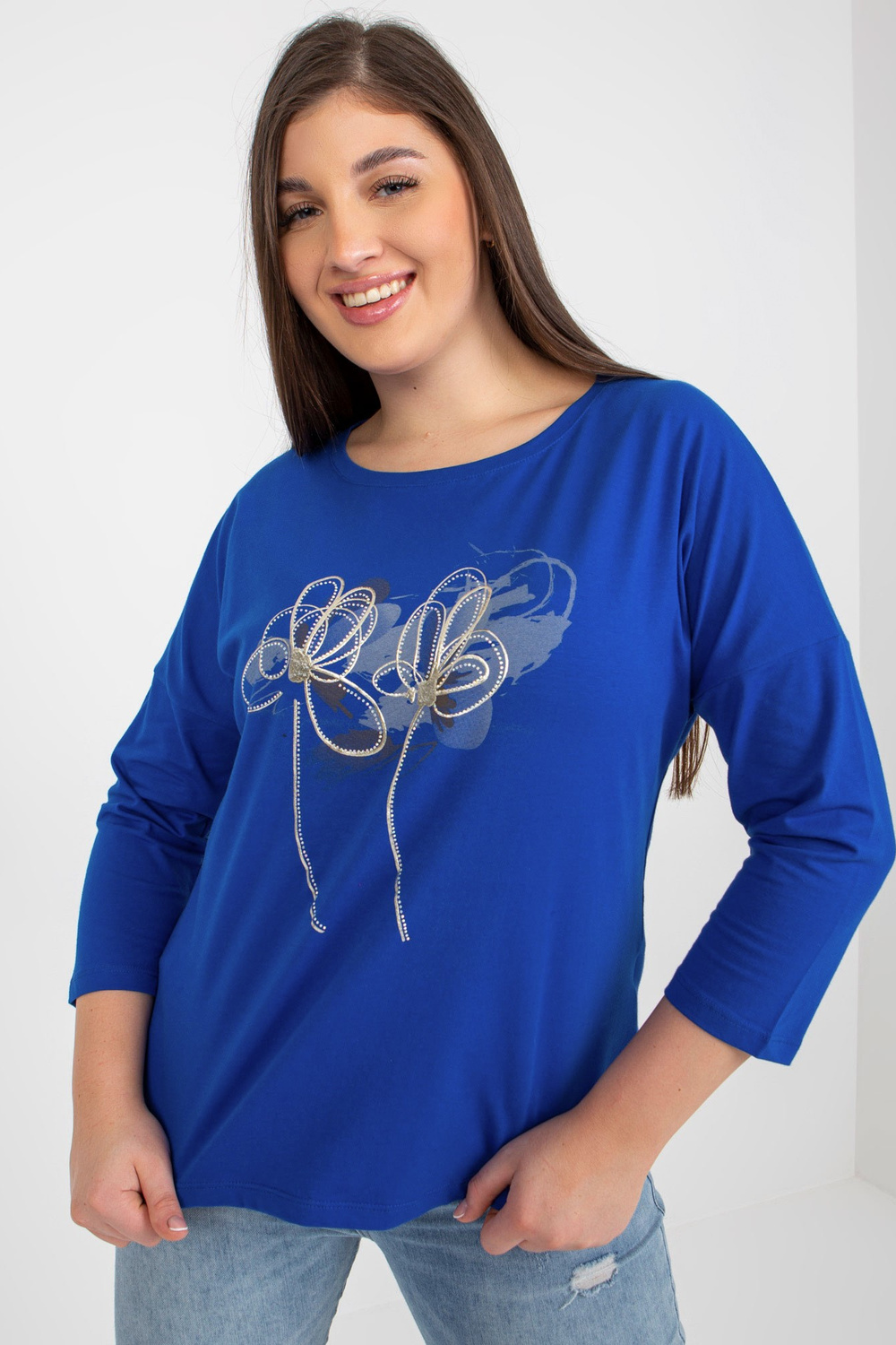 Tamsiai mėlyna plius dydžio moteriška palaidinė su raštu ir akmenukais.