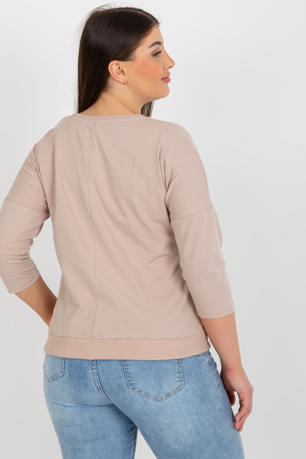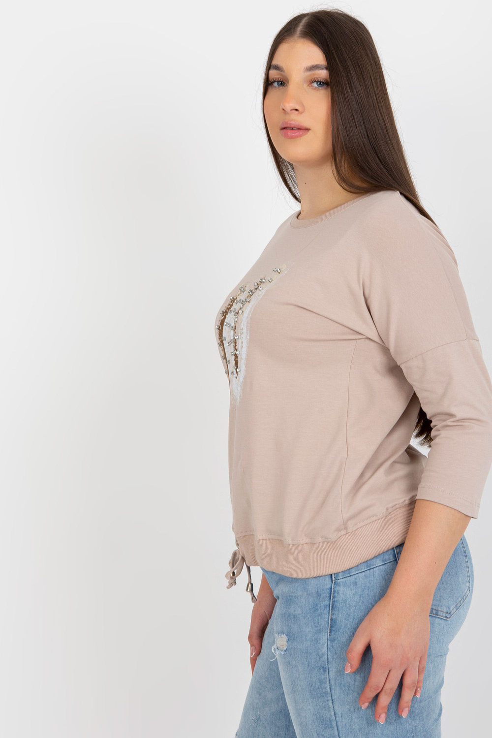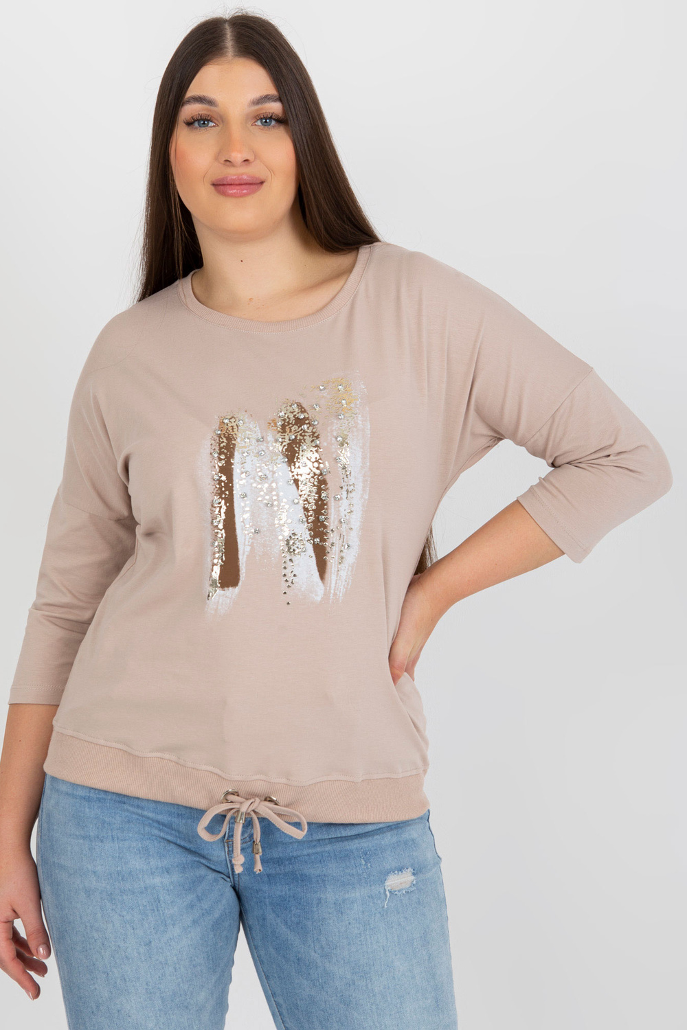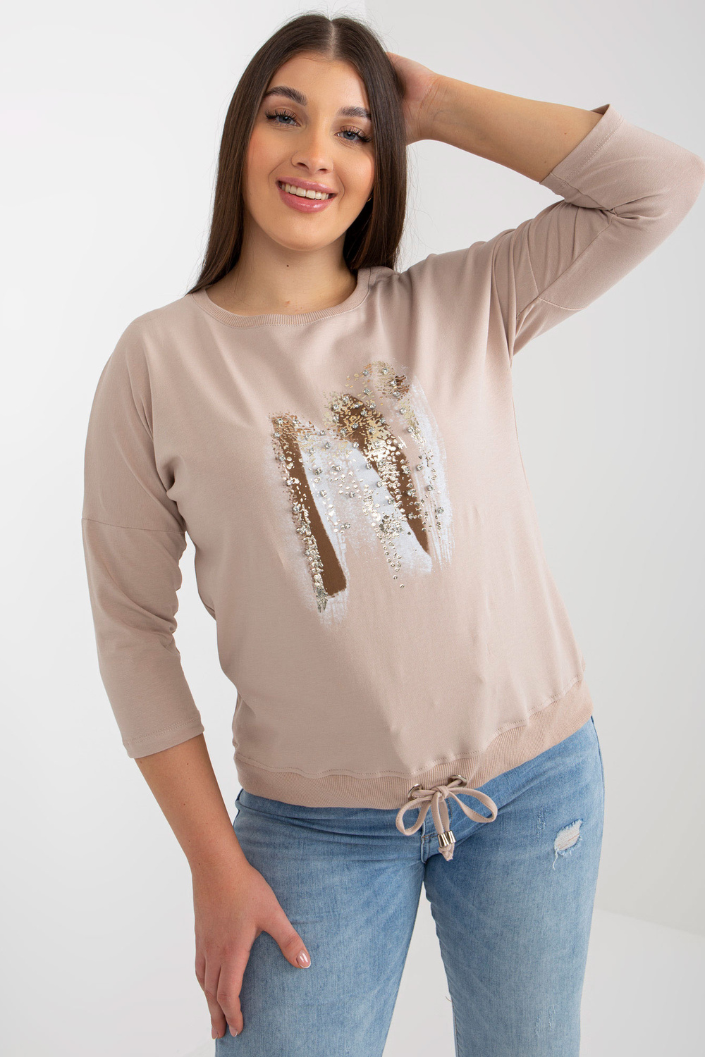 Smėlio ir rudos spalvos plius dydžio moteriška palaidinė su cirkonio oksidu.