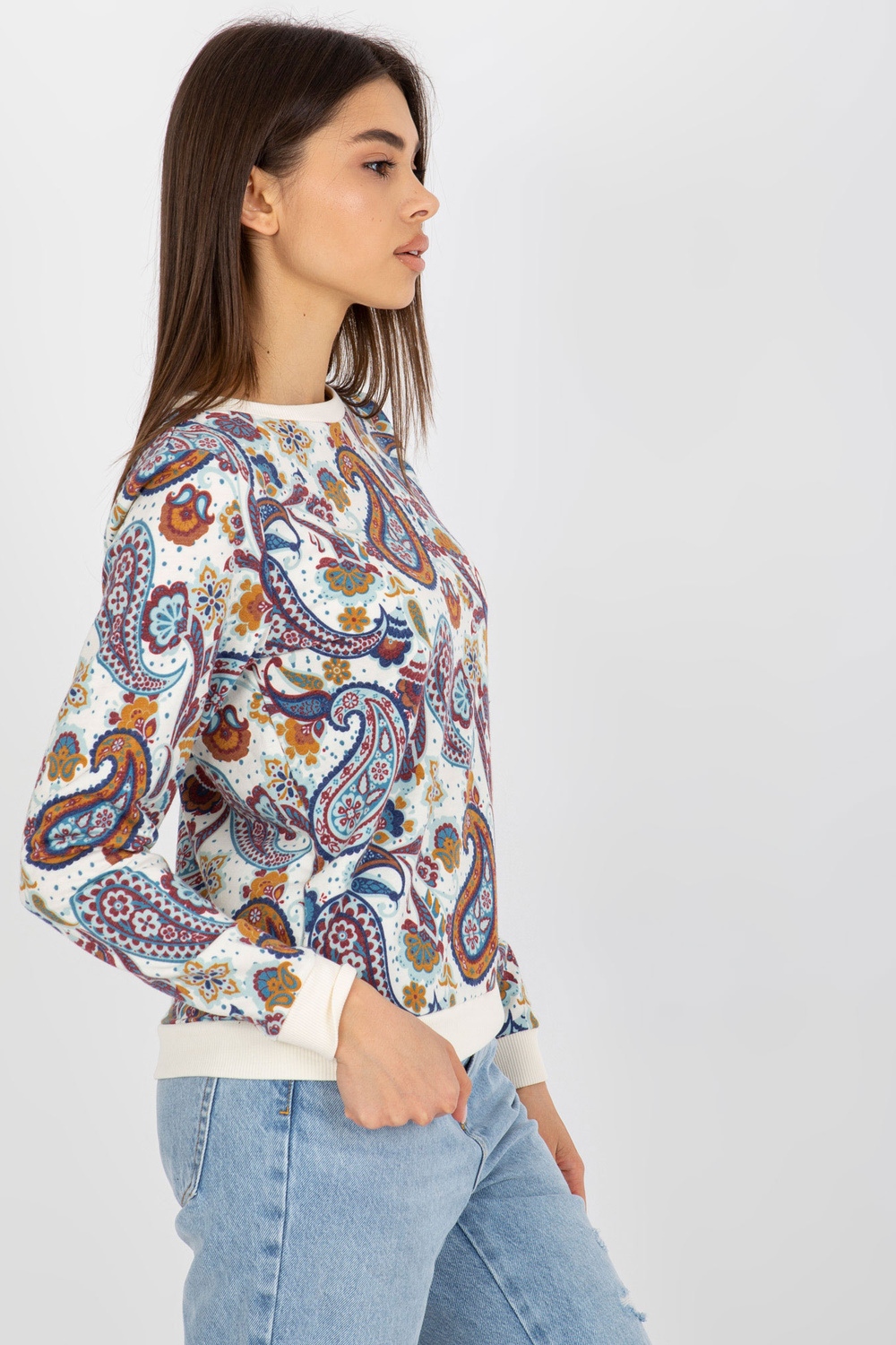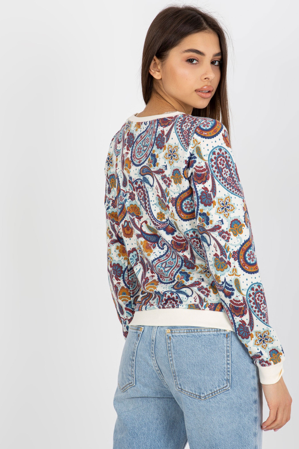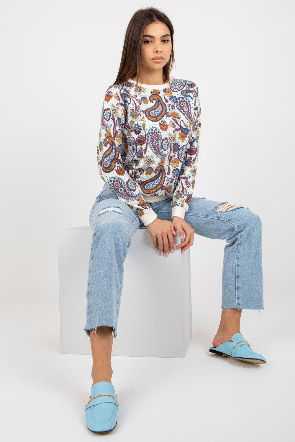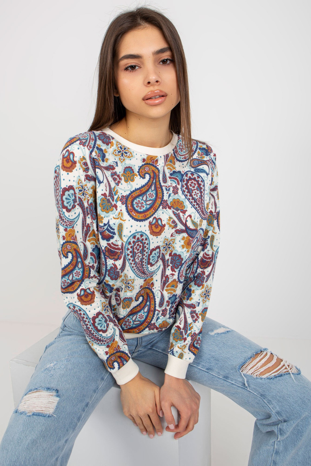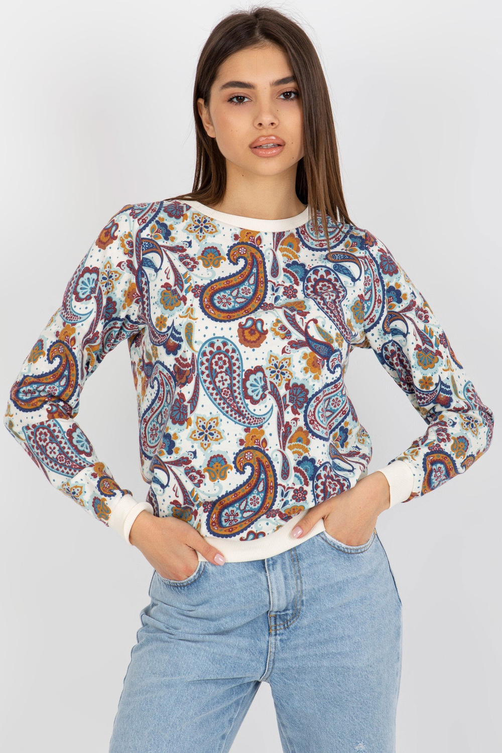 Ecru-mėlyno rašto megztinis su apvalia iškirpte