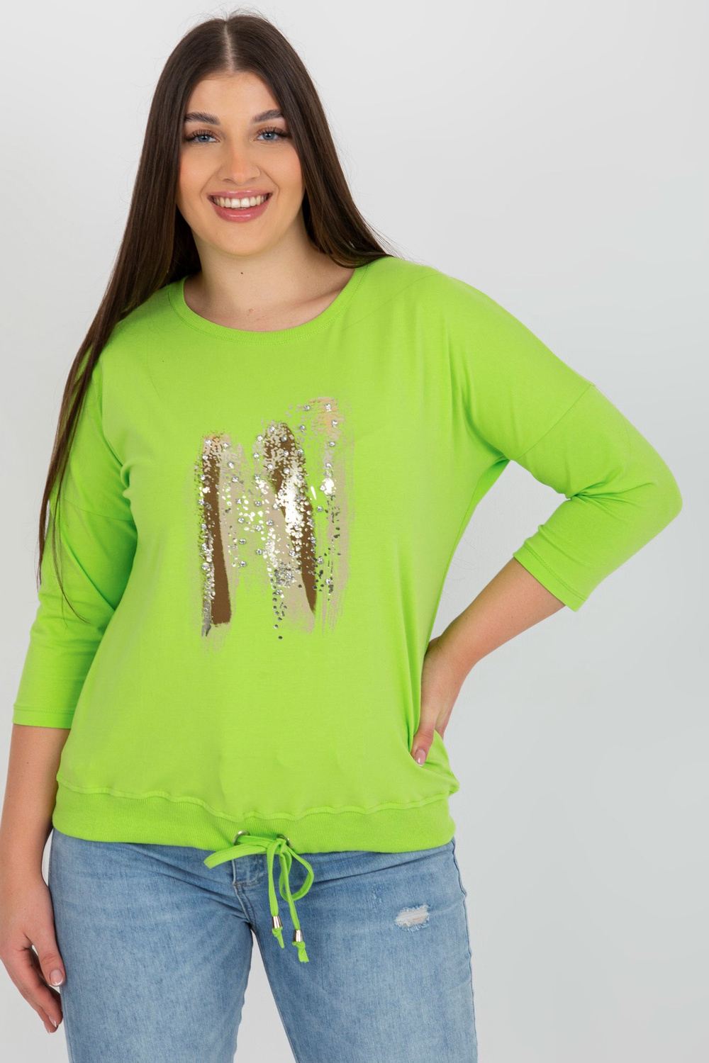 Lime moteriška didelio dydžio palaidinė su raišteliu. Prekės kodas: RV-BZ-8182.03X Dominuojantis raštas: spauda, aplikacija Stilius: laisvalaikis: laisvalaikis, į miestą, pasivaikščioti, į darbą Modelis dėvi vieno dydžio dydį. Modelio matmenys: aukštis 174 cm, krūtinė 100
