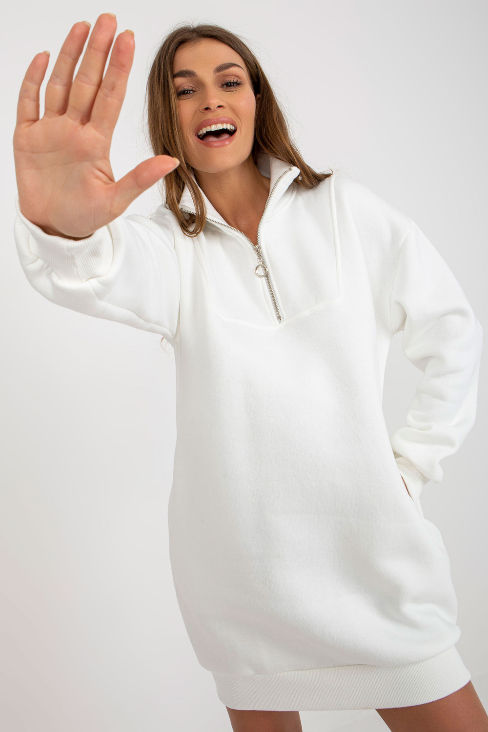 Modelis dėvi vieno dydžio dydį. Modelio išmatavimai: ūgis 170 cm, krūtinė 93 cm, juosmuo 66 cm, klubai 93 cm.