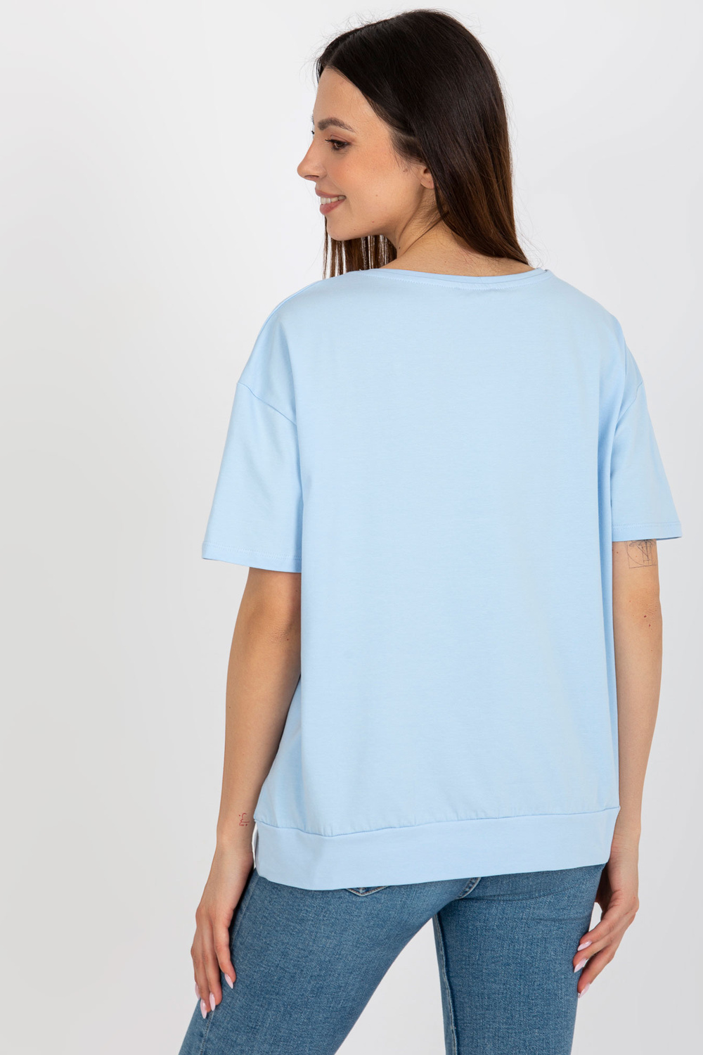 Šviesiai mėlyna moteriška per didelė medvilninė palaidinė.