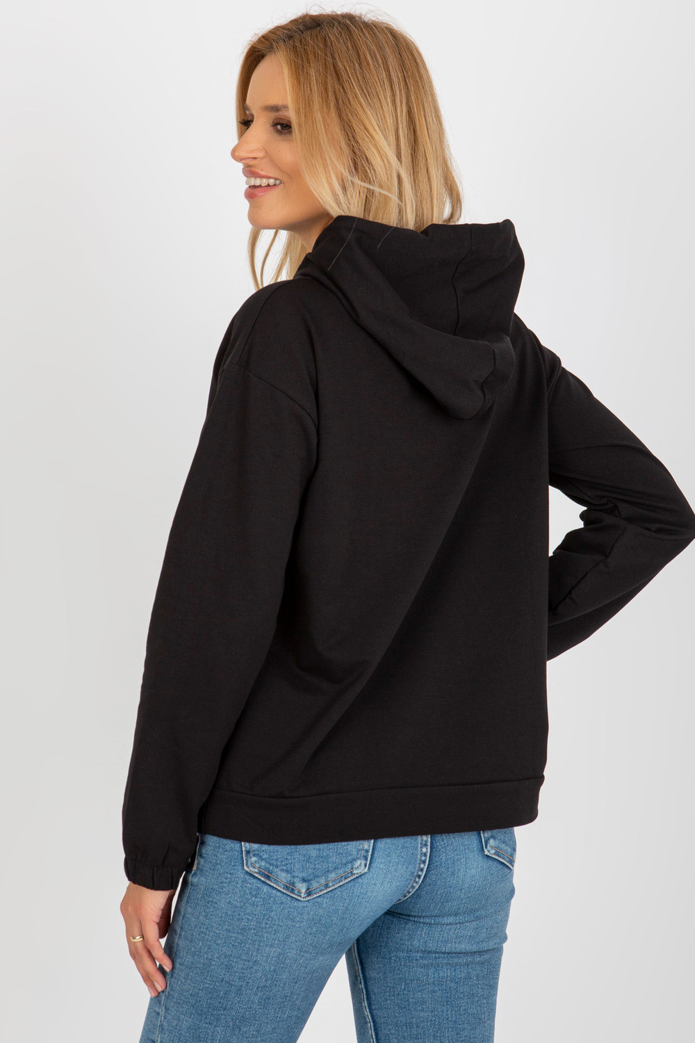 Juodas kengūros megztinis su gobtuvu.