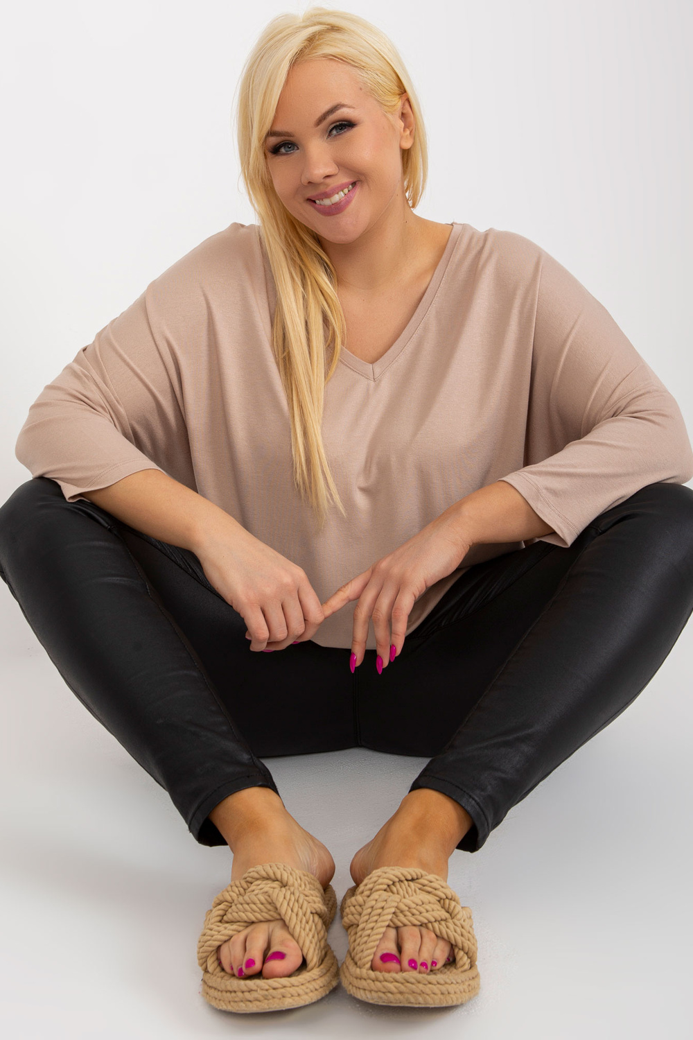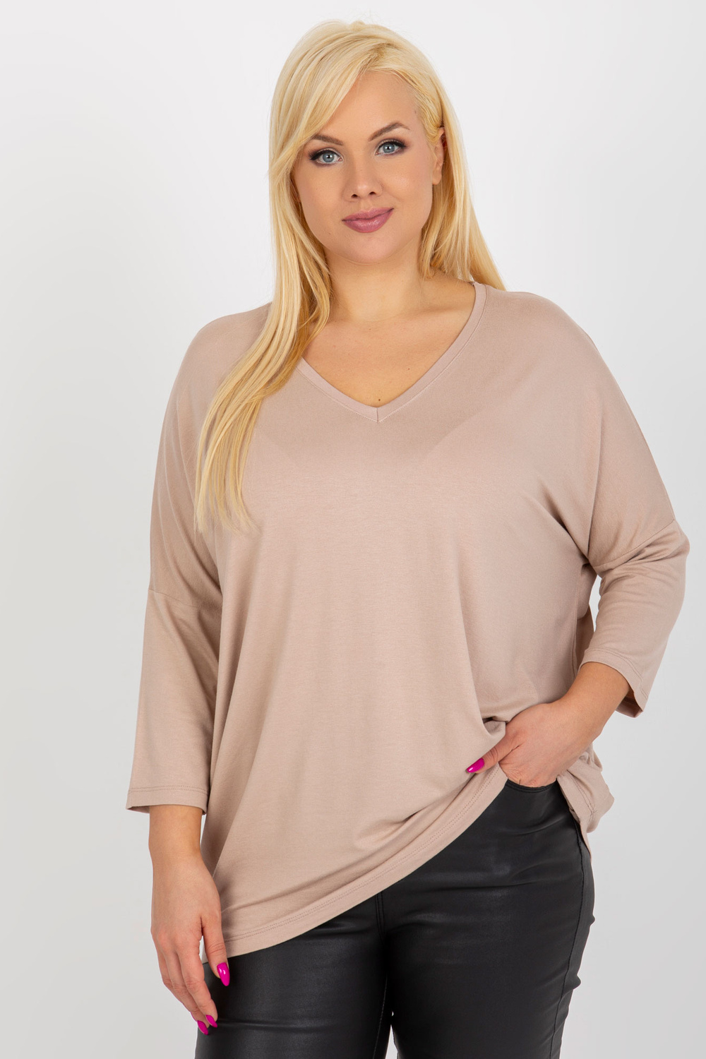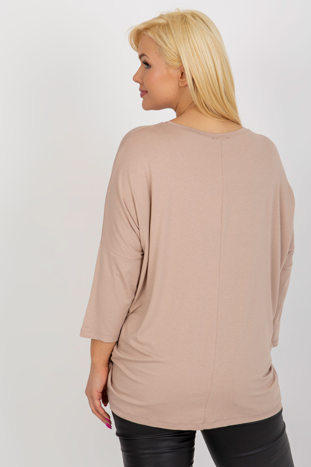Modelis dėvi vieno dydžio dydį. Modelio išmatavimai: ūgis 172 cm, krūtinė 103 cm, juosmuo 73 cm, klubai 103 cm.