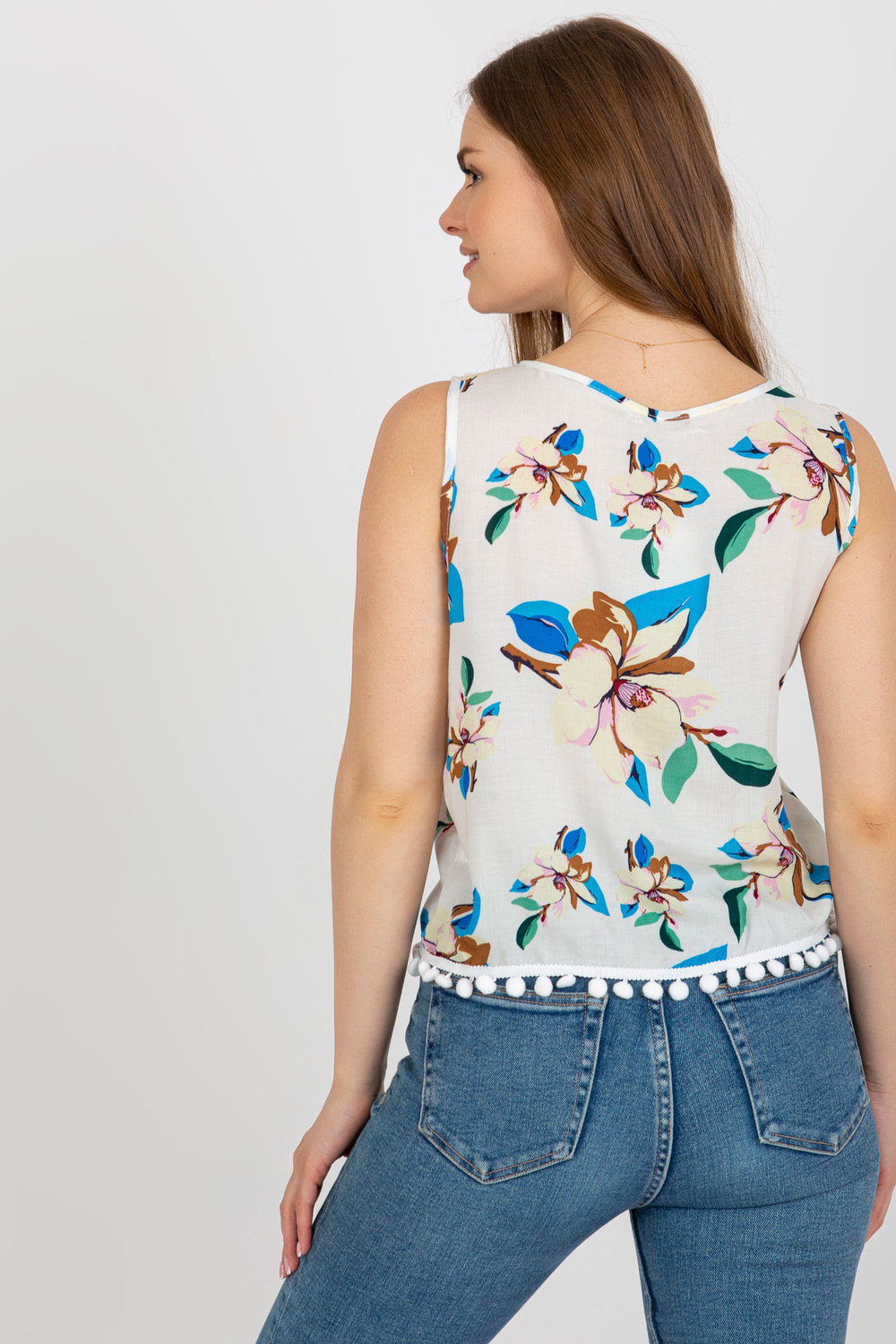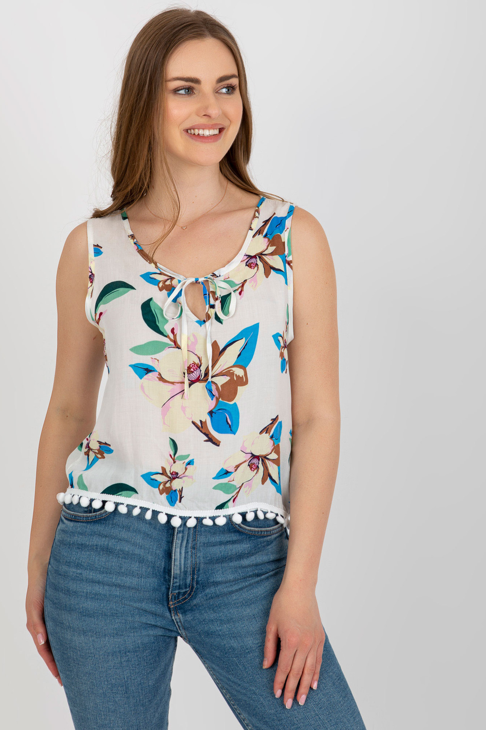 Balta palaidinė su gėlėtu kaklaraiščiu ties iškirpte.