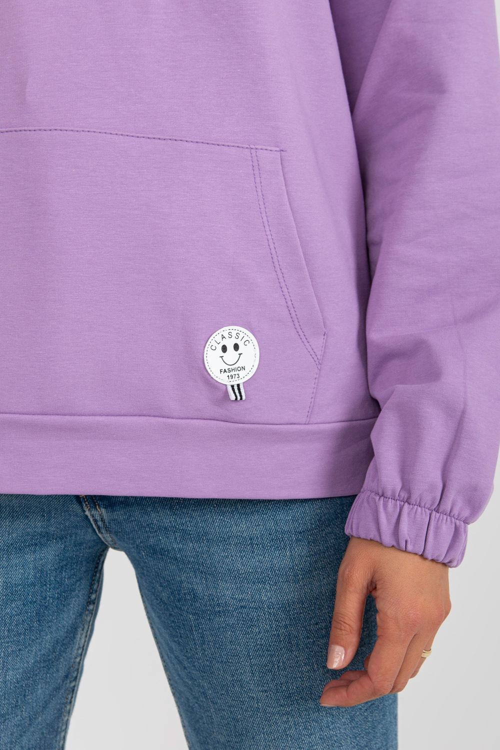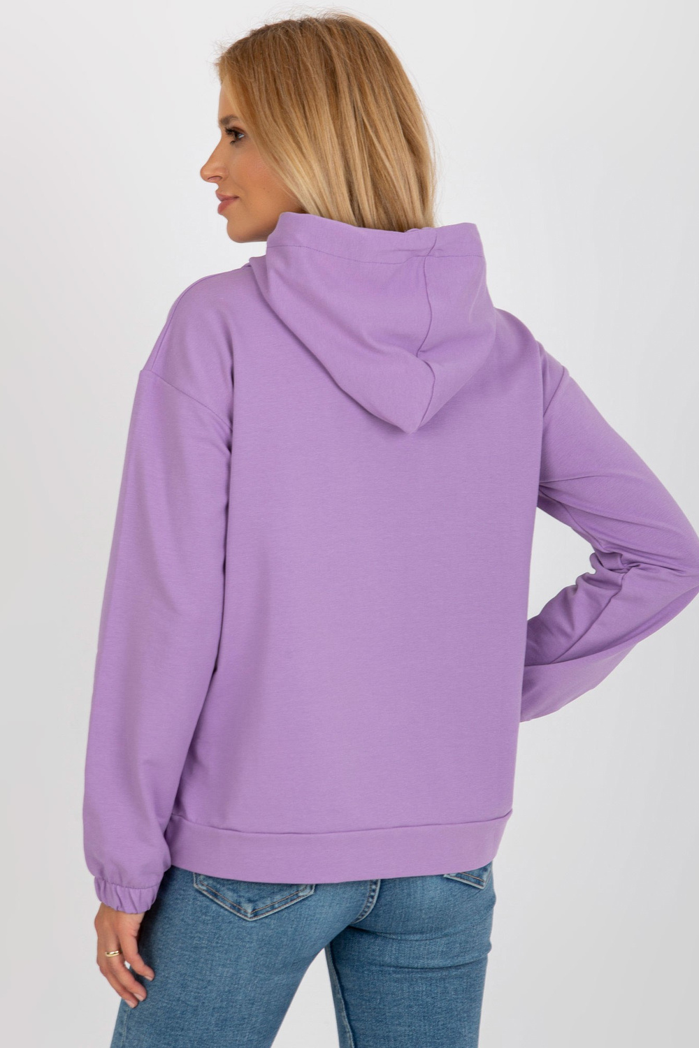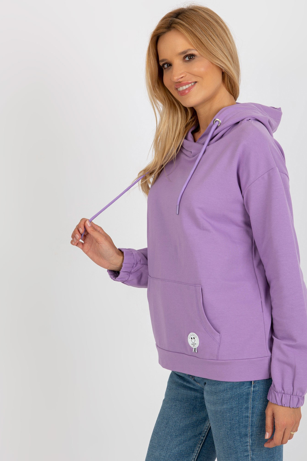 Šviesiai violetiniai moteriški megztiniai su kengūra su lopinėliu.