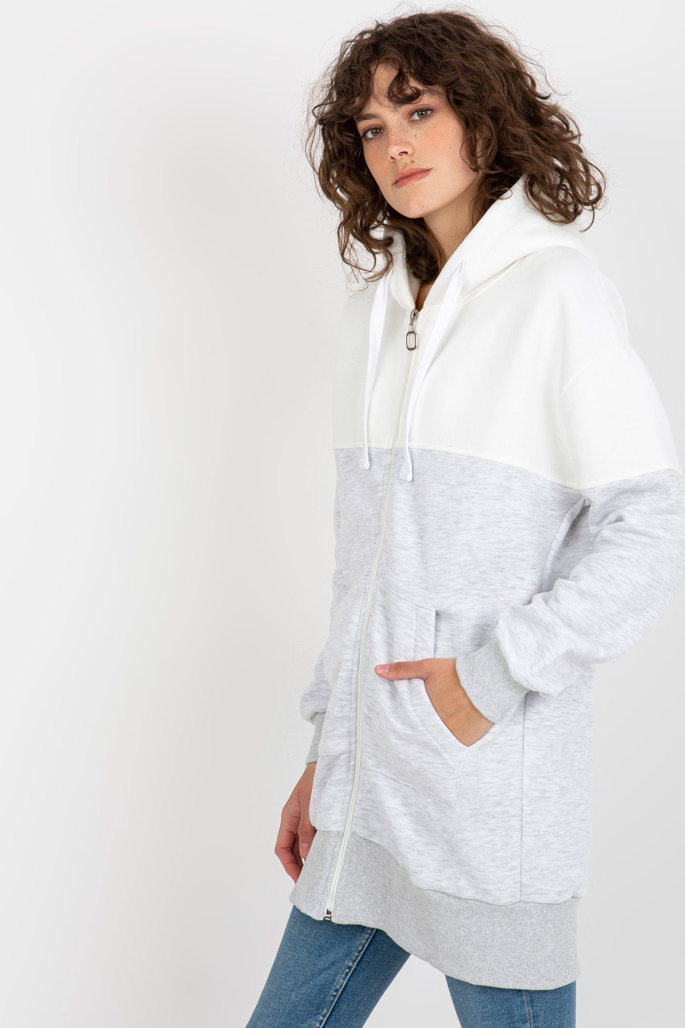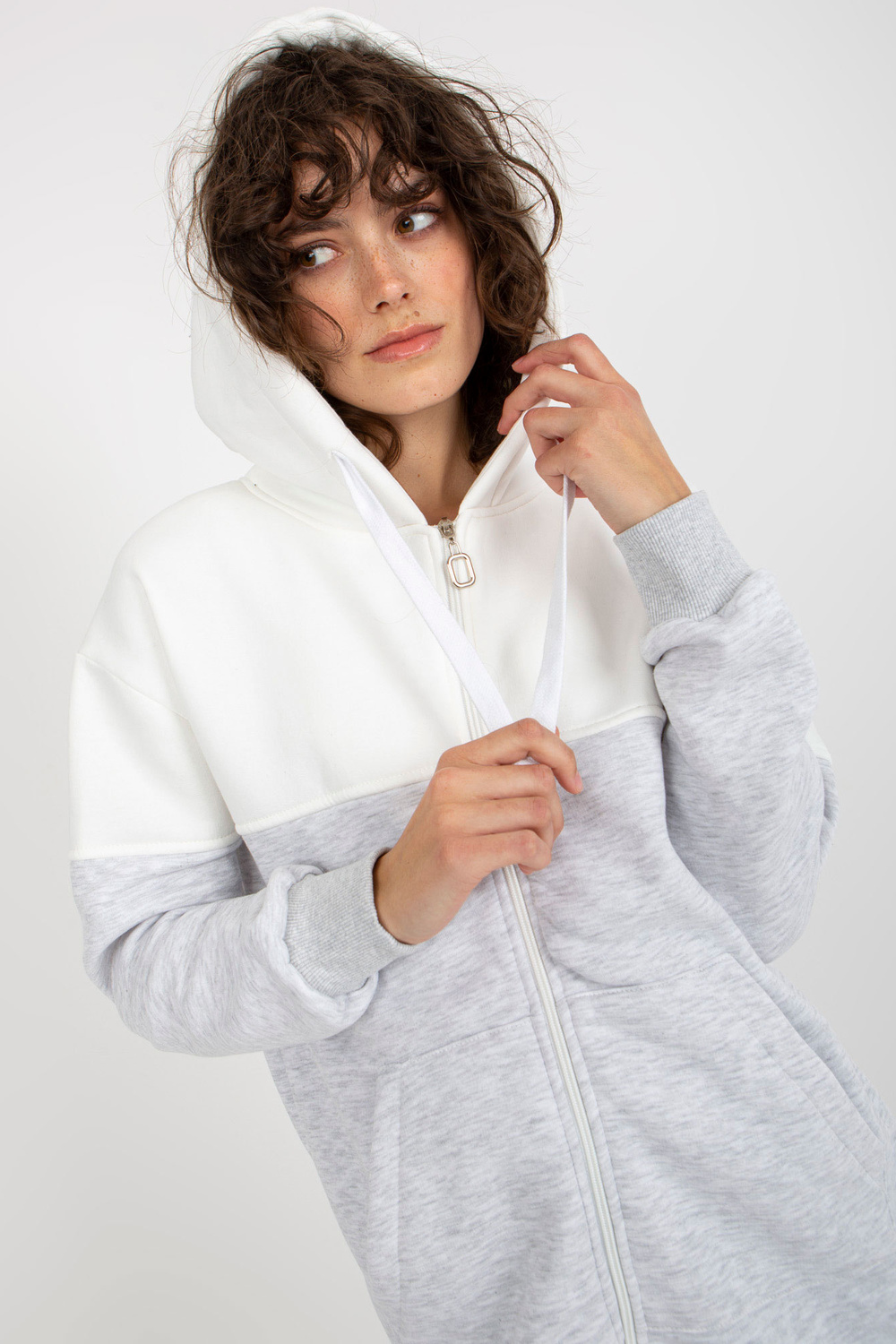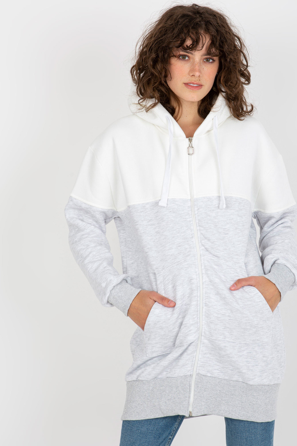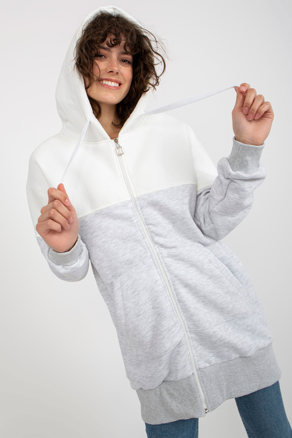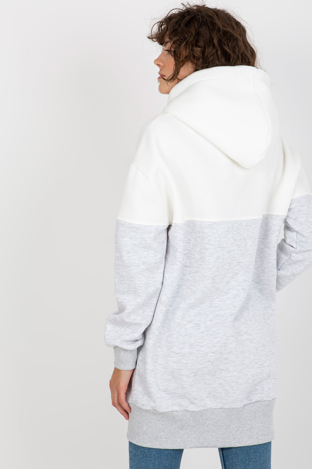 Paprastas nespalvotai pilkas megztinis su gobtuvu.