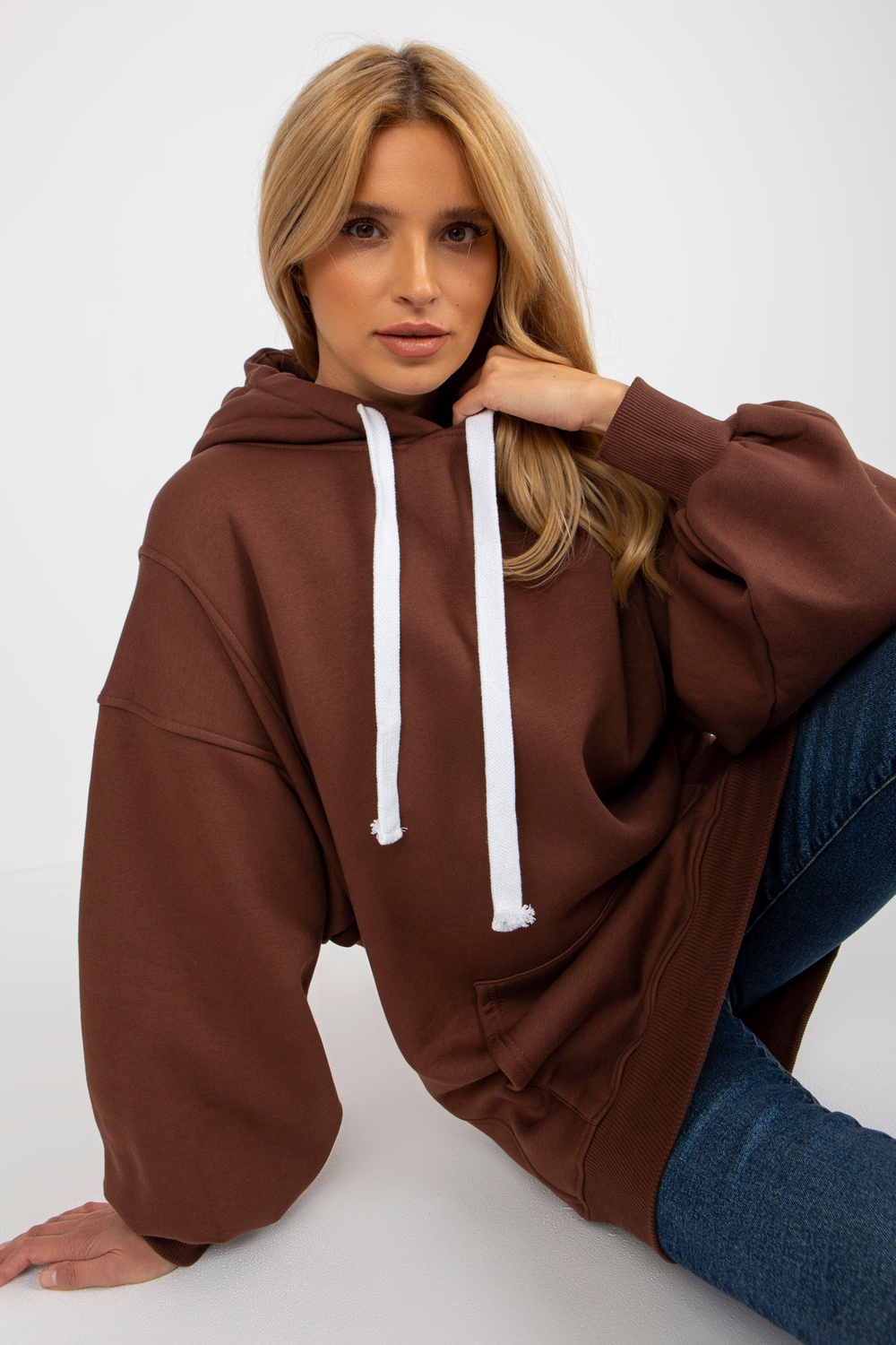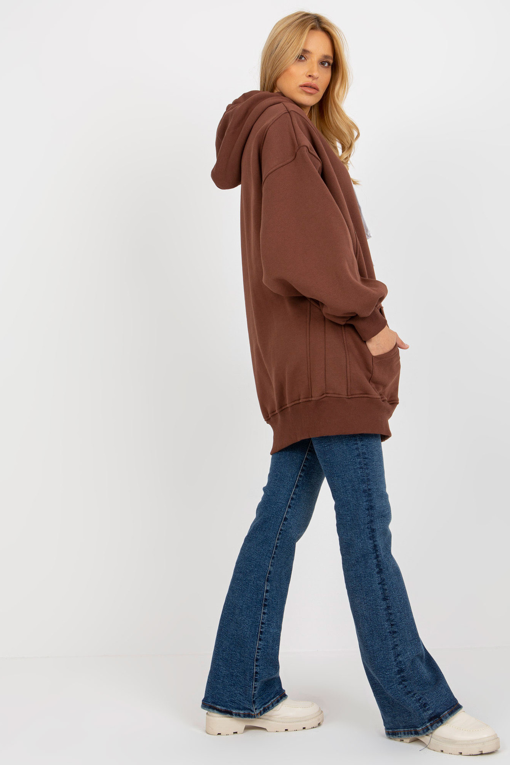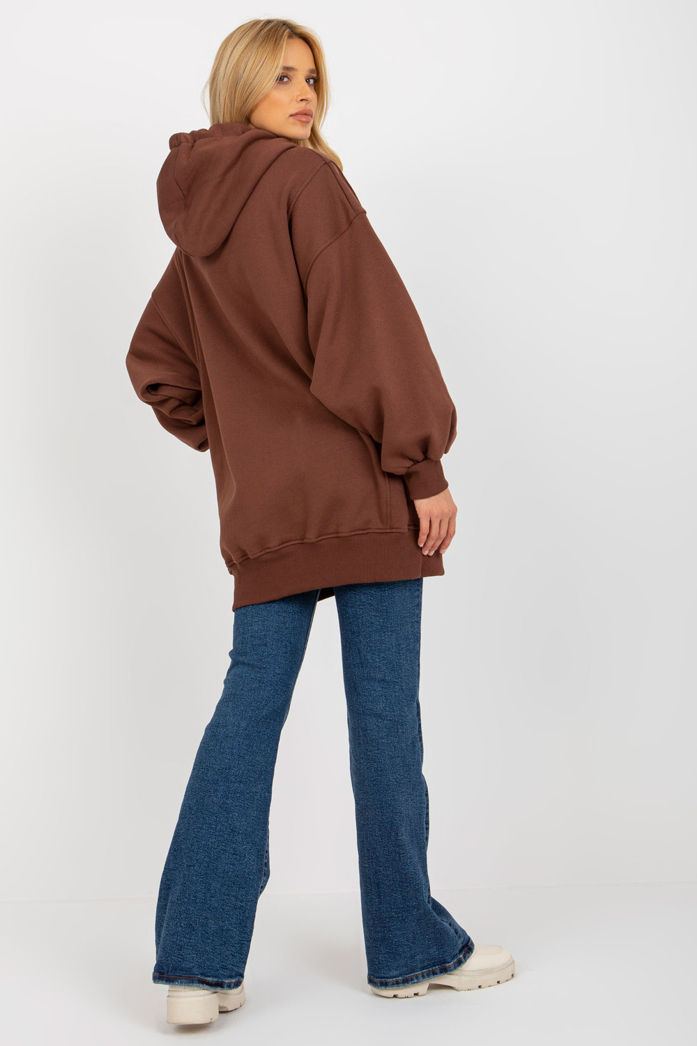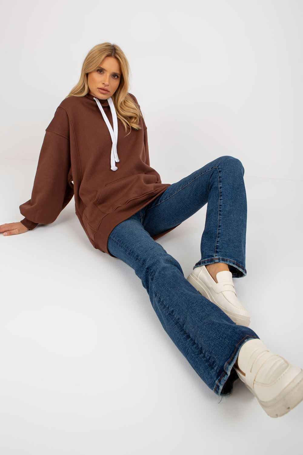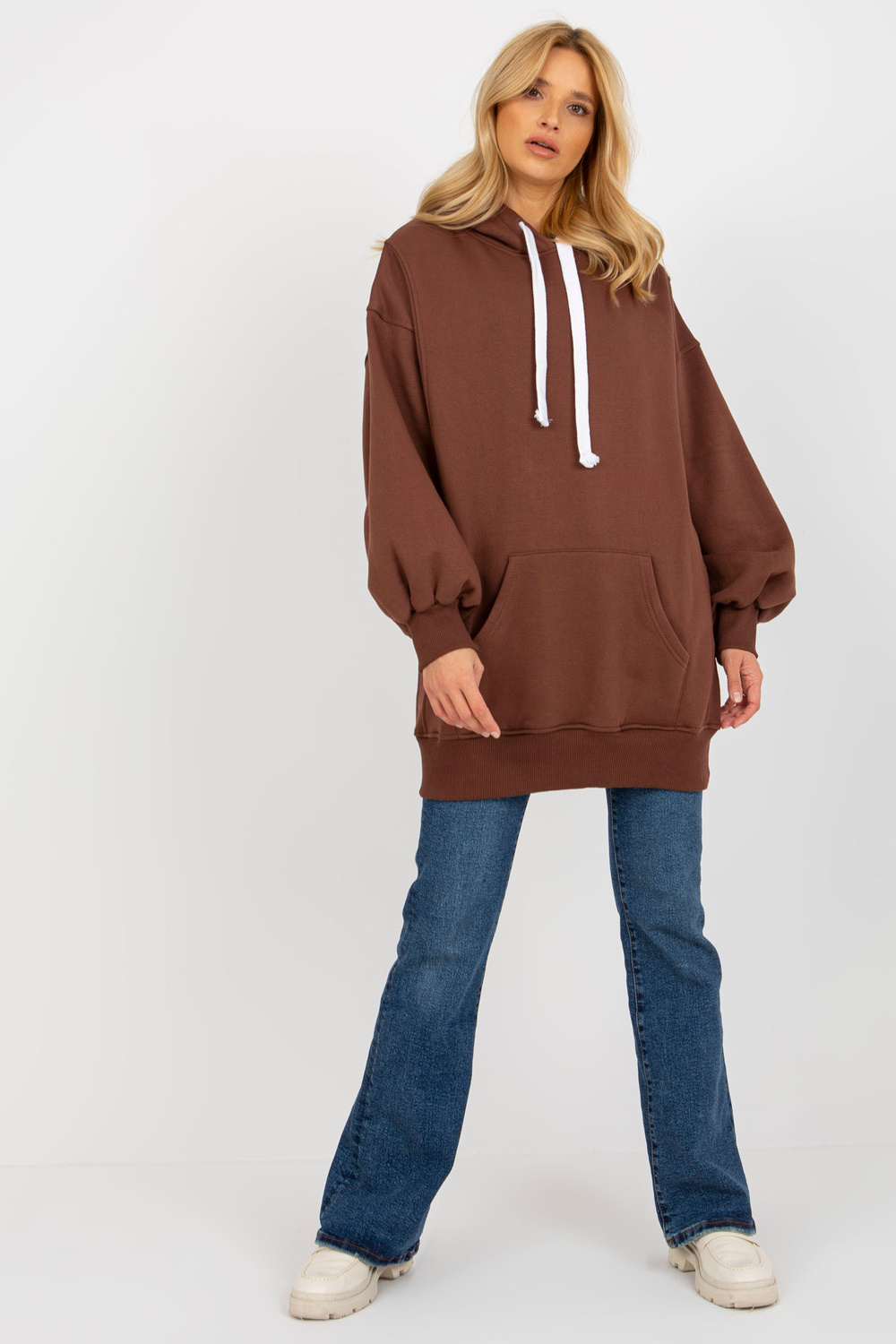 Tamsiai rudas ilgas megztinis, paprastas didelio kirpimo.