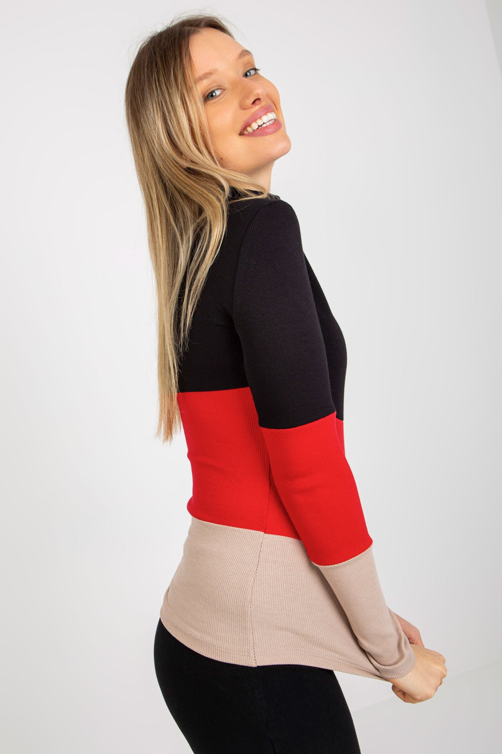 Juodos ir smėlio spalvos moteriška bazinė palaidinė su briaunomis.