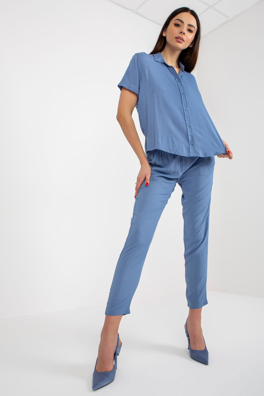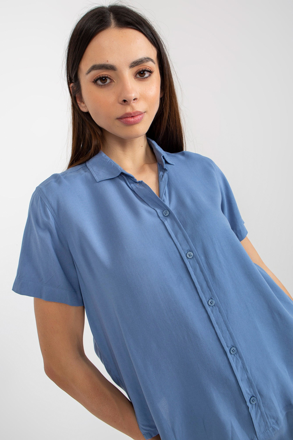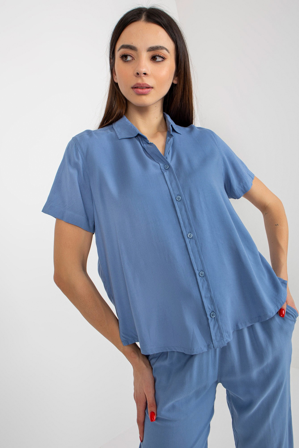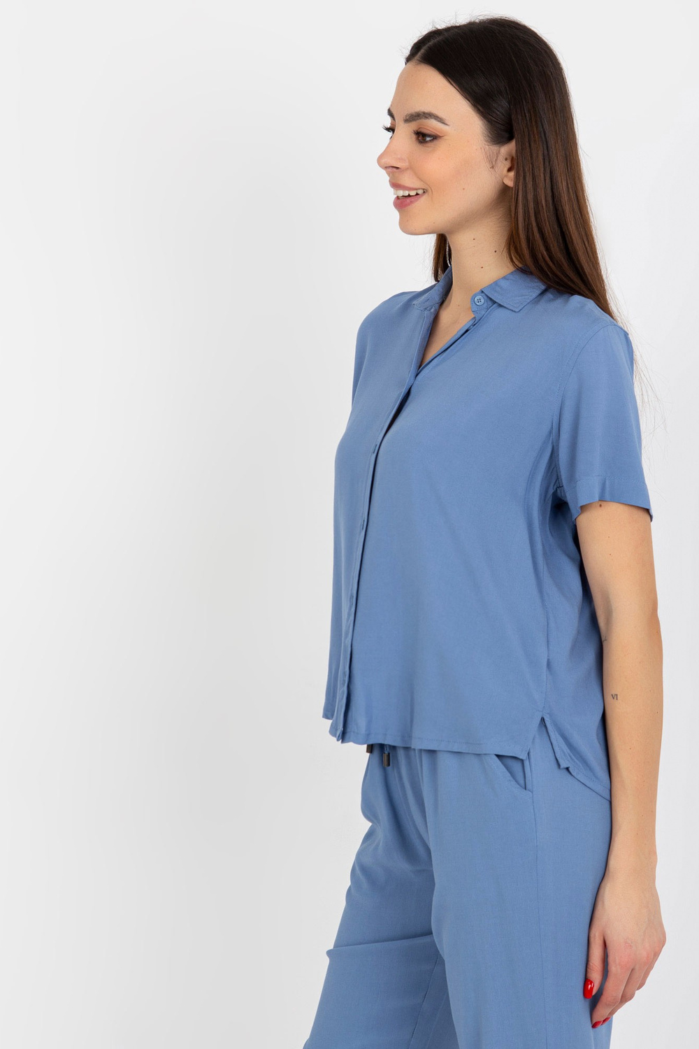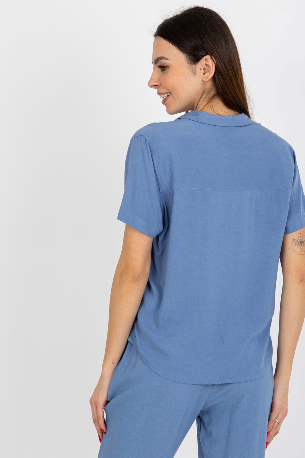 Mėlynos spalvos megztinių marškinių palaidinė su žema apykakle