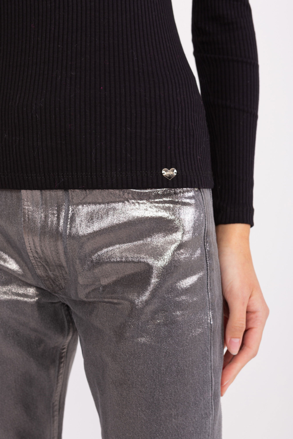 Paprasta juoda dryžuota palaidinė ilgomis rankovėmis V formos iškirpte .