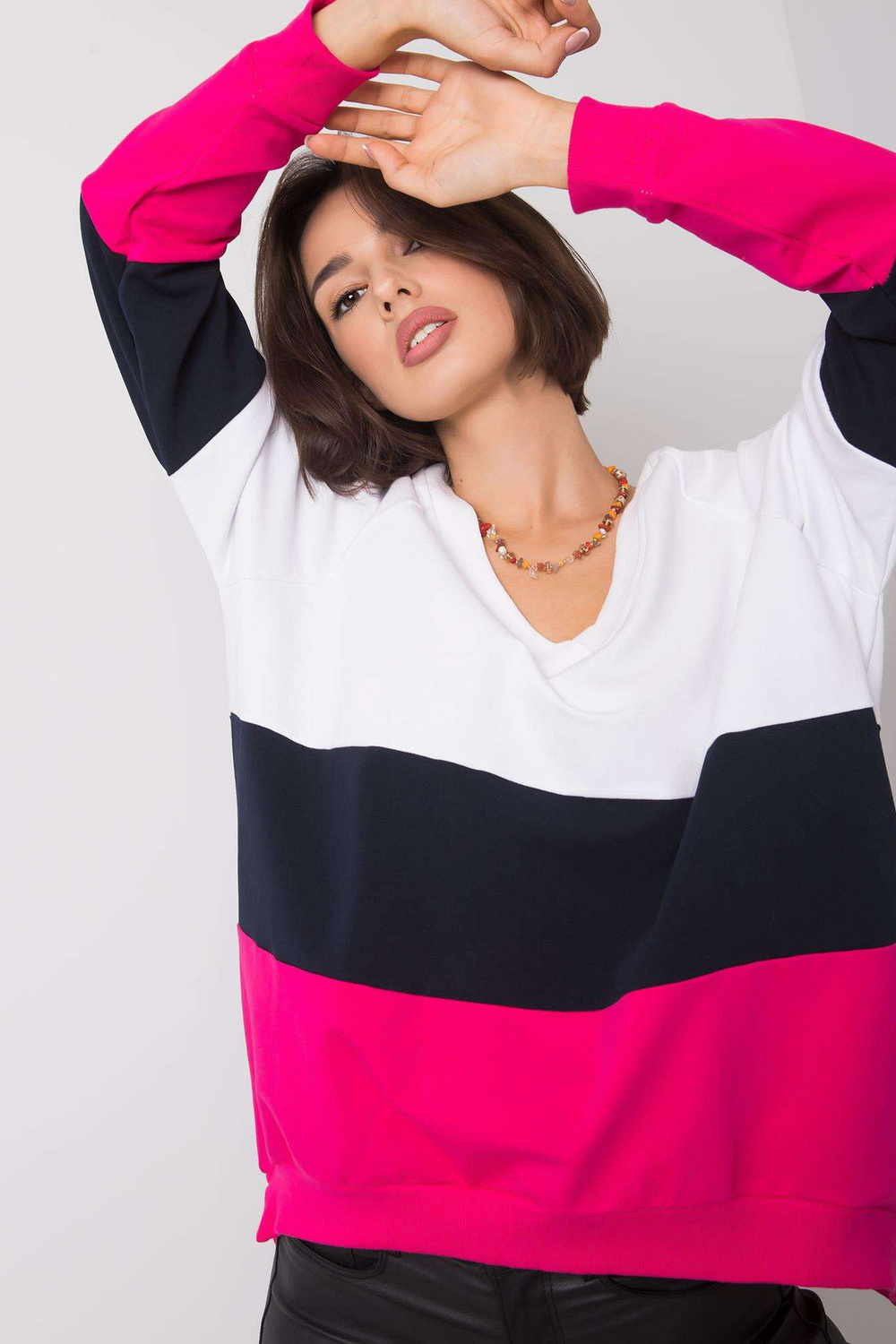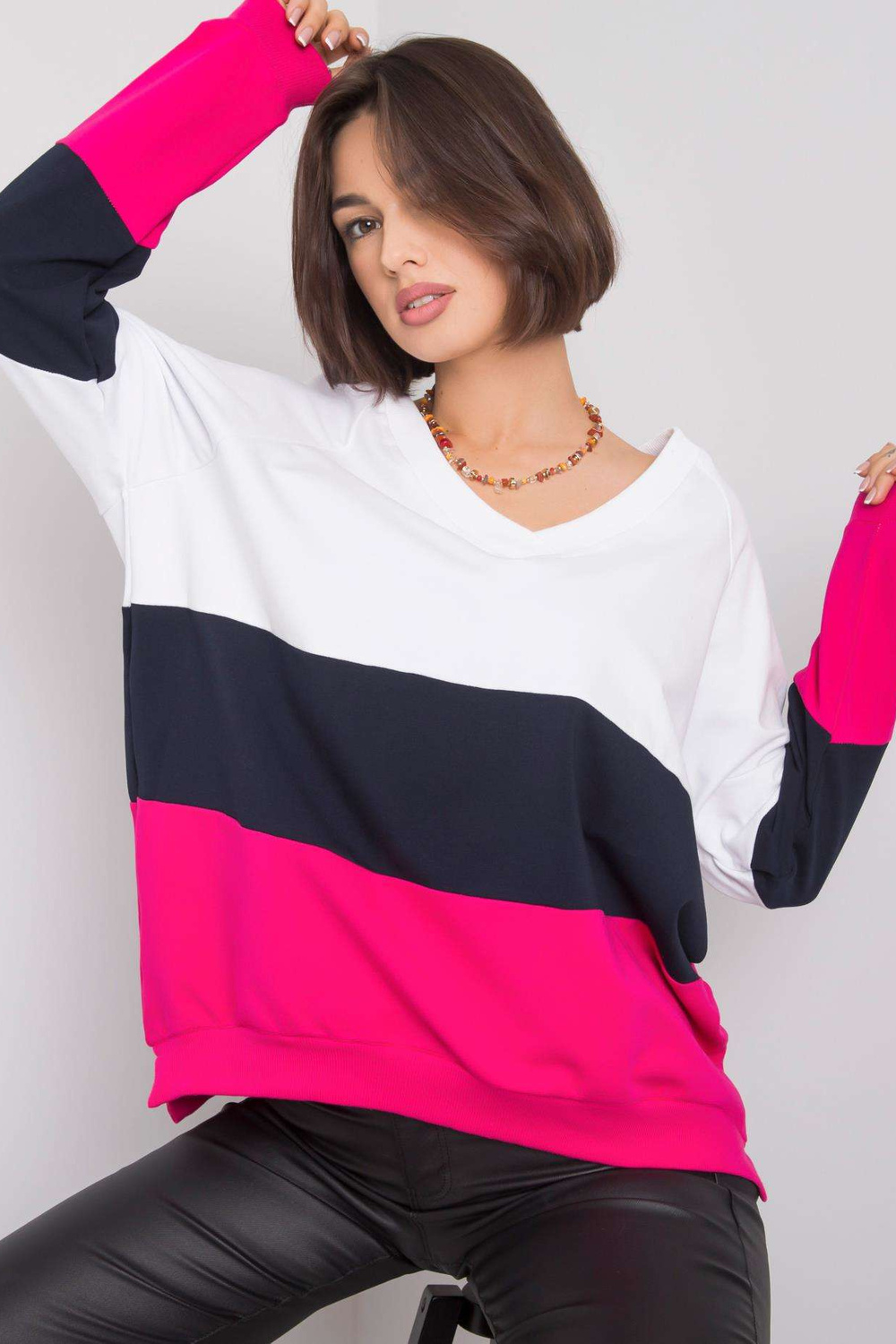 Modelis dėvi S dydį /M. Modelio matmenys: aukštis 163 cm, krūtinė 85 cm, juosmuo 69 cm, klubai 84 cm.