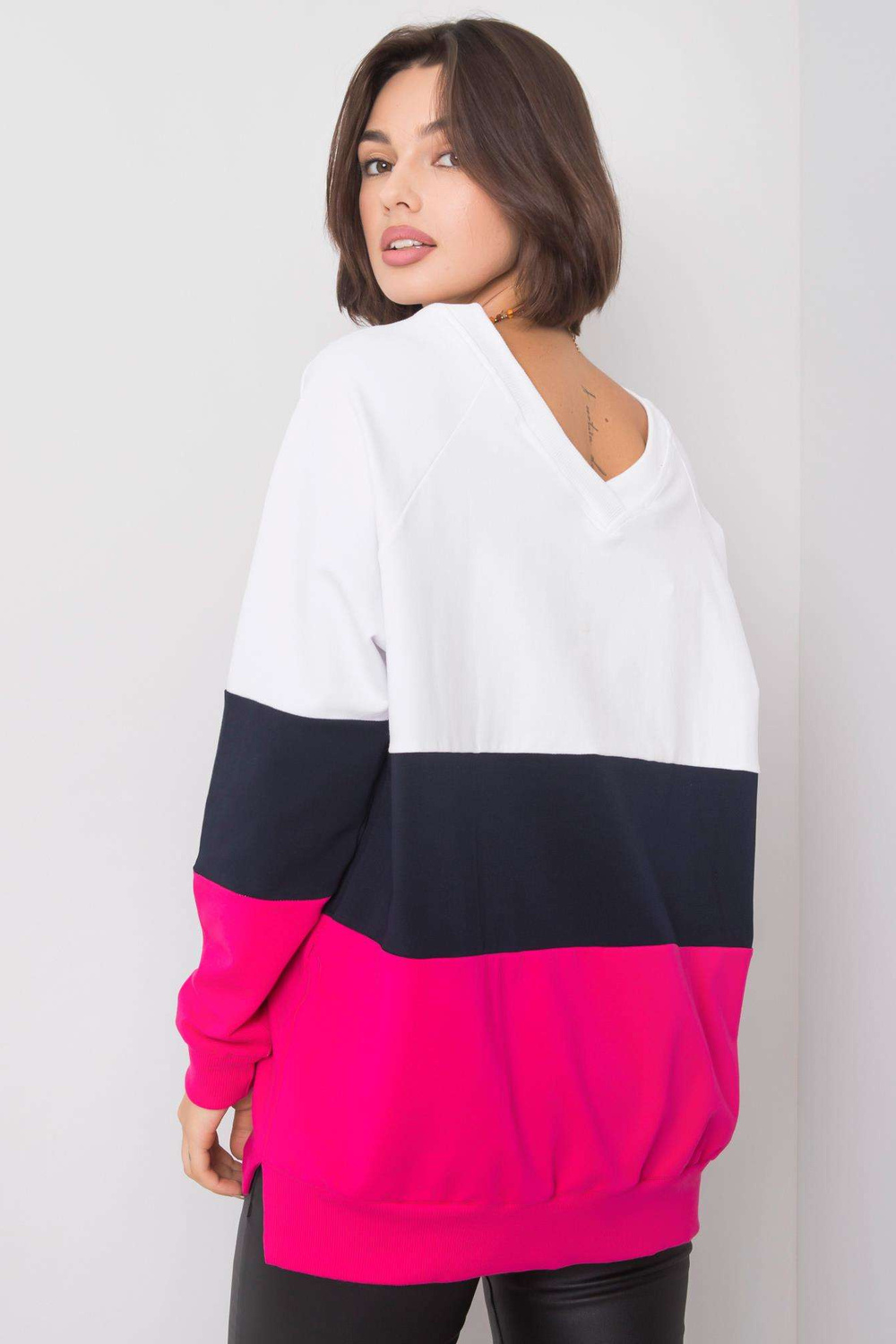 S/M dydžio megztinio matmenys, matuojami plokščiai: plotis po pažastimis - 63 cm, bendras ilgis - 69 cm, rankovių ilgis - 60 cm