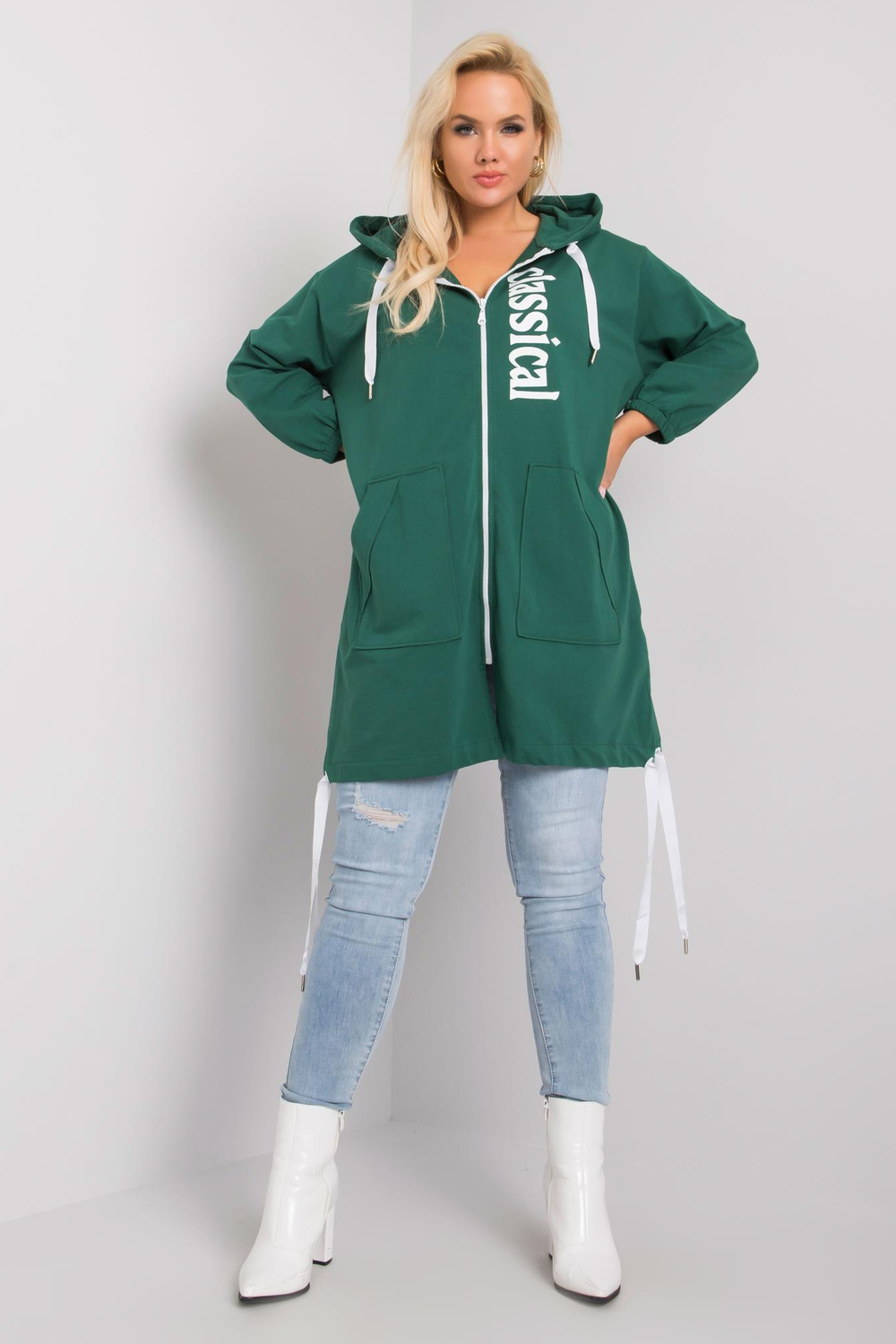 Tamsiai žalios spalvos plius dydžio megztinis su Stacy gobtuvu.