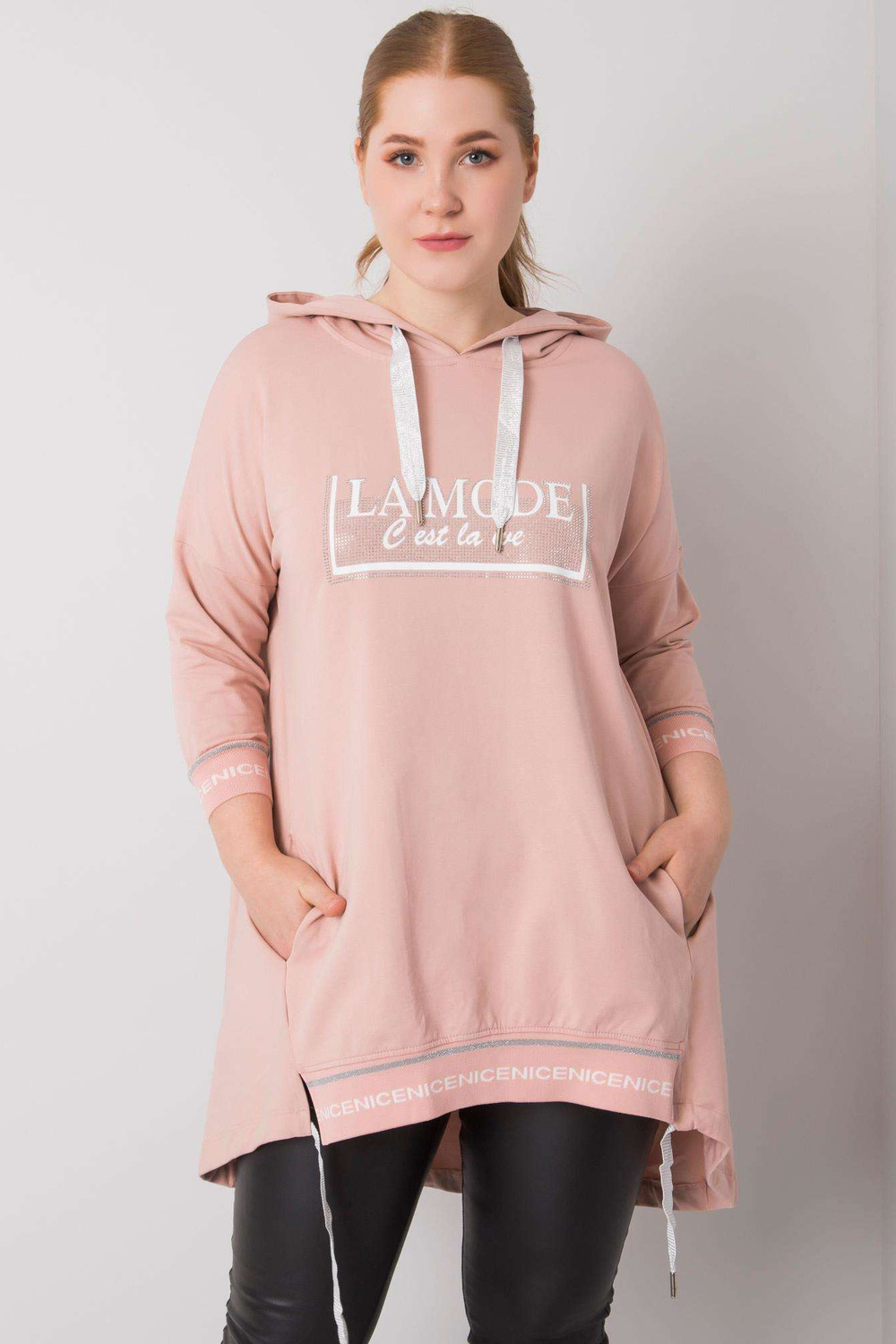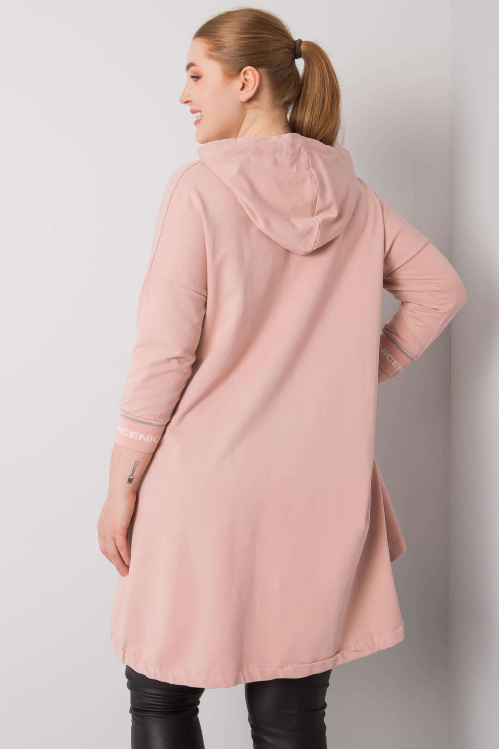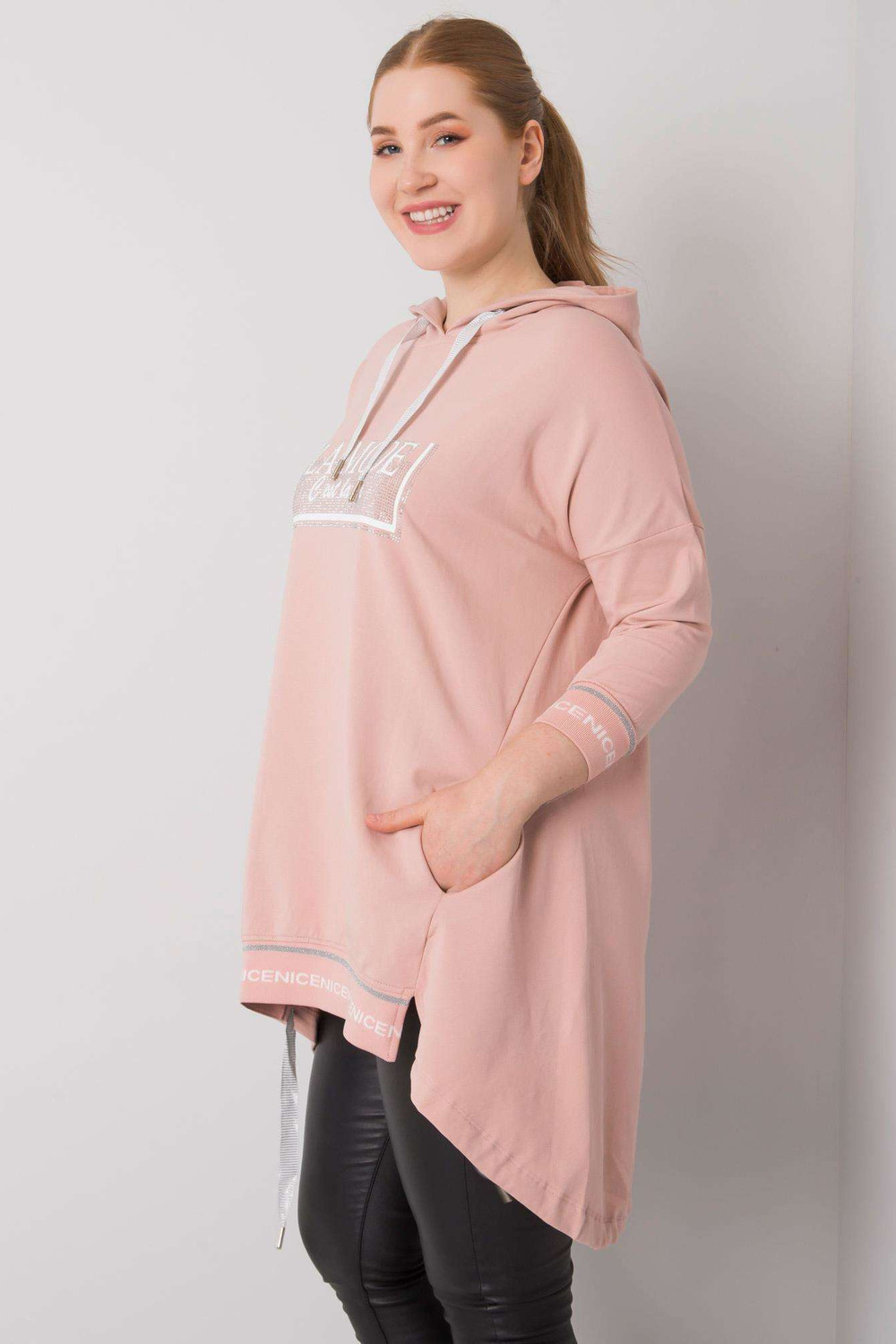 Purvinas rožinis megztinis su Belina aplikacijomis.