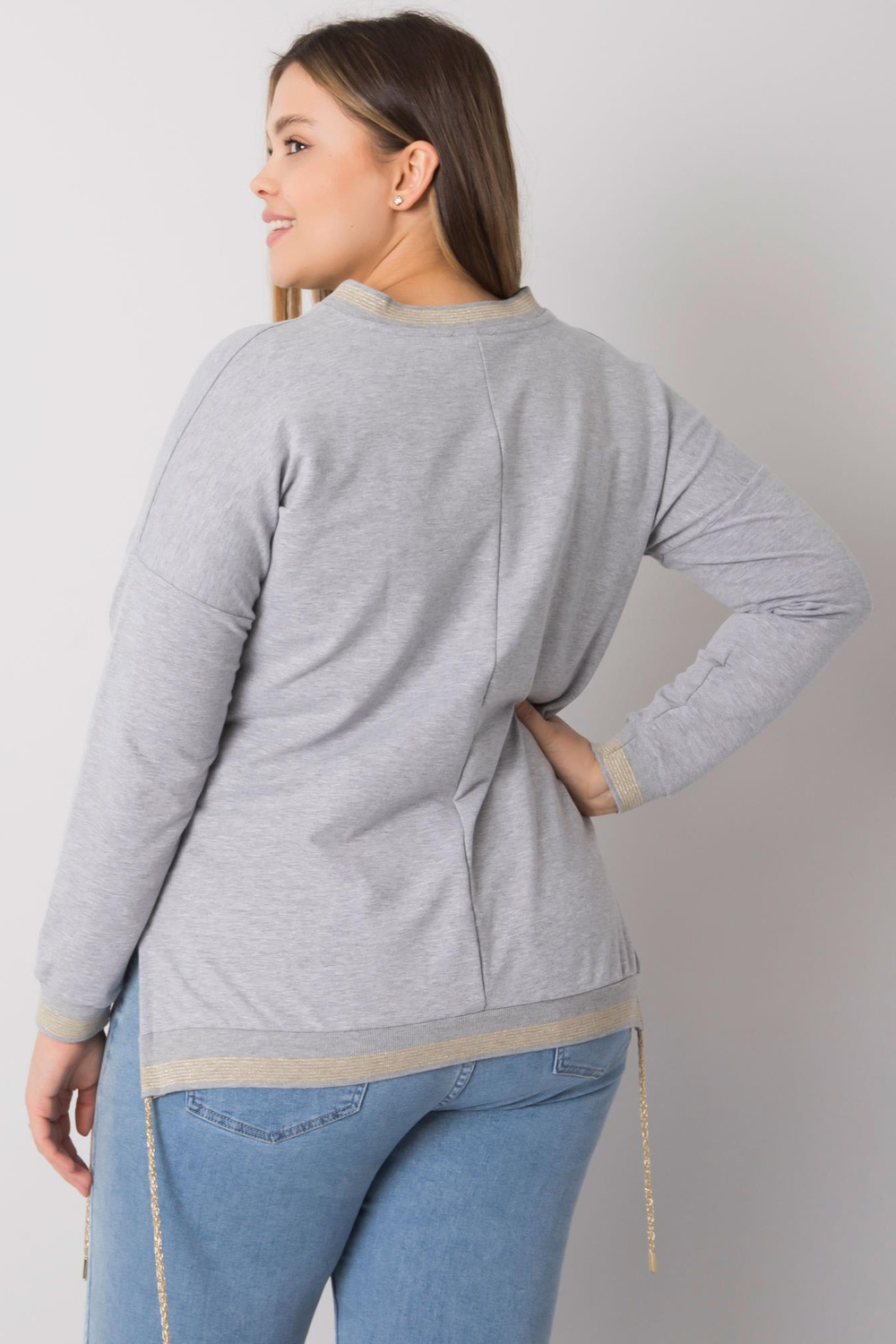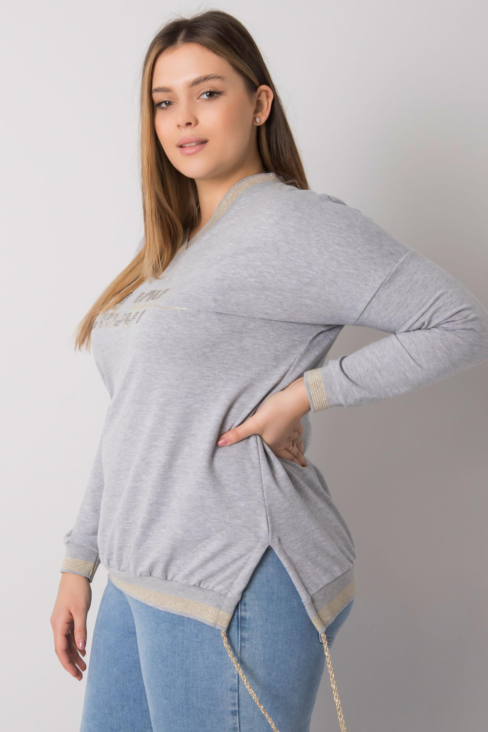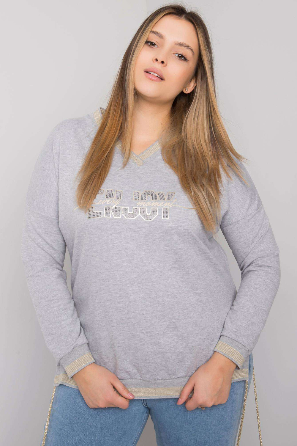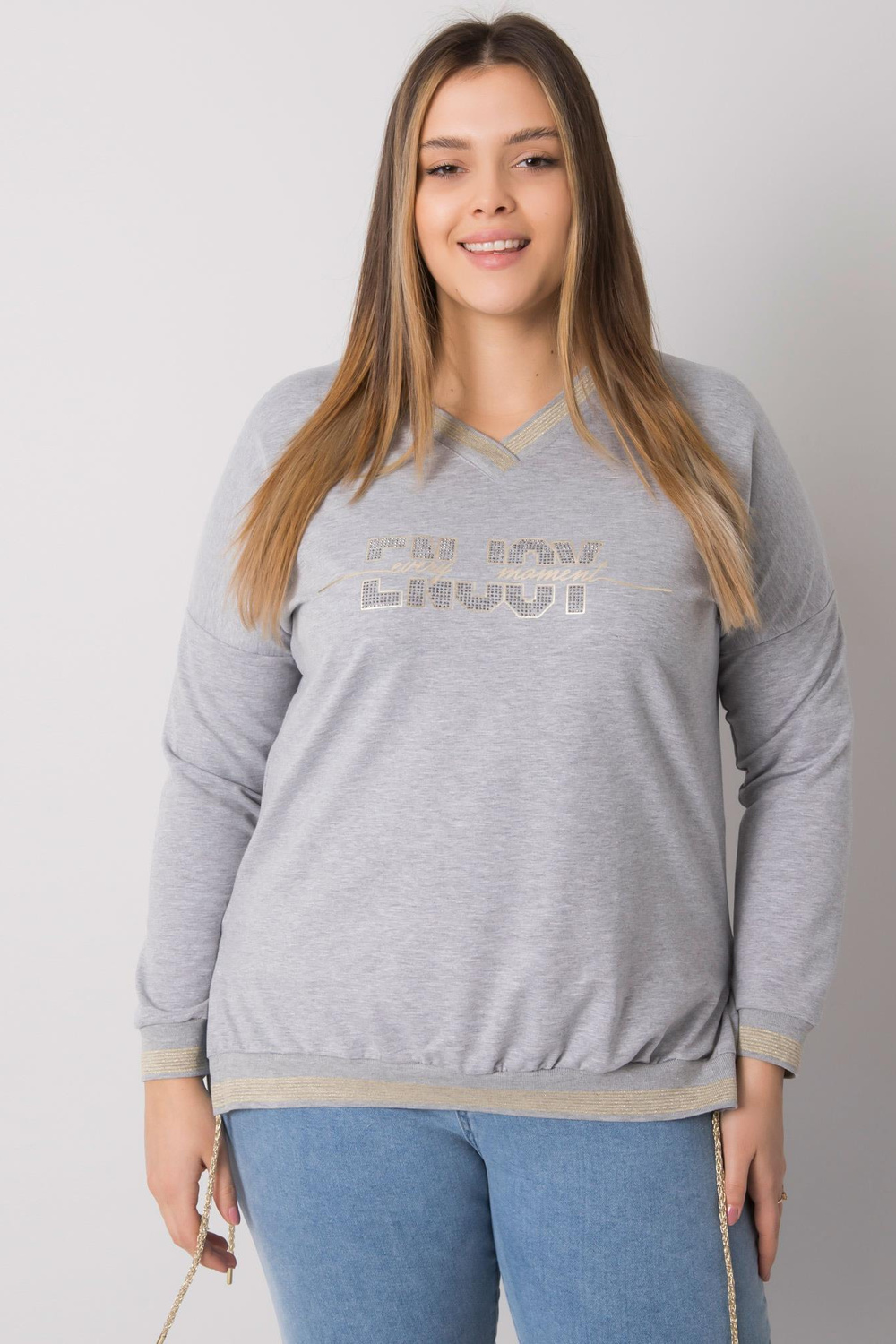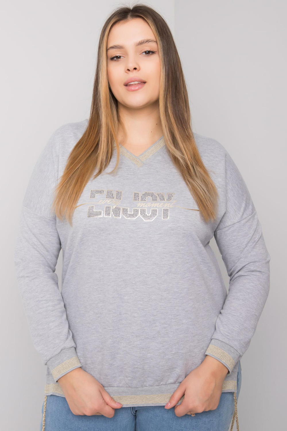 Greymelange plius dydžio palaidinė su Lila aplikacijomis. medžiagasudėtis: 90% medvilnė, 10% elastanas skalbimo būdas: skalbimas mašina 30°C Gaminio kodas: RV-BZ-7157.87P dominuojantis raštas: spauda (spauda) Stilius: kasdienis Proga: kasdienis, miestui Modelis yra wea