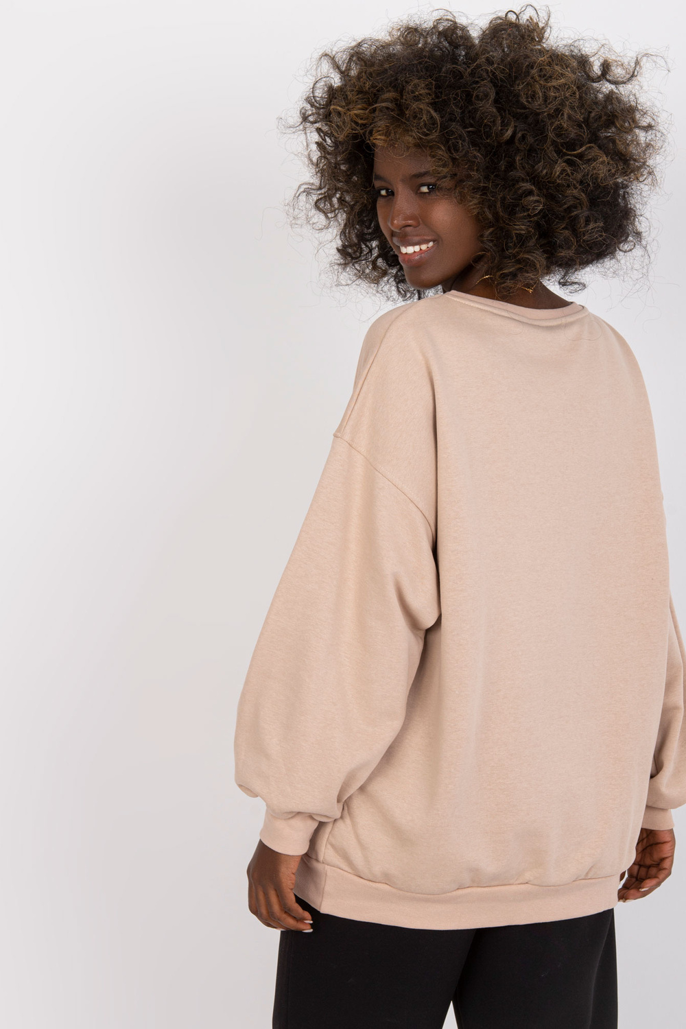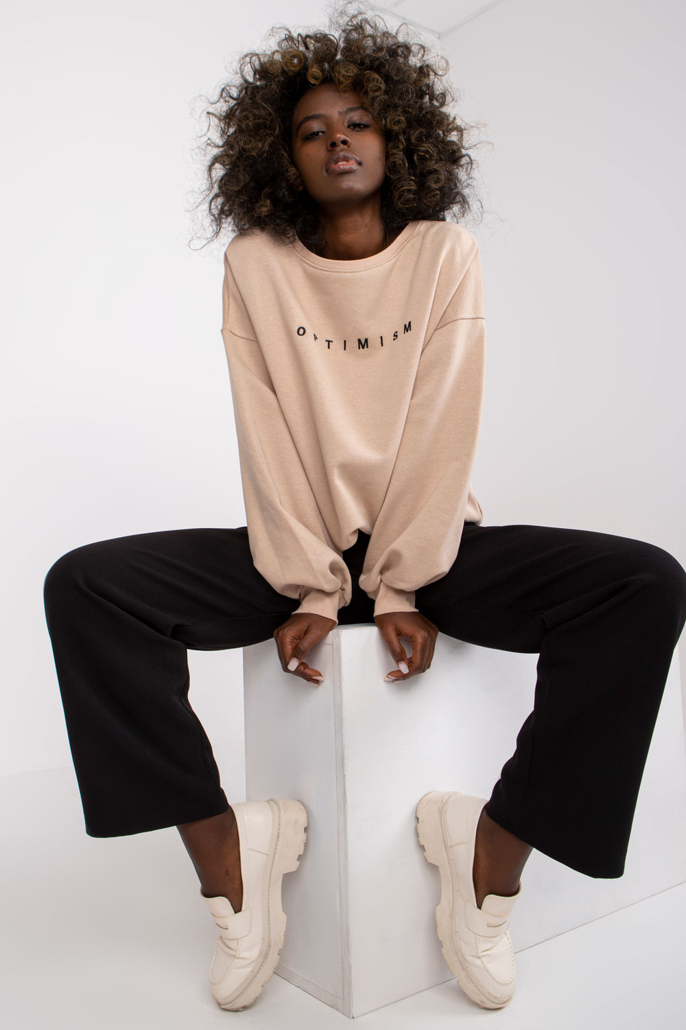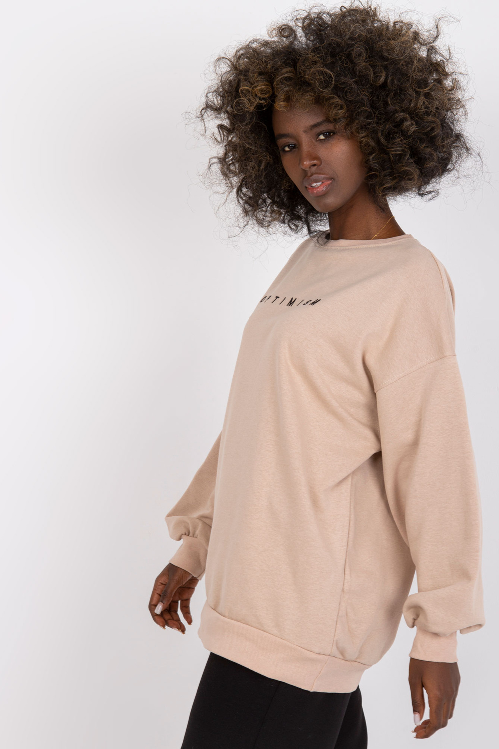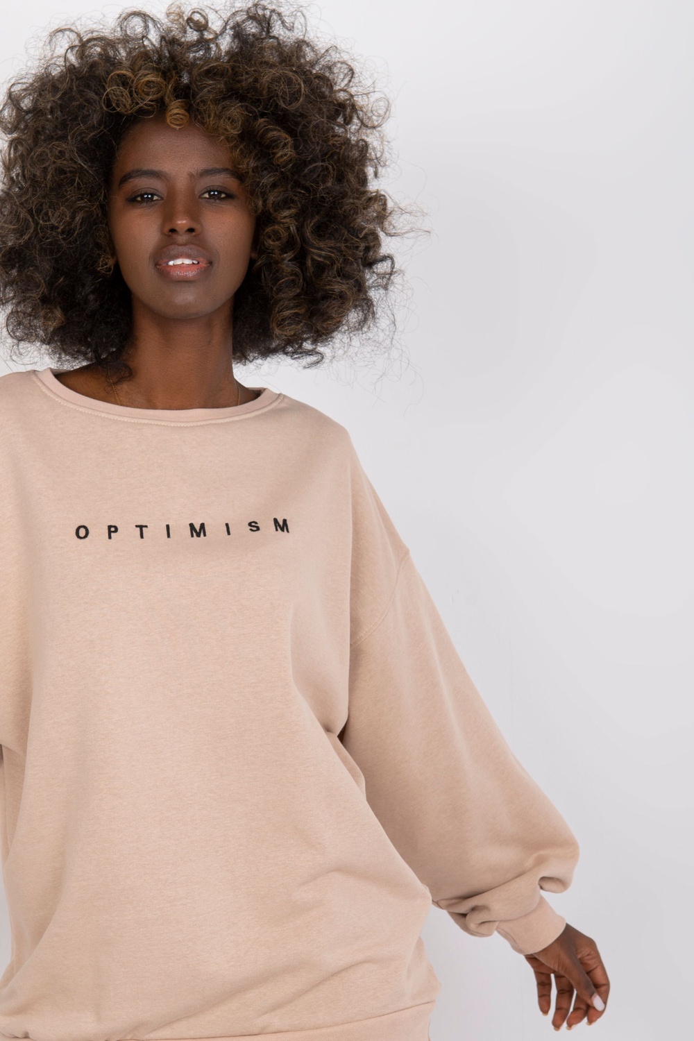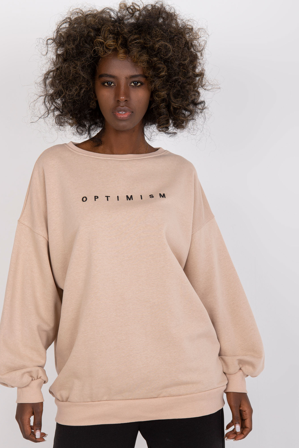 Smėlio spalvos megztinis be gobtuvo su Miley siuvinėjimu.