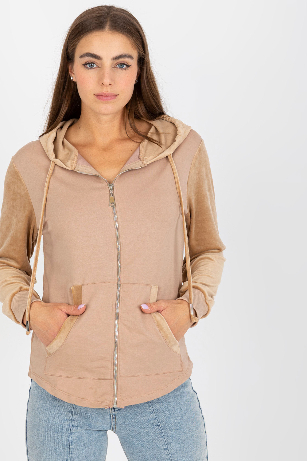 Smėlio spalvos moteriškas megztinis su veliūriniais įdėklais.