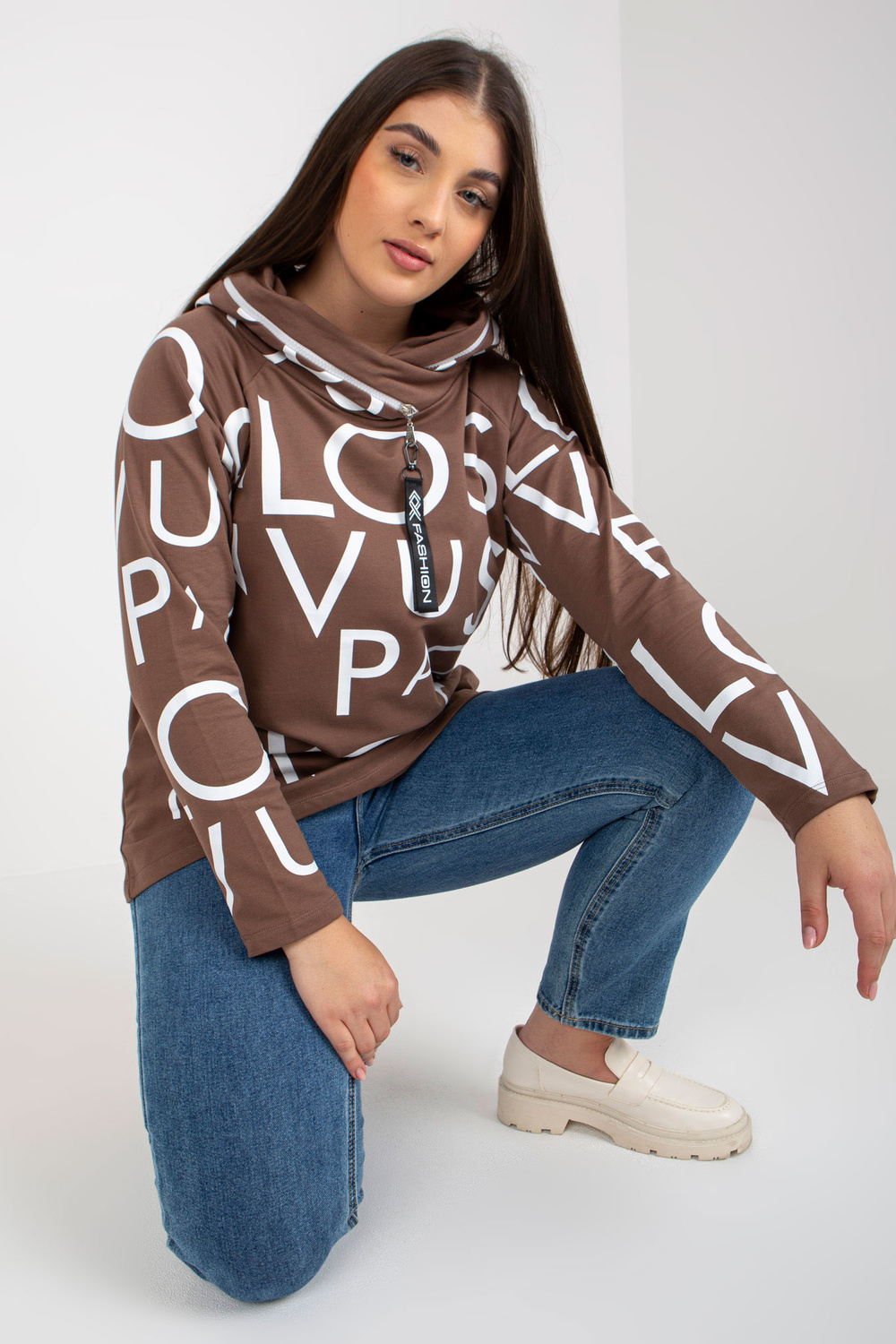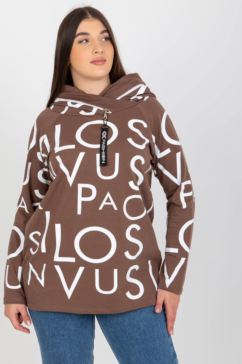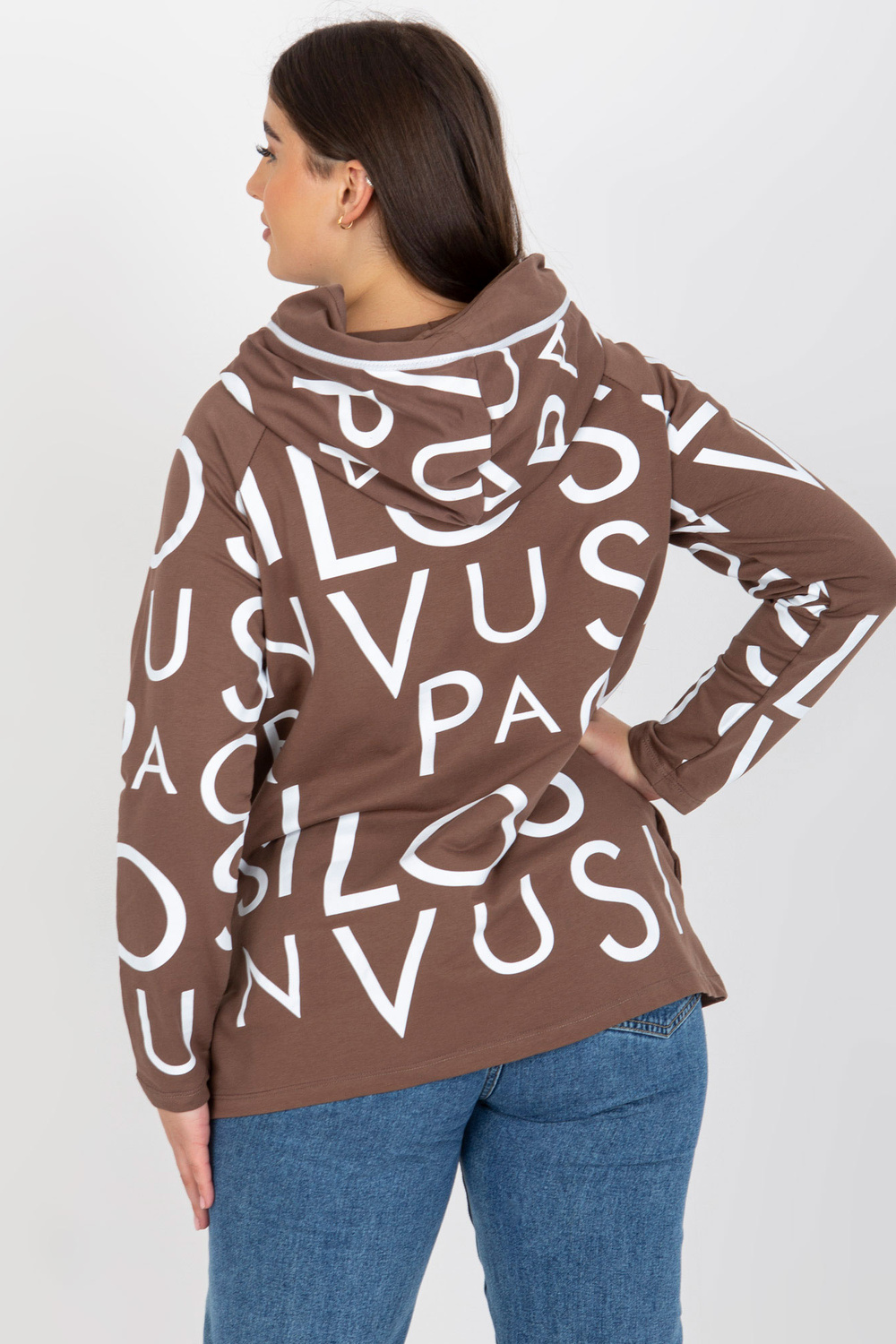 Rudos spalvos plius dydžio moteriškas megztinis su raštu ir gobtuvu.