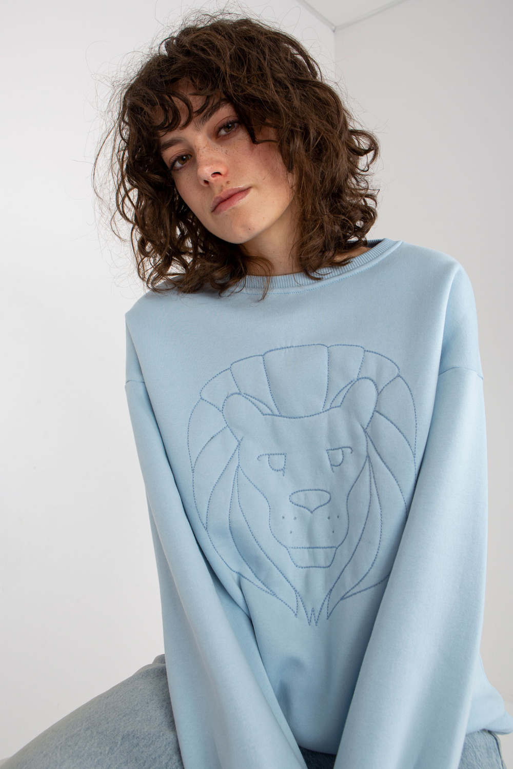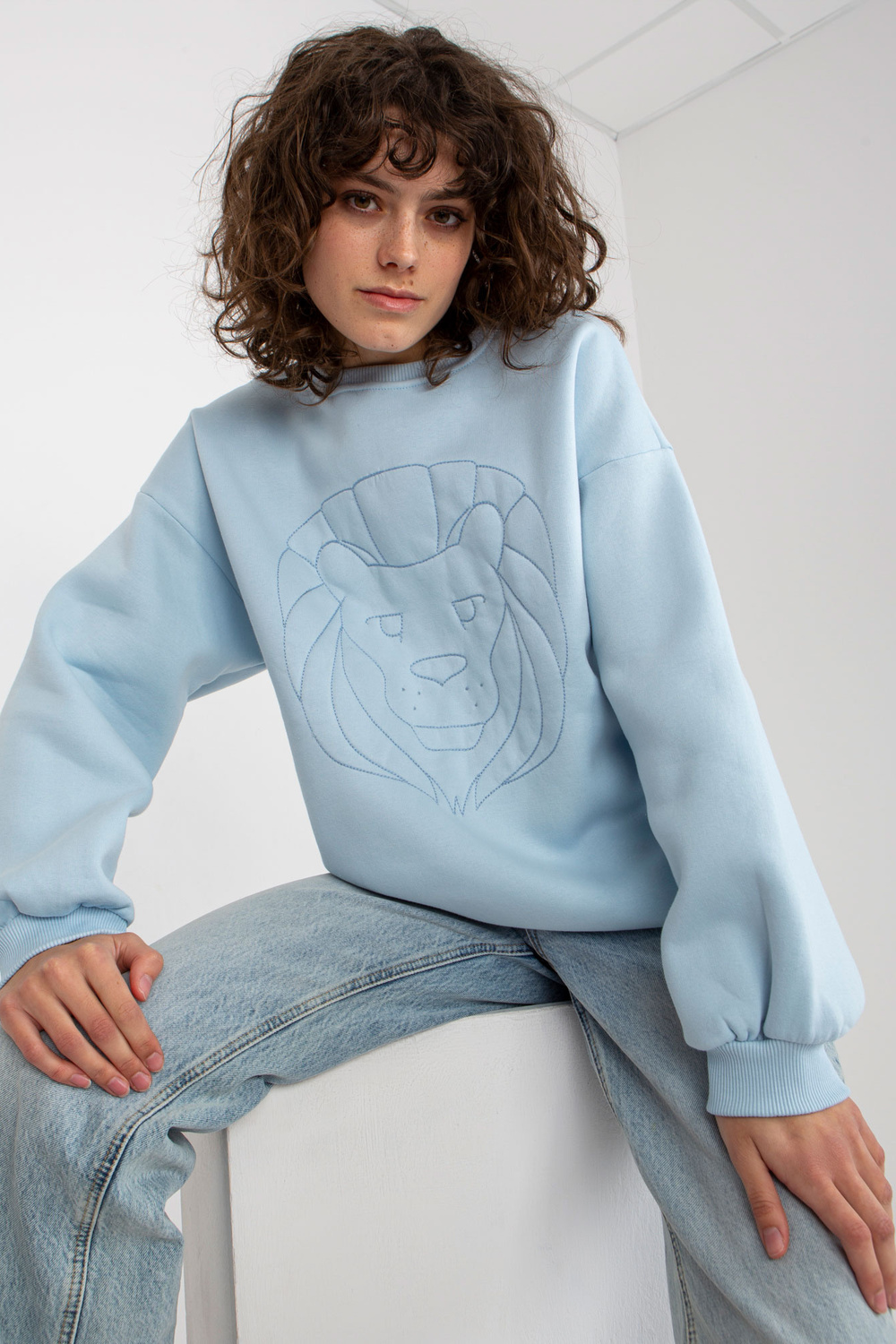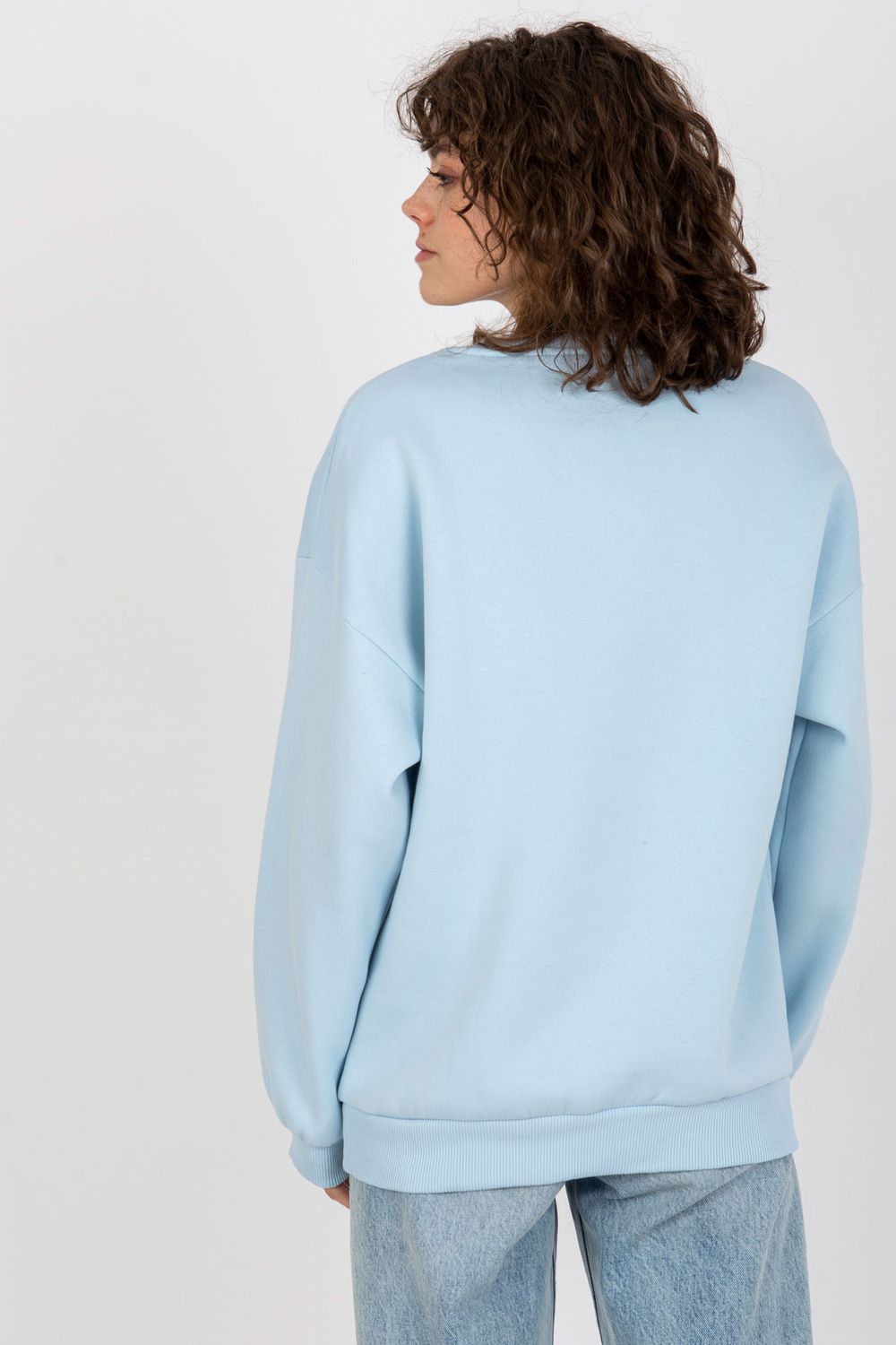 Šviesiai mėlynas megztinis be gobtuvo su siuvinėjimu.