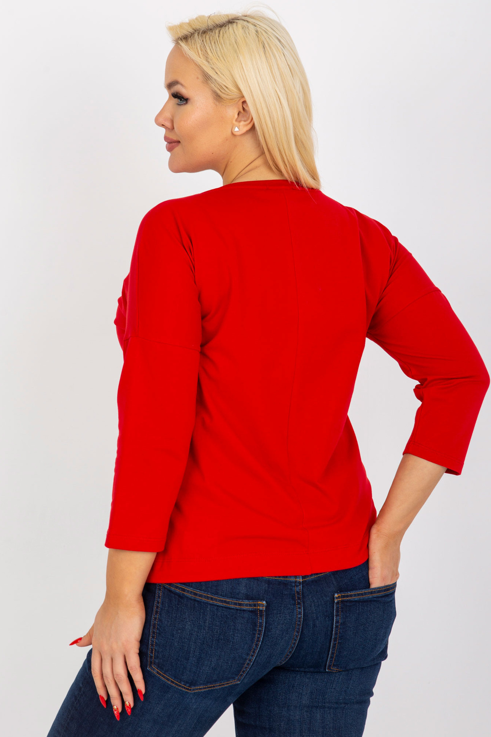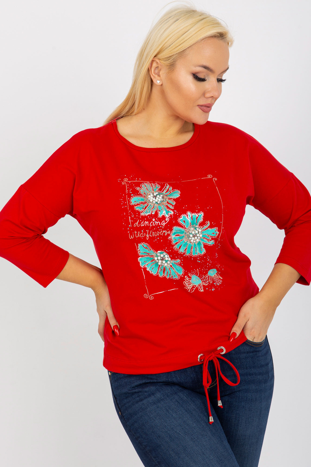 Raudona plius dydžio moteriška palaidinė su aplikacijomis ir raštais.