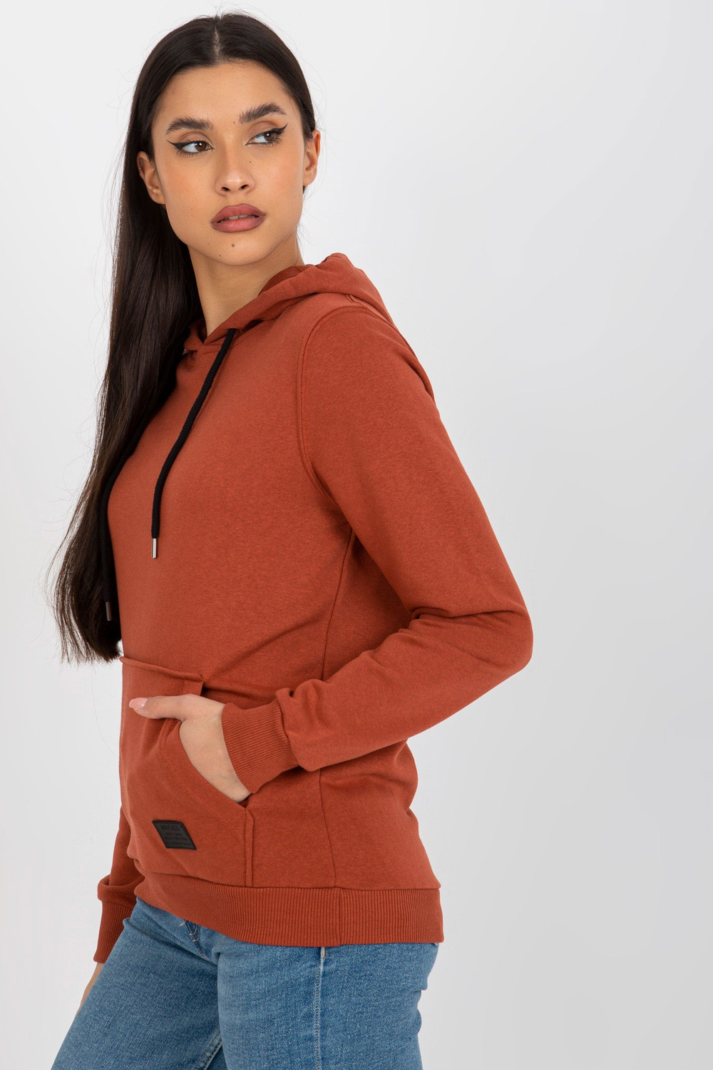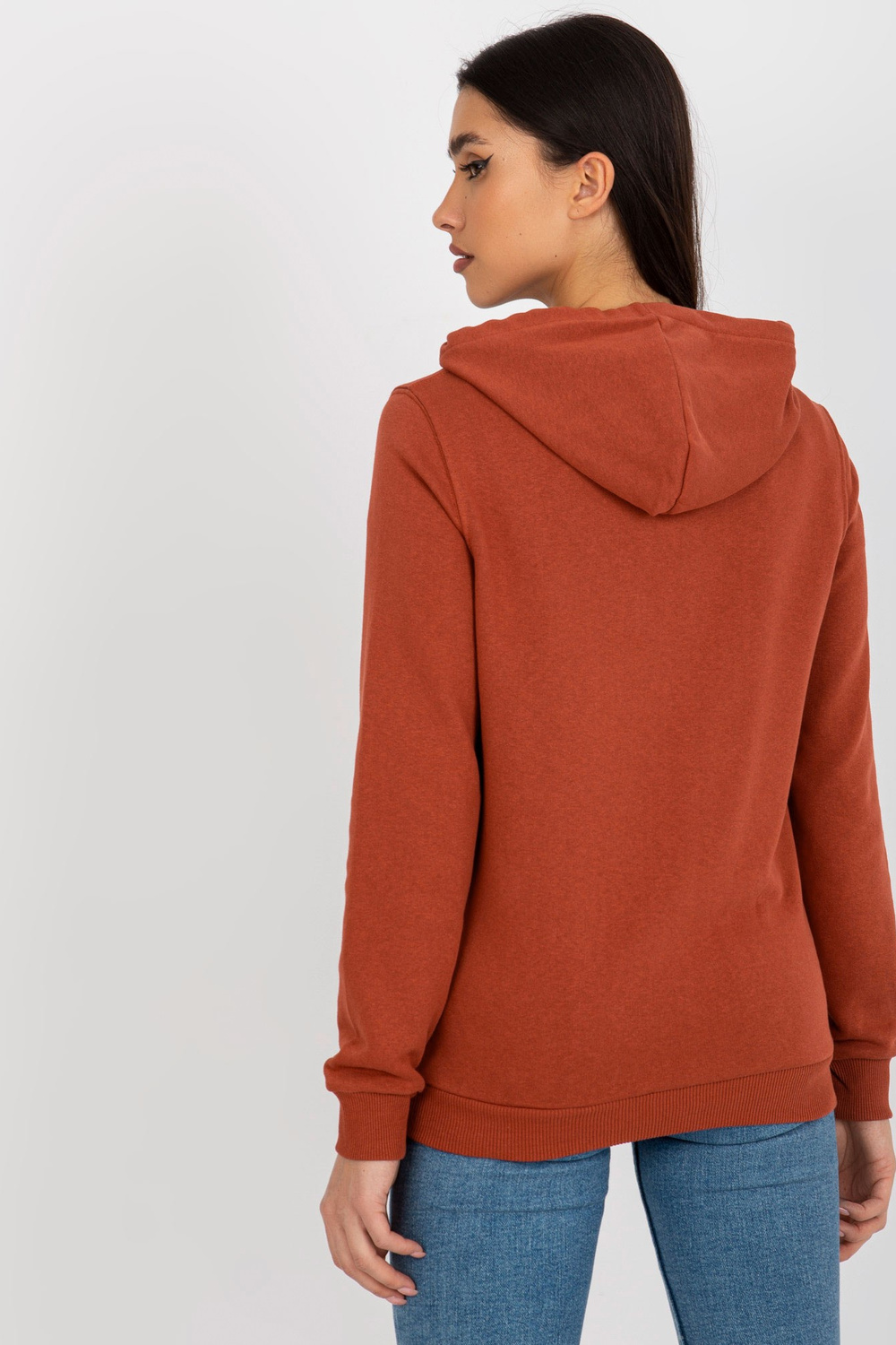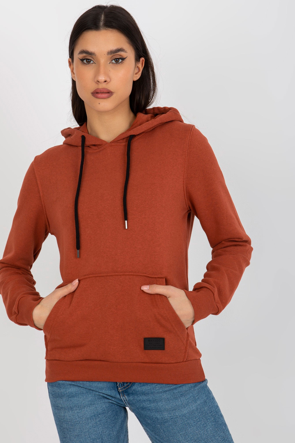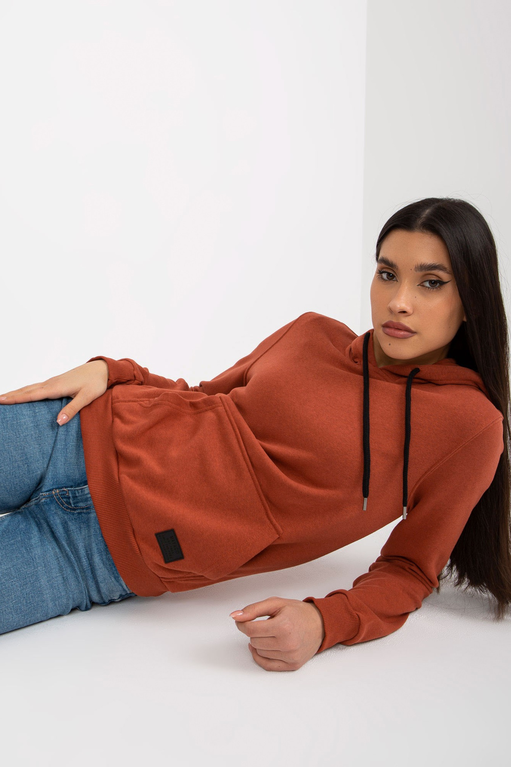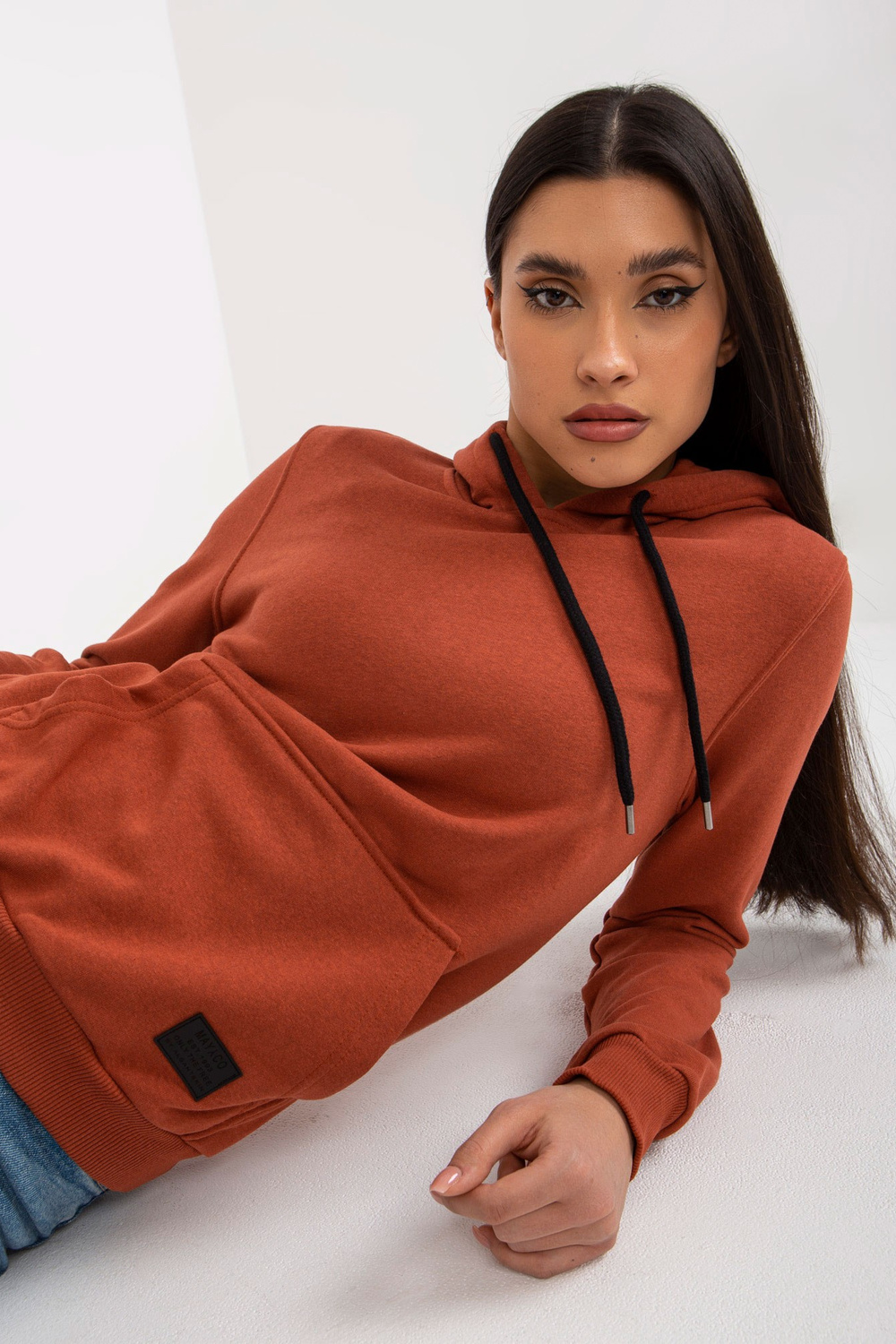 Tamsiai oranžinės spalvos medvilnės kengūros gobtuvas.